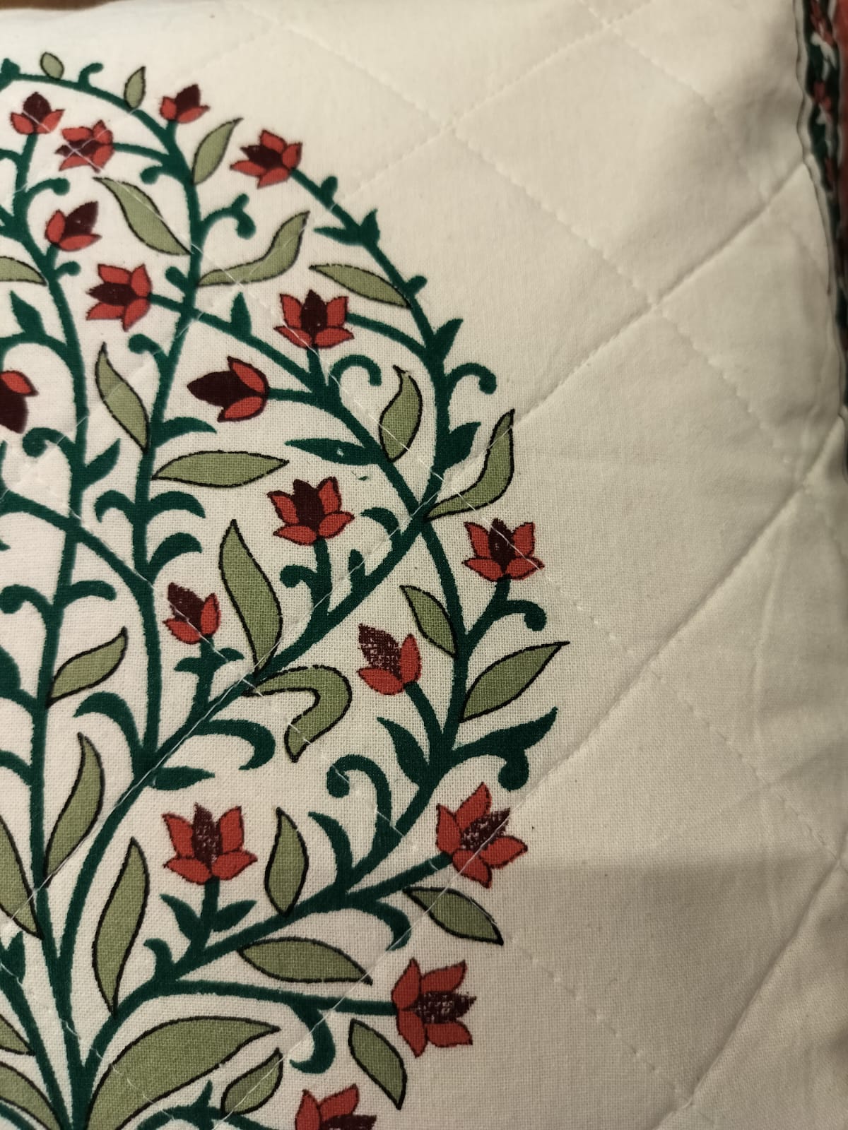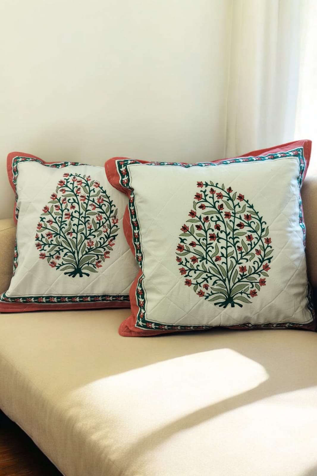 ORANGE AND WHITE LEAFY QUILTED HANDBLOCK CUSHION COVER SET OF 2