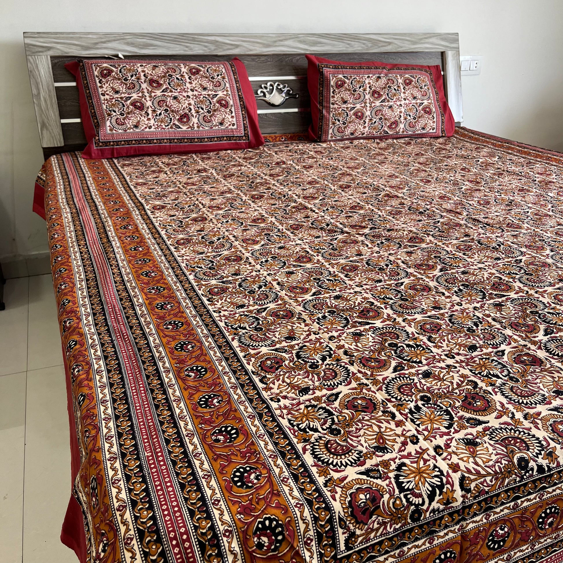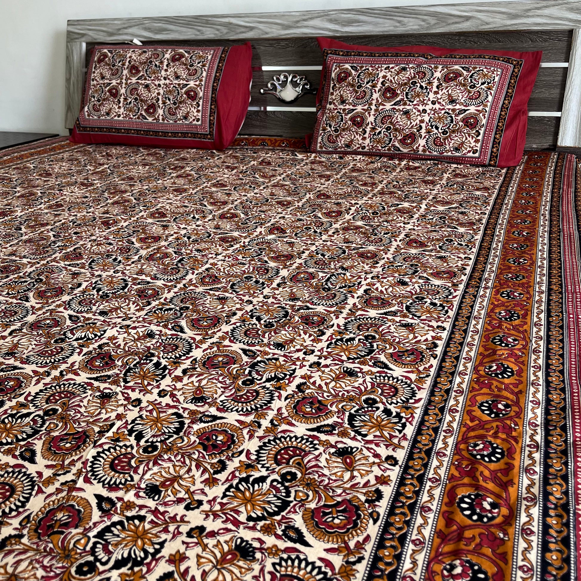 Orange Kalamkari Bedsheet with 2 Pillow covers