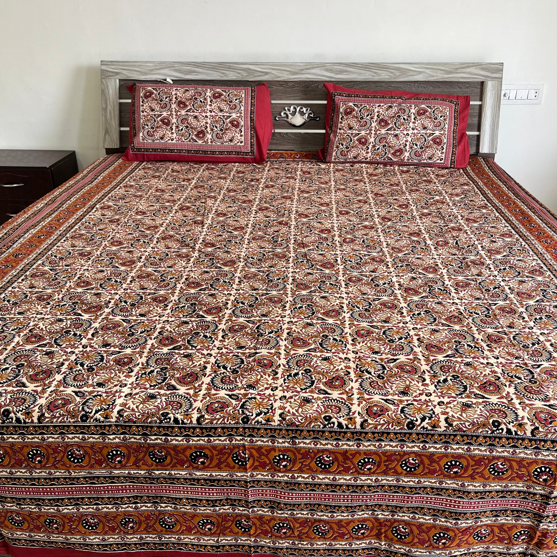 Indulge in the beauty of traditional craftsmanship with this vibrant and elegant bedsheet set, ideal for enhancing your bedroom aesthetics or gifting your loved ones. Experience comfort, culture, and creativity in every thread!