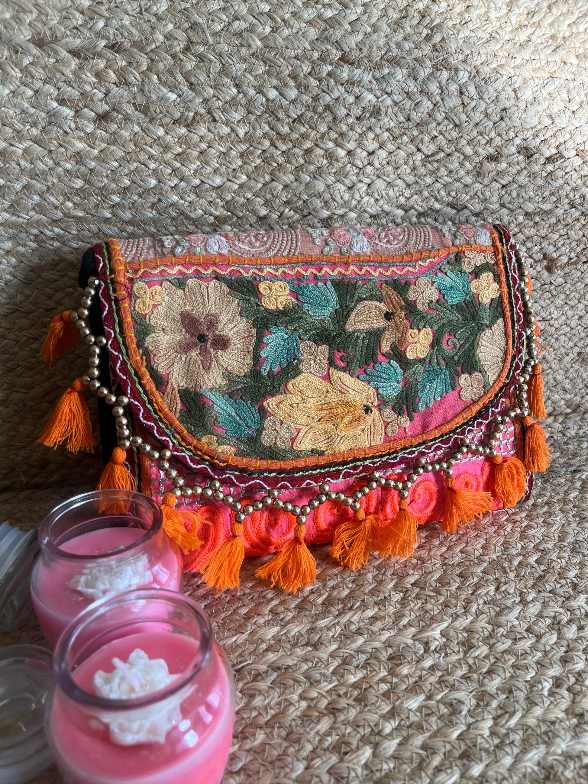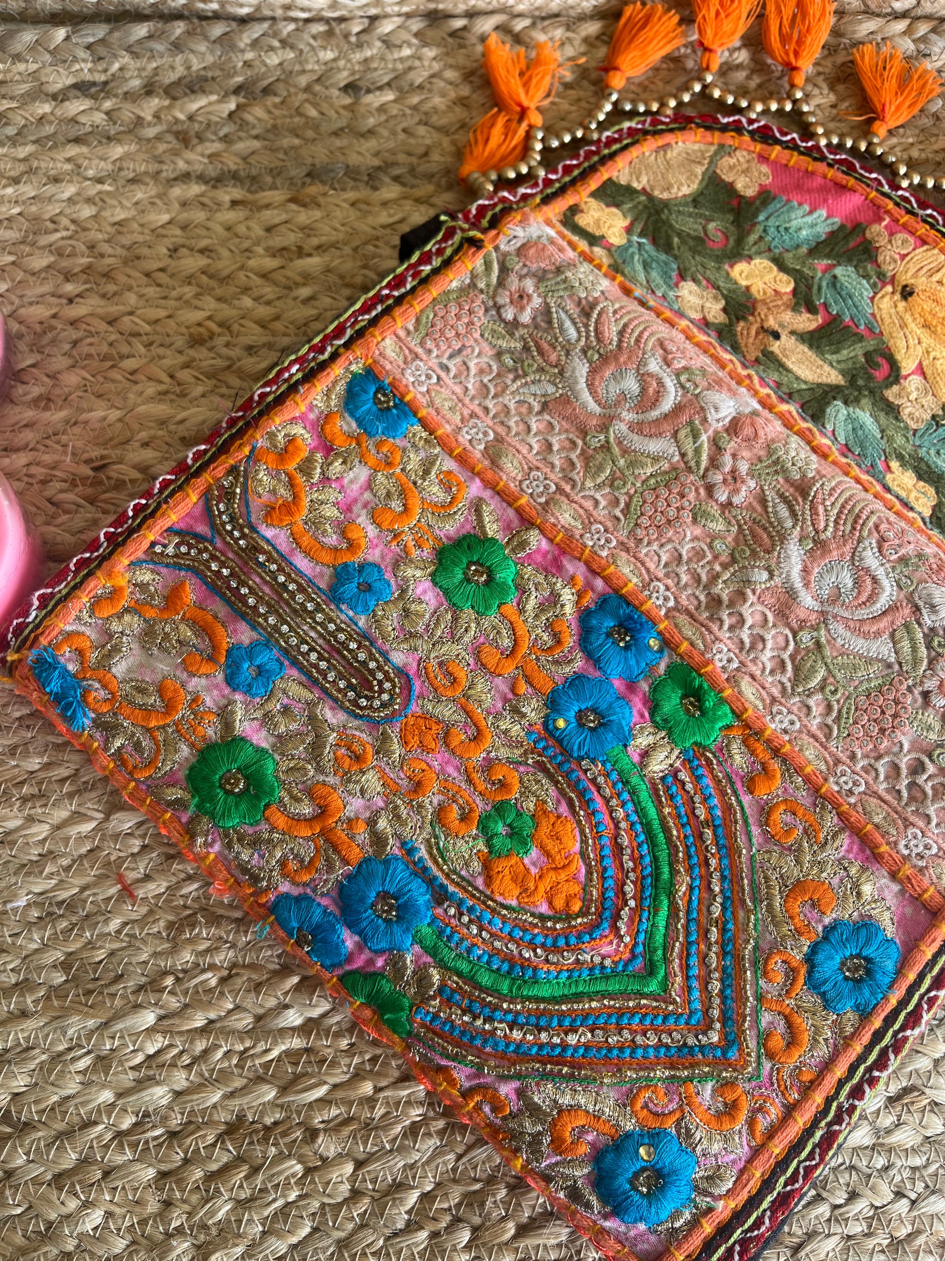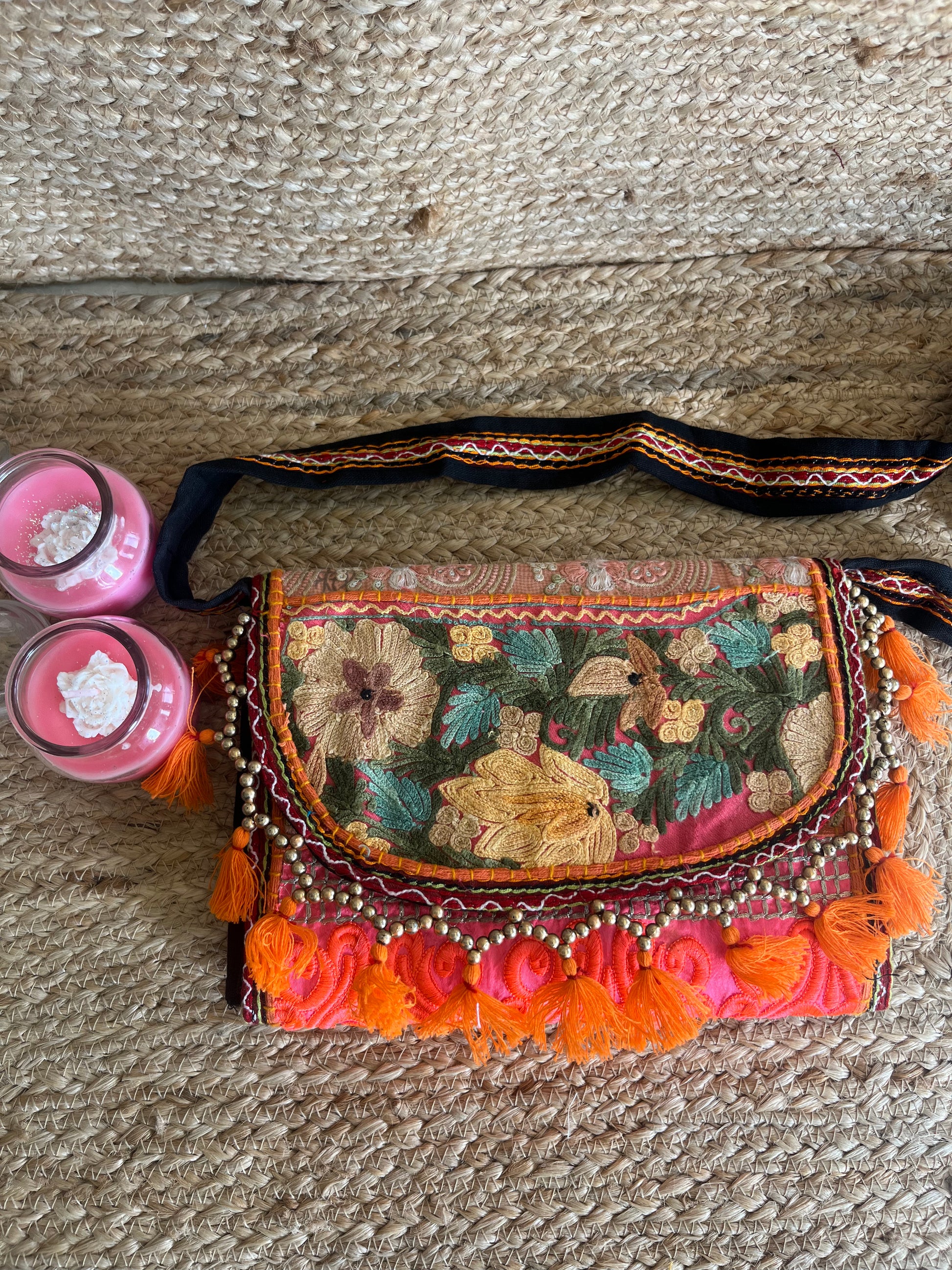 Orange Multi-Color Hand Embroidered Patchwork Sling Bag
