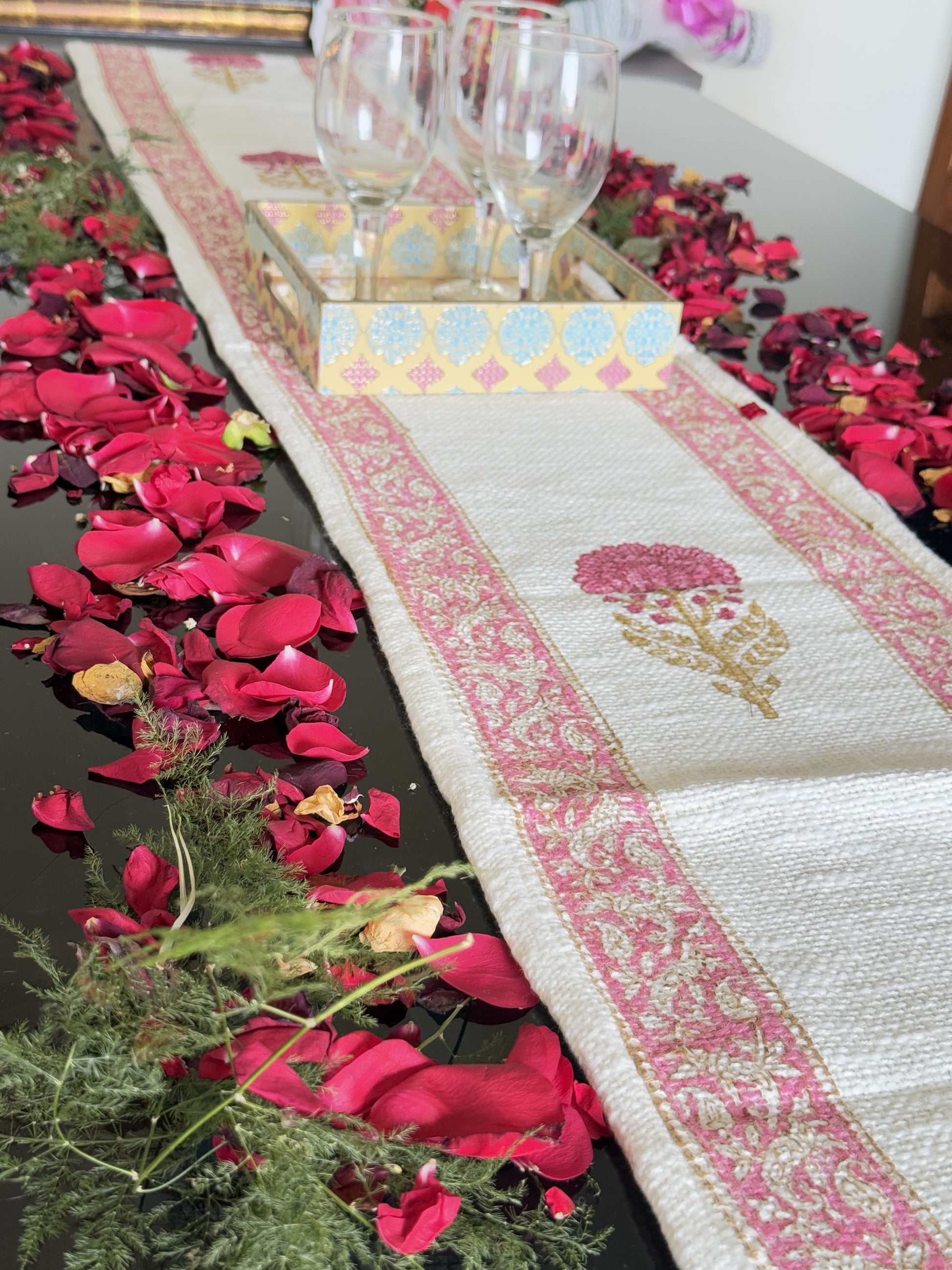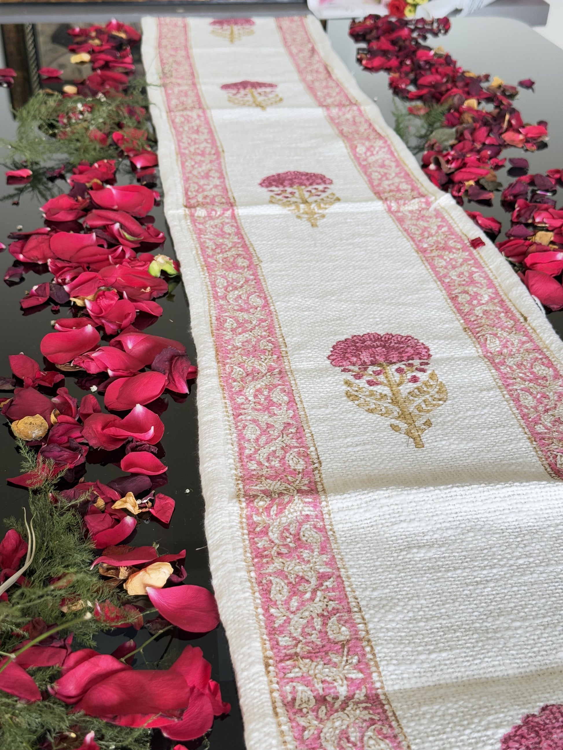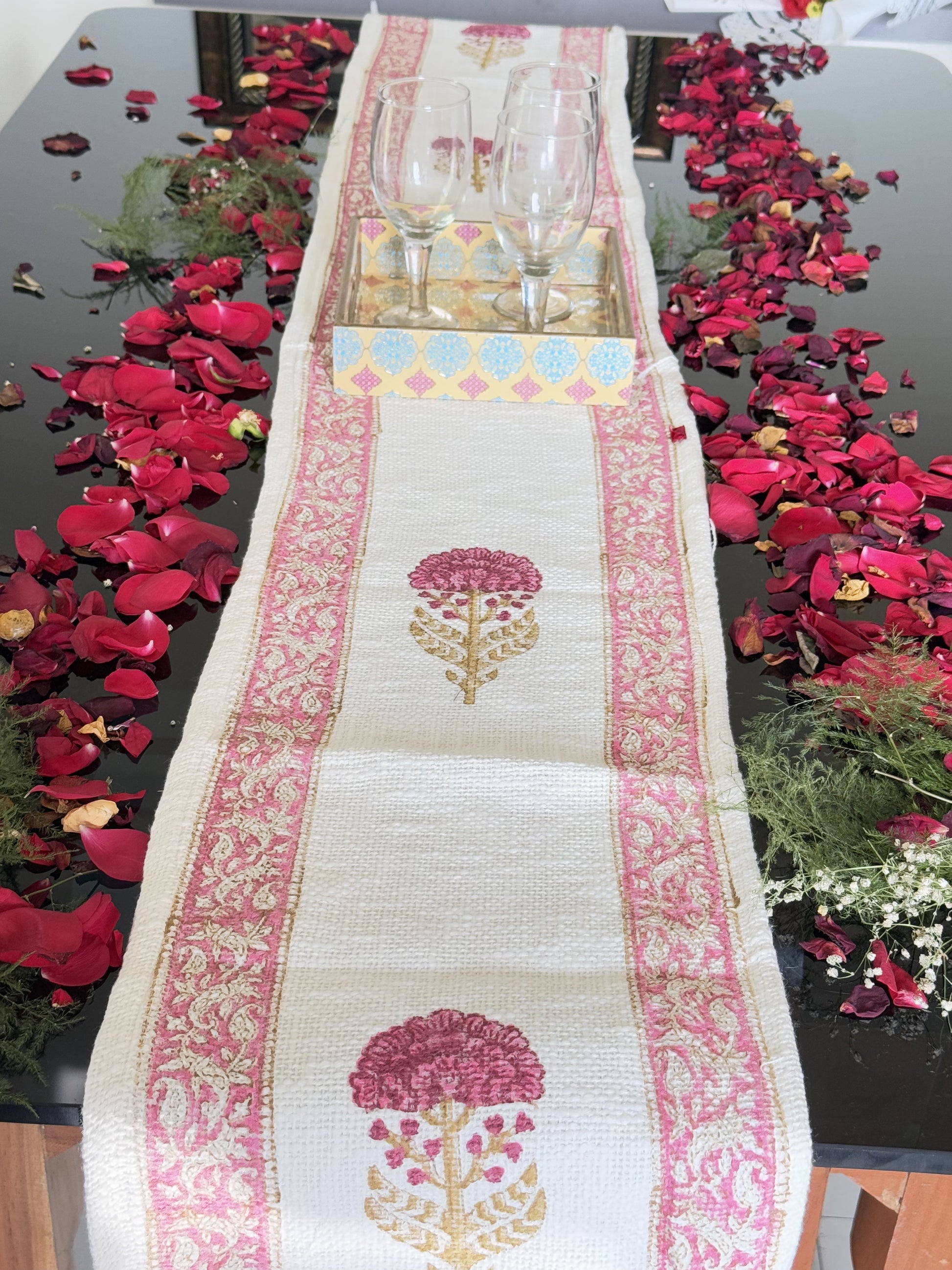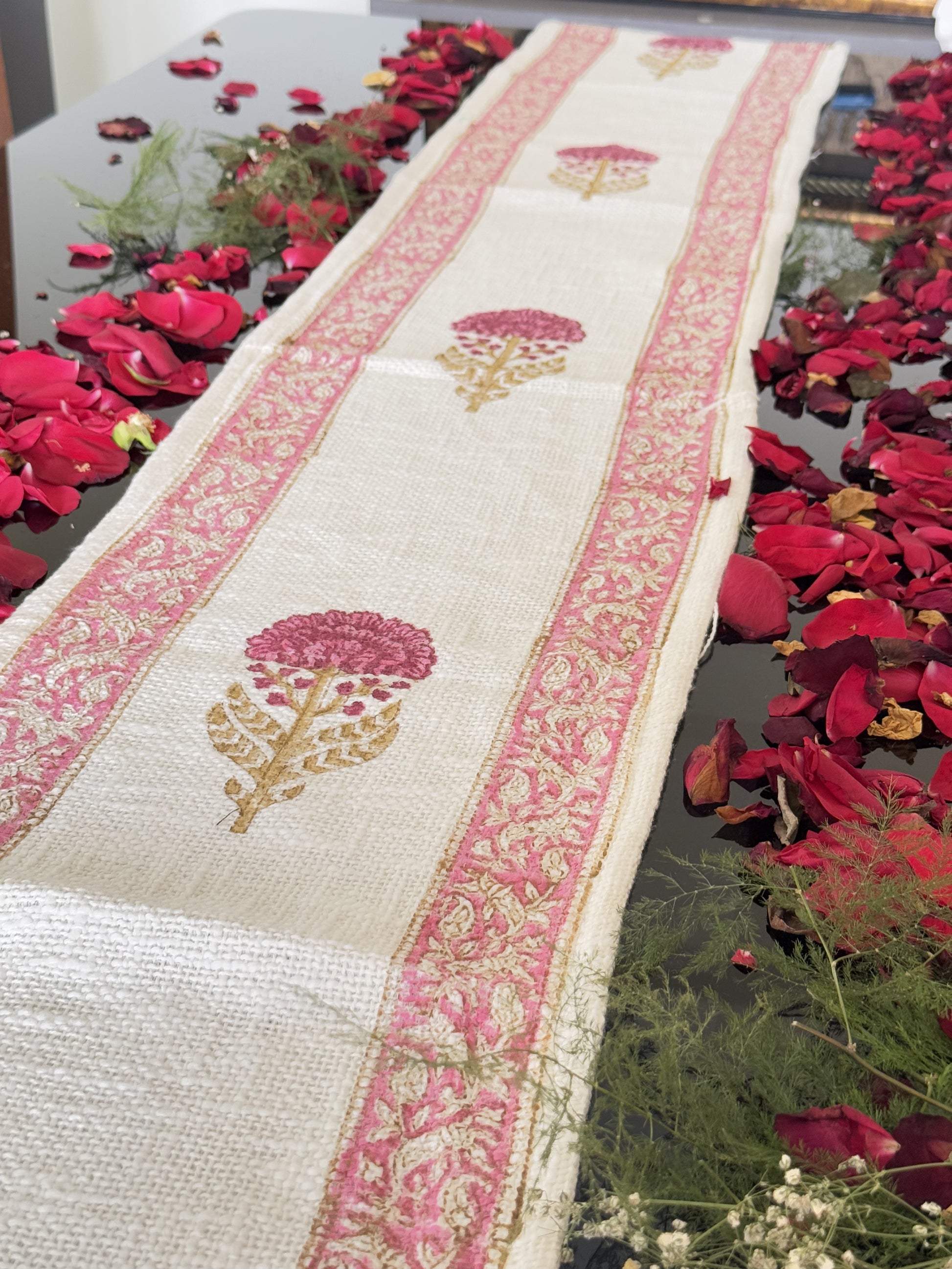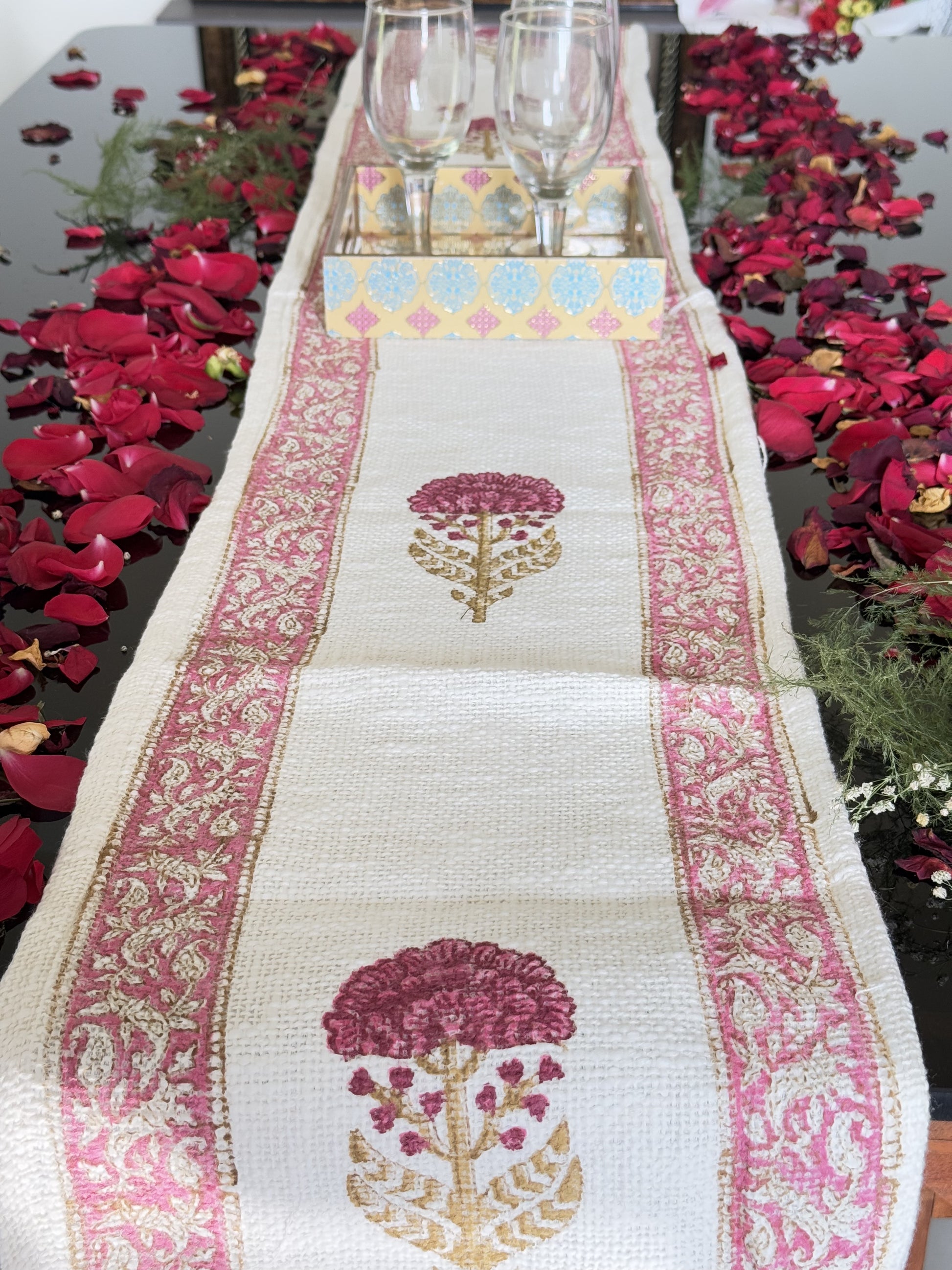 Pink Single Flower with Boarder Handblock Premium Jute Table Runner