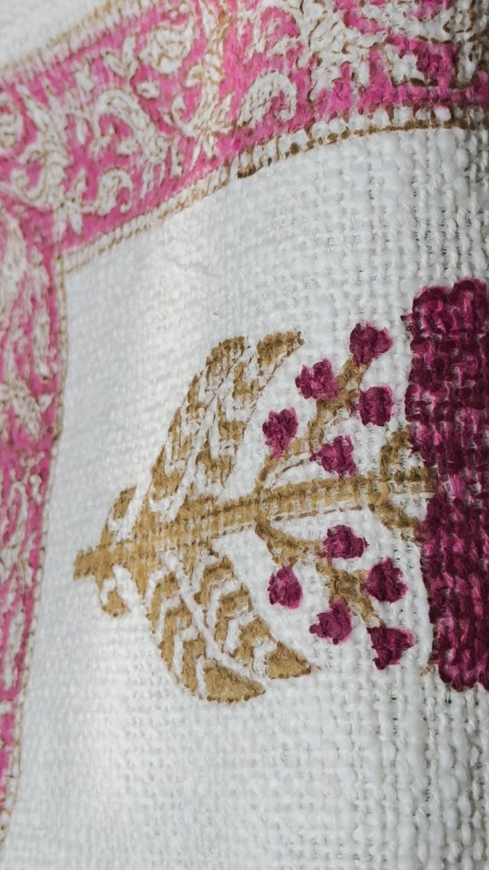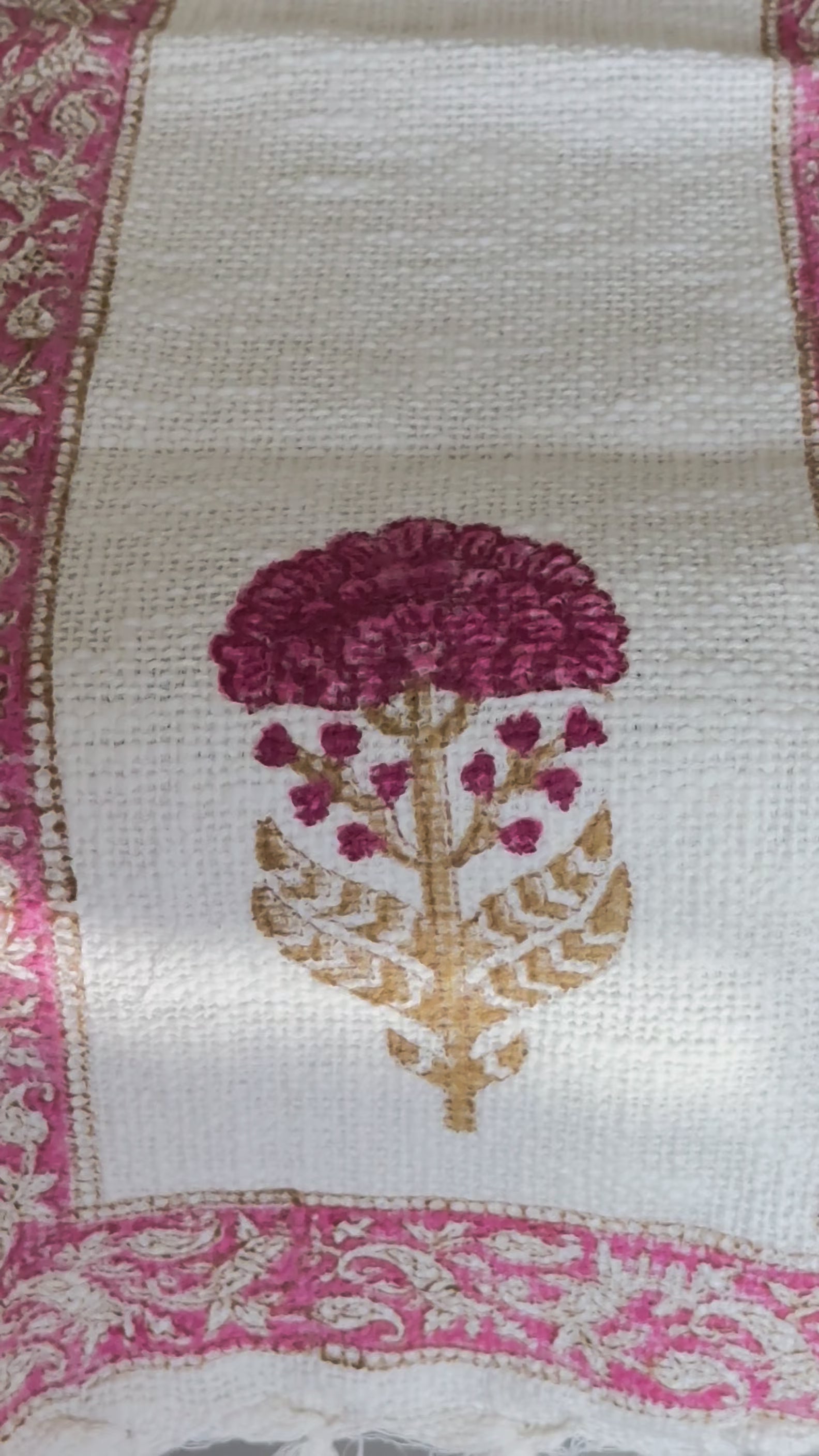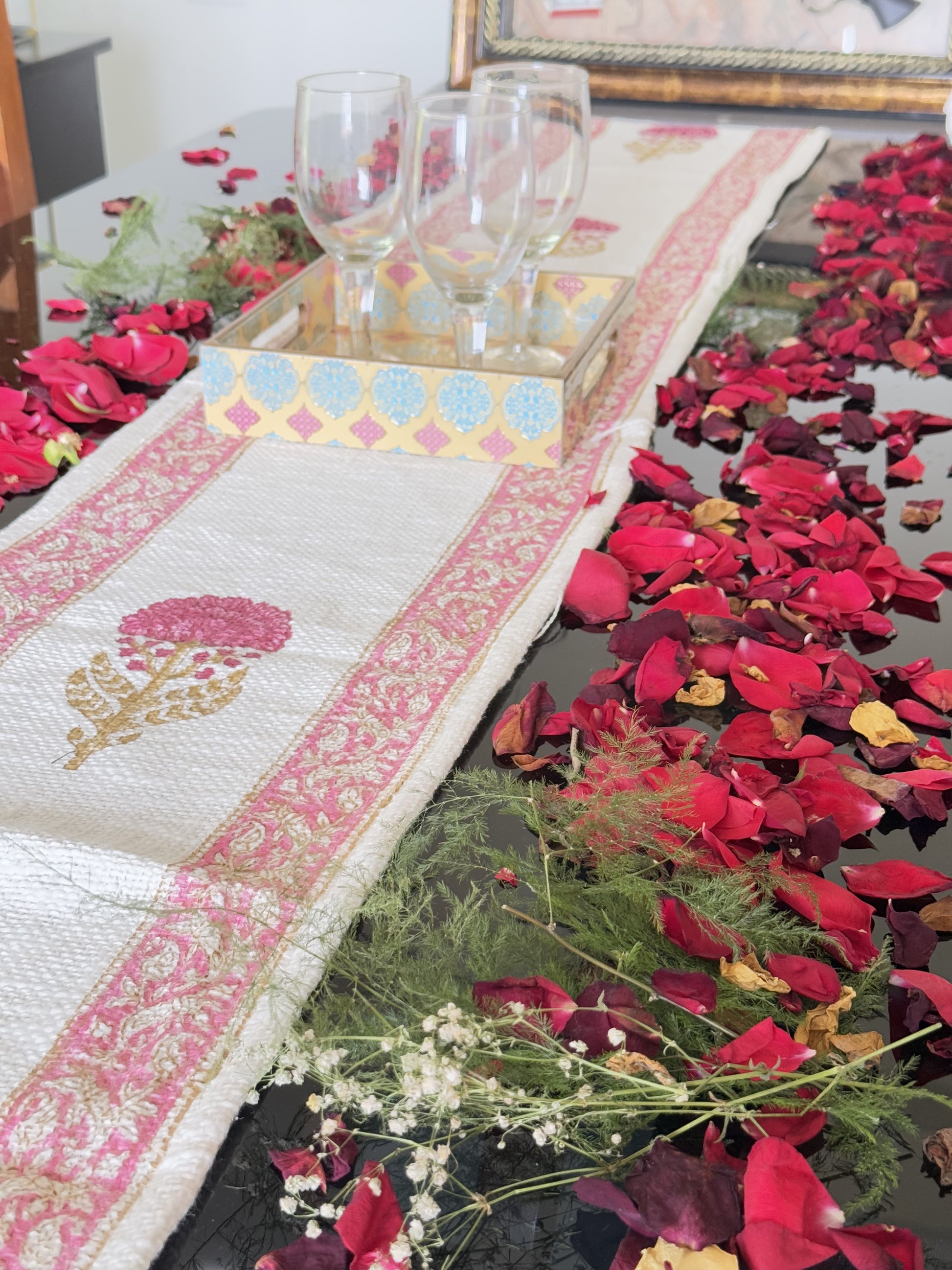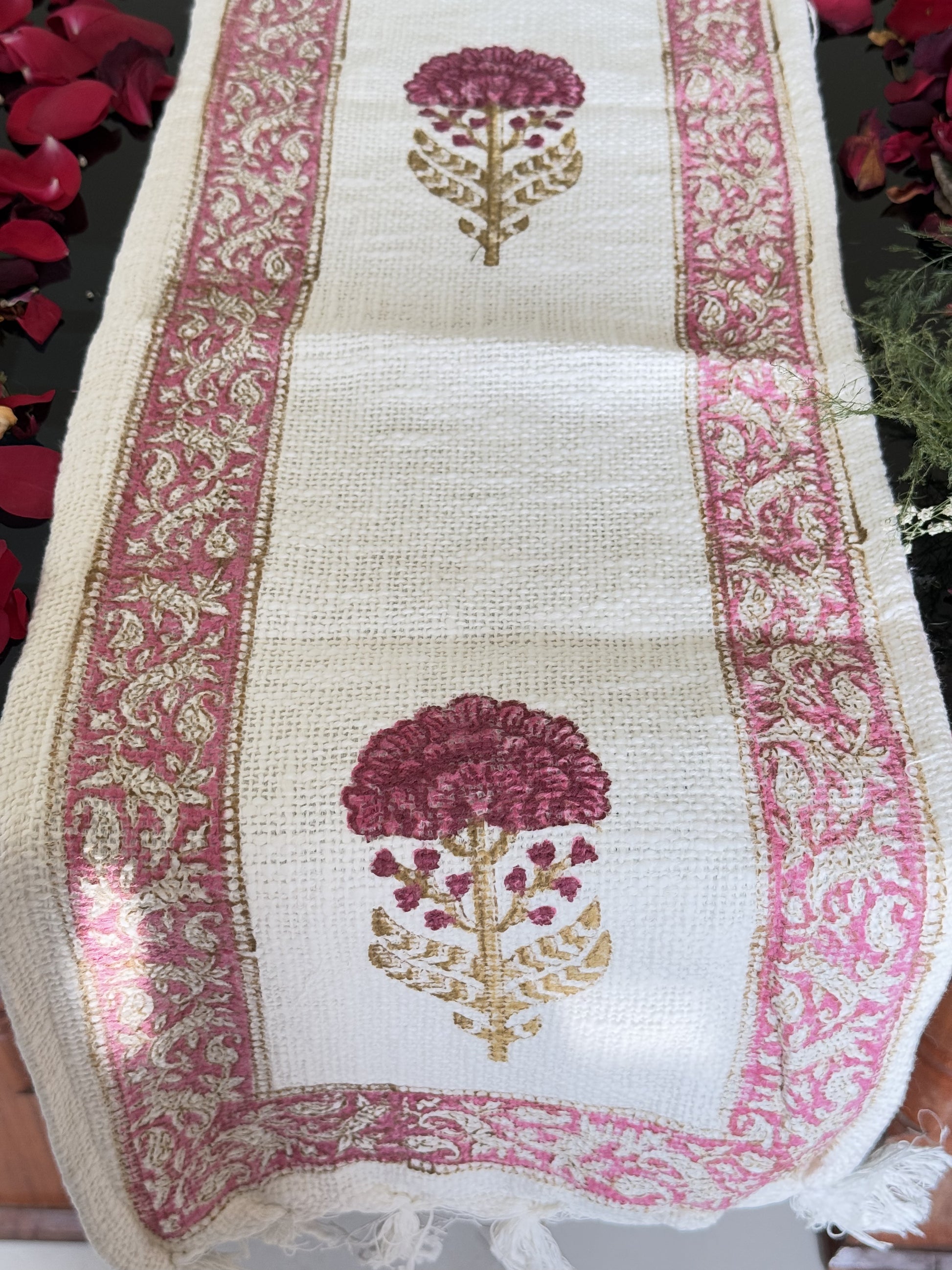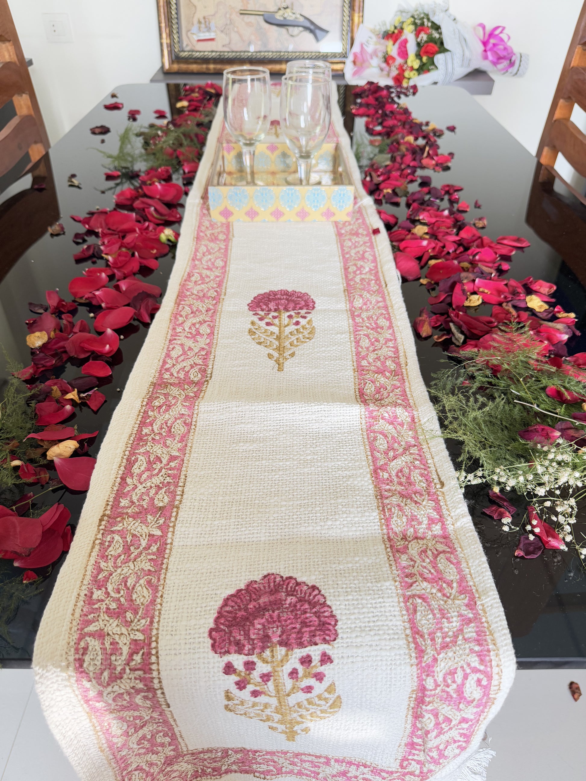 Pink Single Flower with Boarder Handblock Premium Jute Table Runner