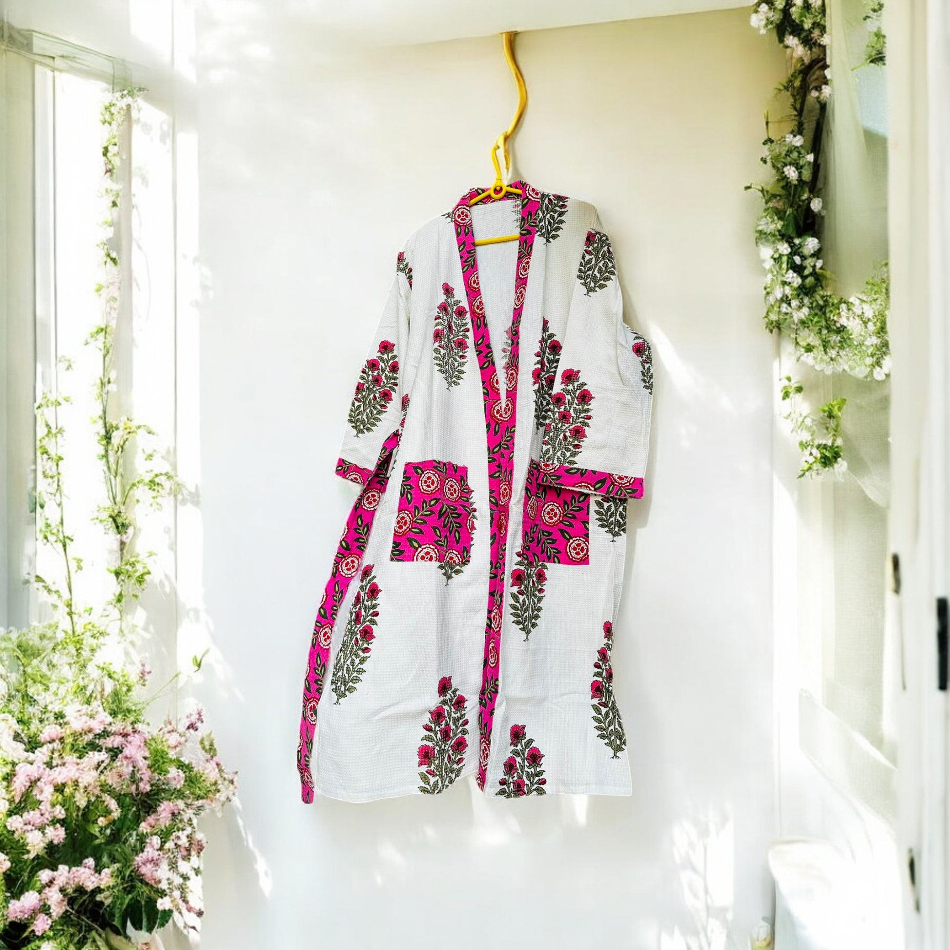 Pink and Black Floral White Handblock Bathrobe – 100% Cotton, Stylish and Comfortable