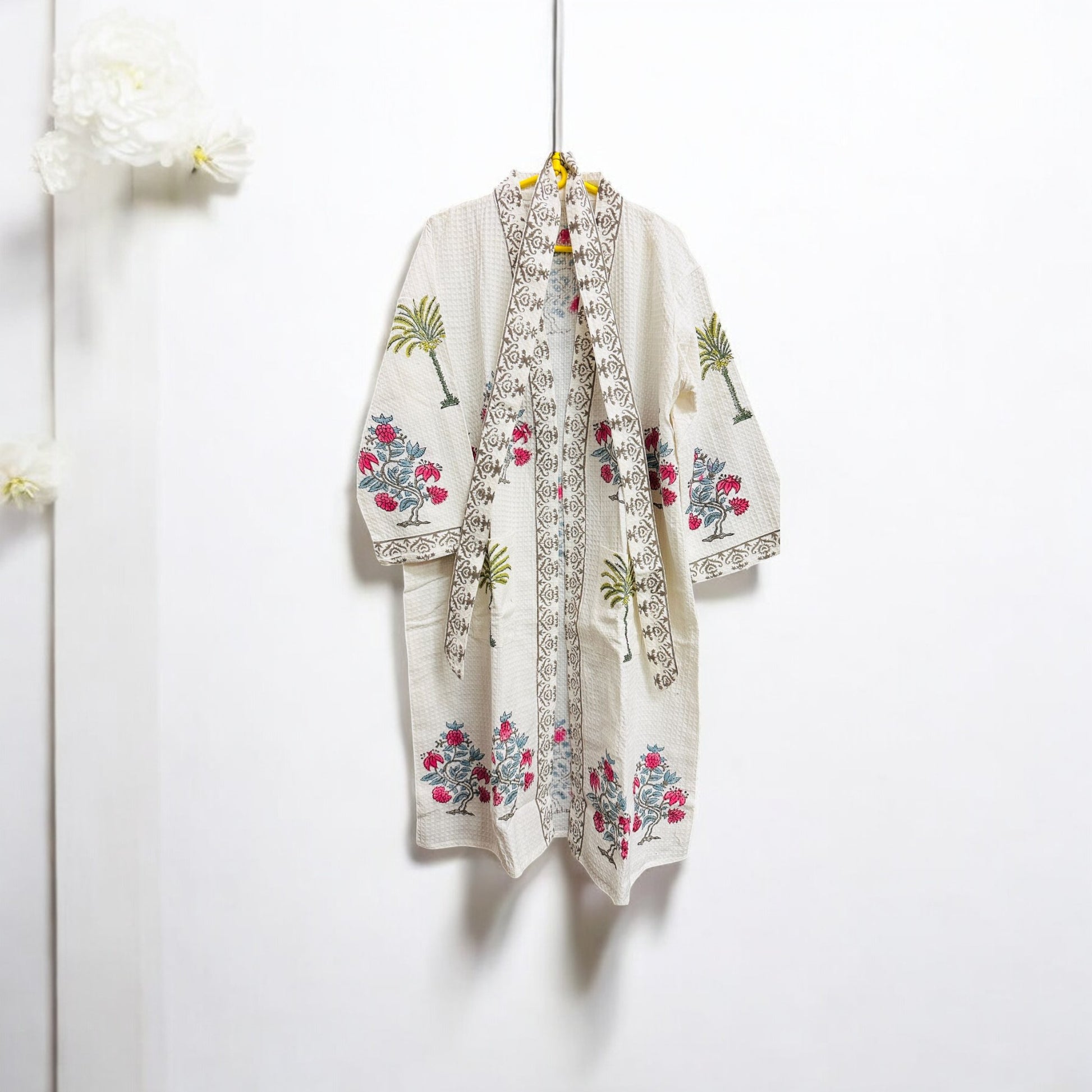 Pink Floral Palm Tree Design White Handblock Bathrobe – 100% Cotton, Elegant and Comfortable