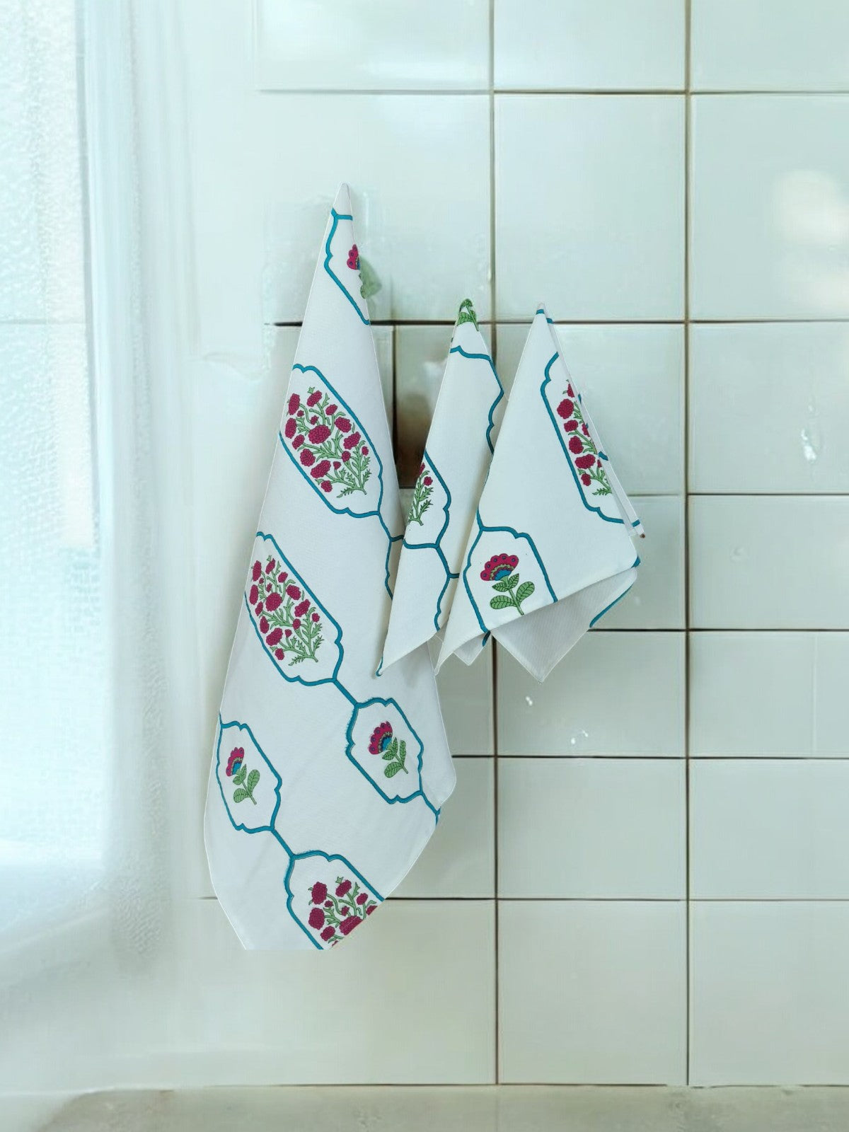 Pink Floral White Handblock Towel Set – 3-Piece Soft Cotton Towels for Bath and Hand Use