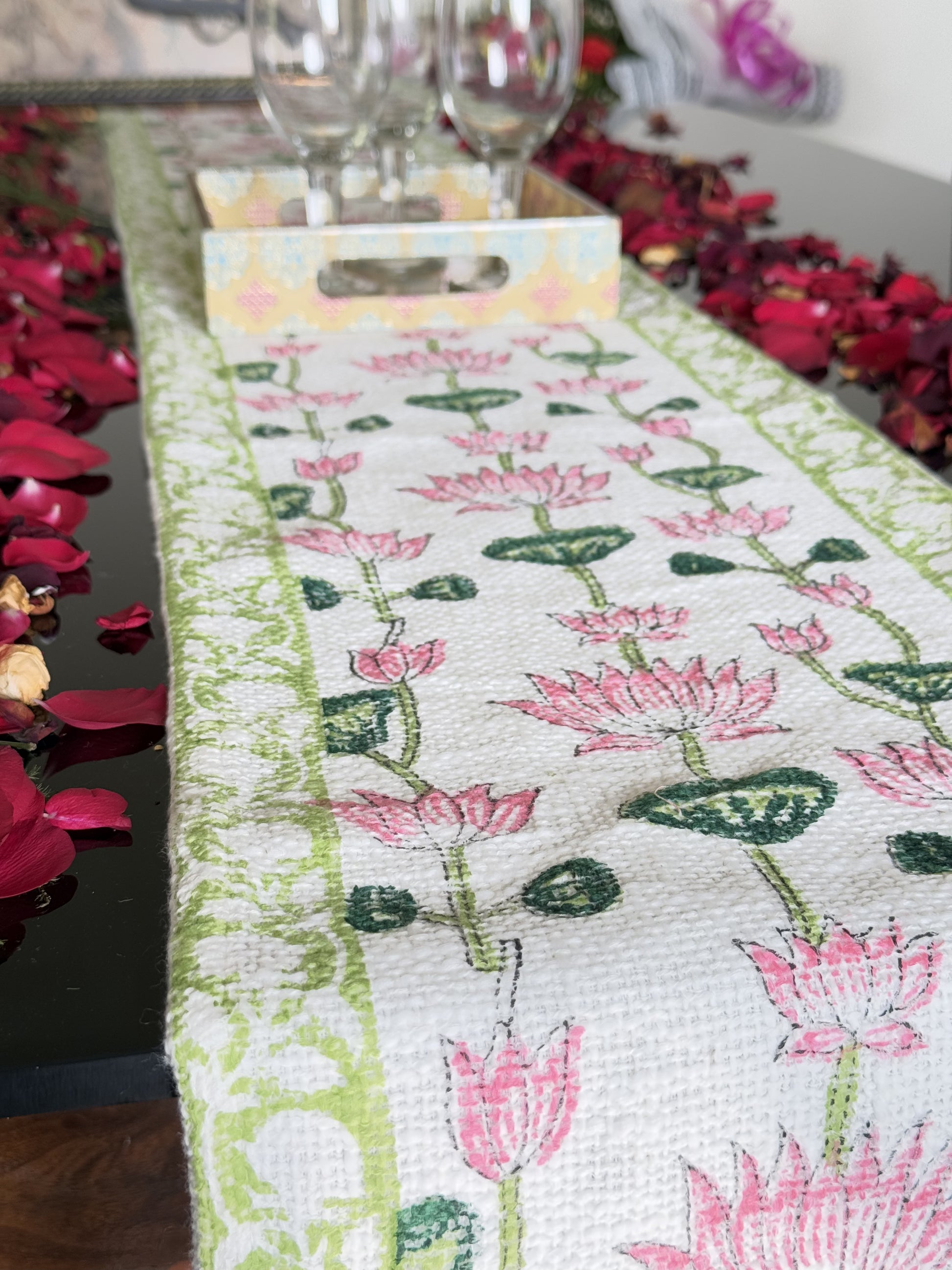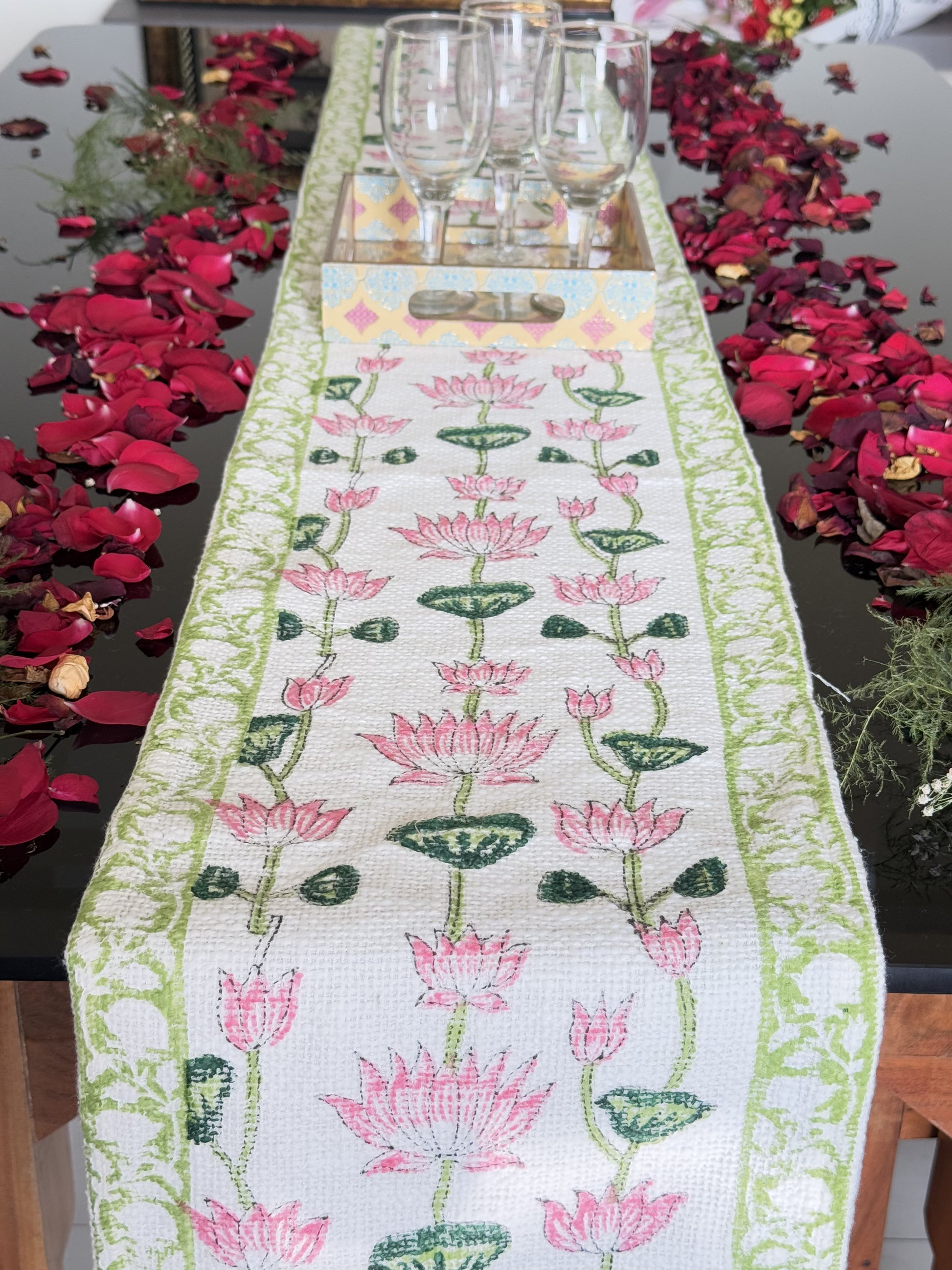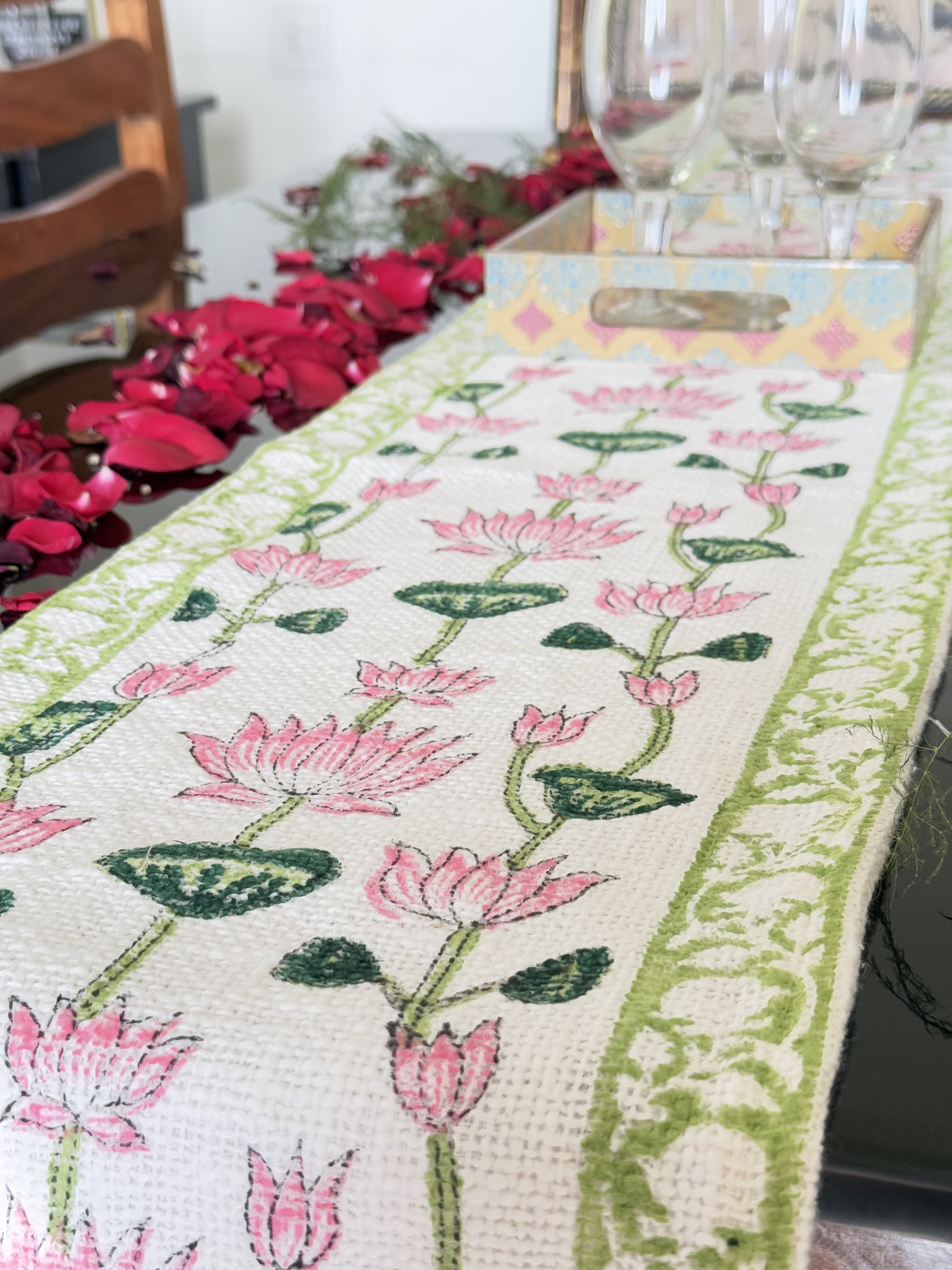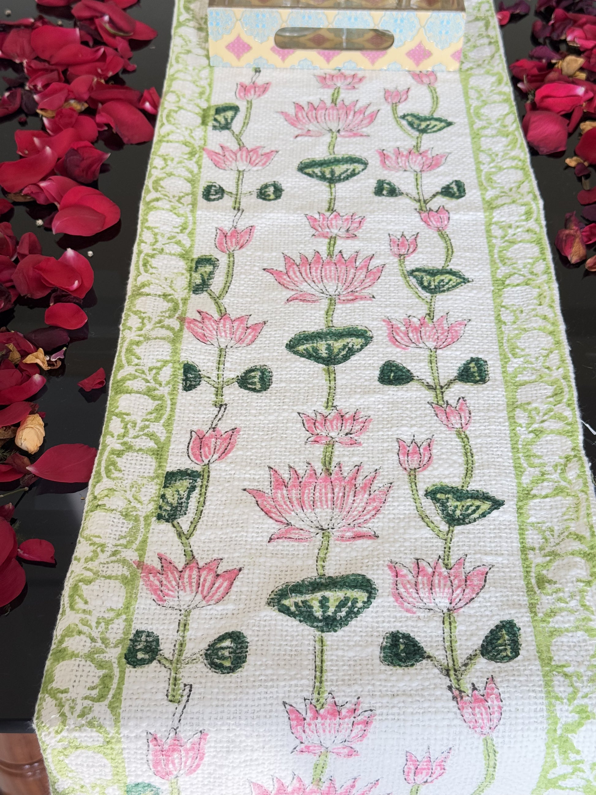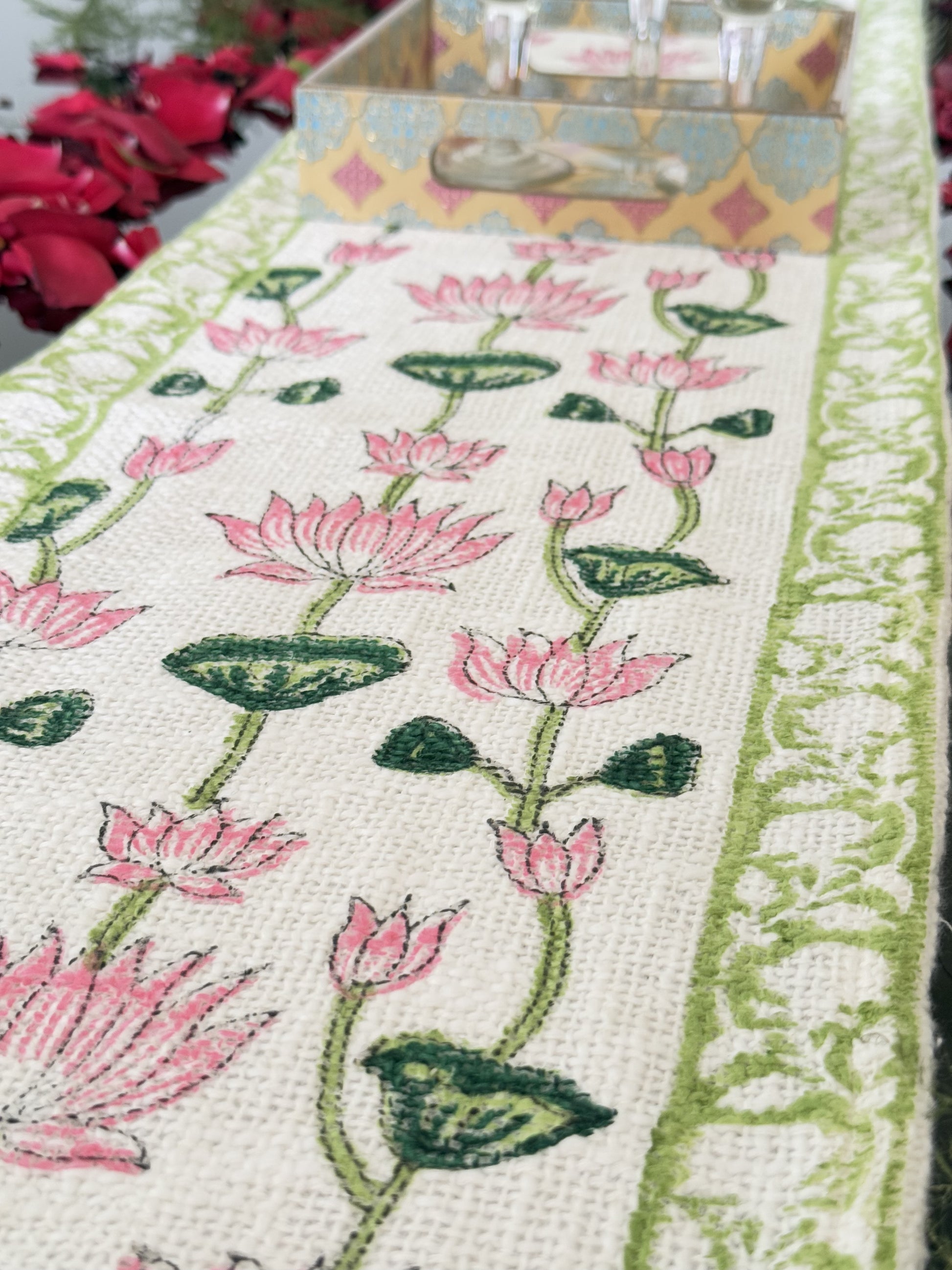 Pink Lotus Handblock Jute Runner – Artisan Craftsmanship from Rajasthan