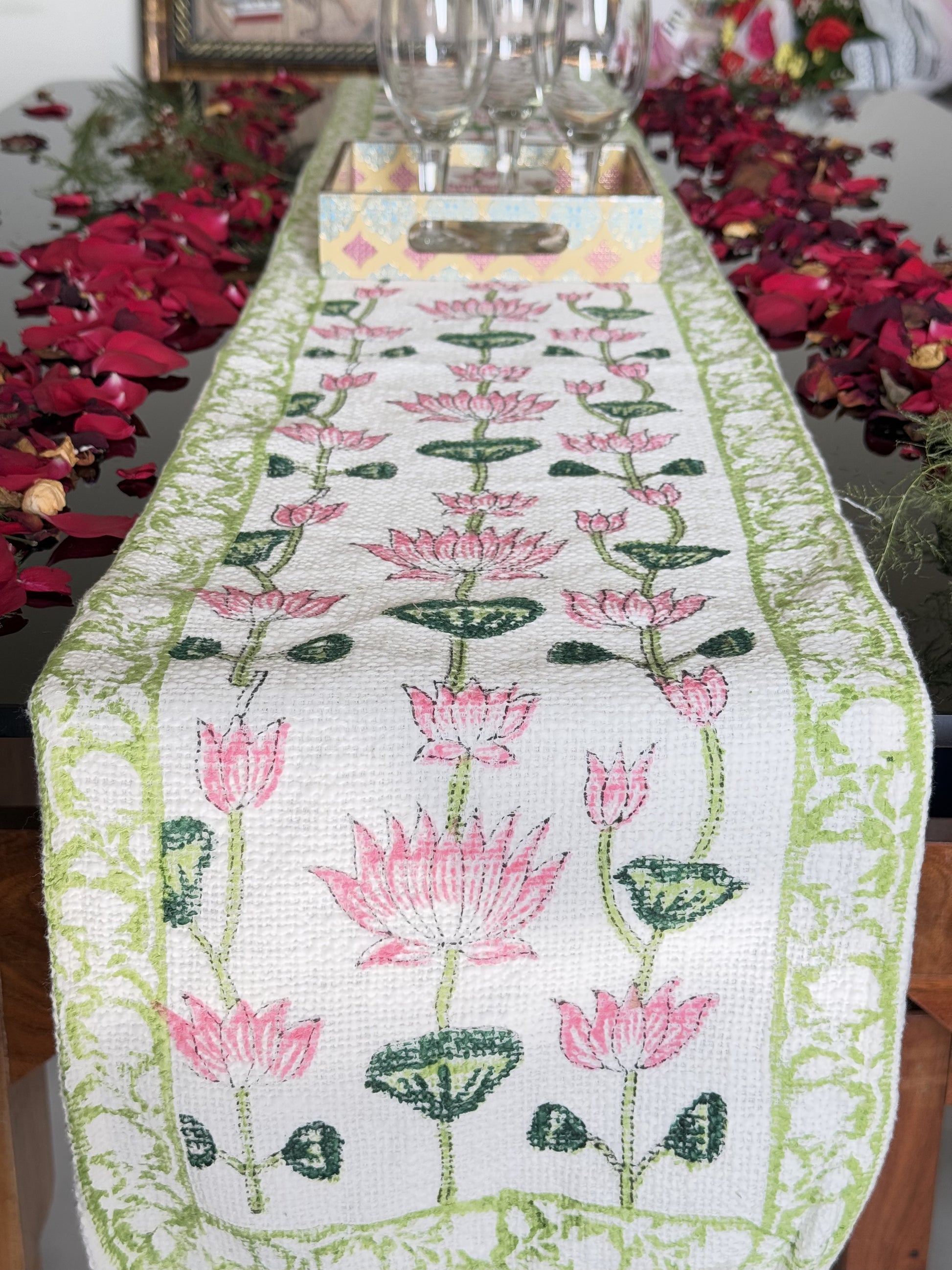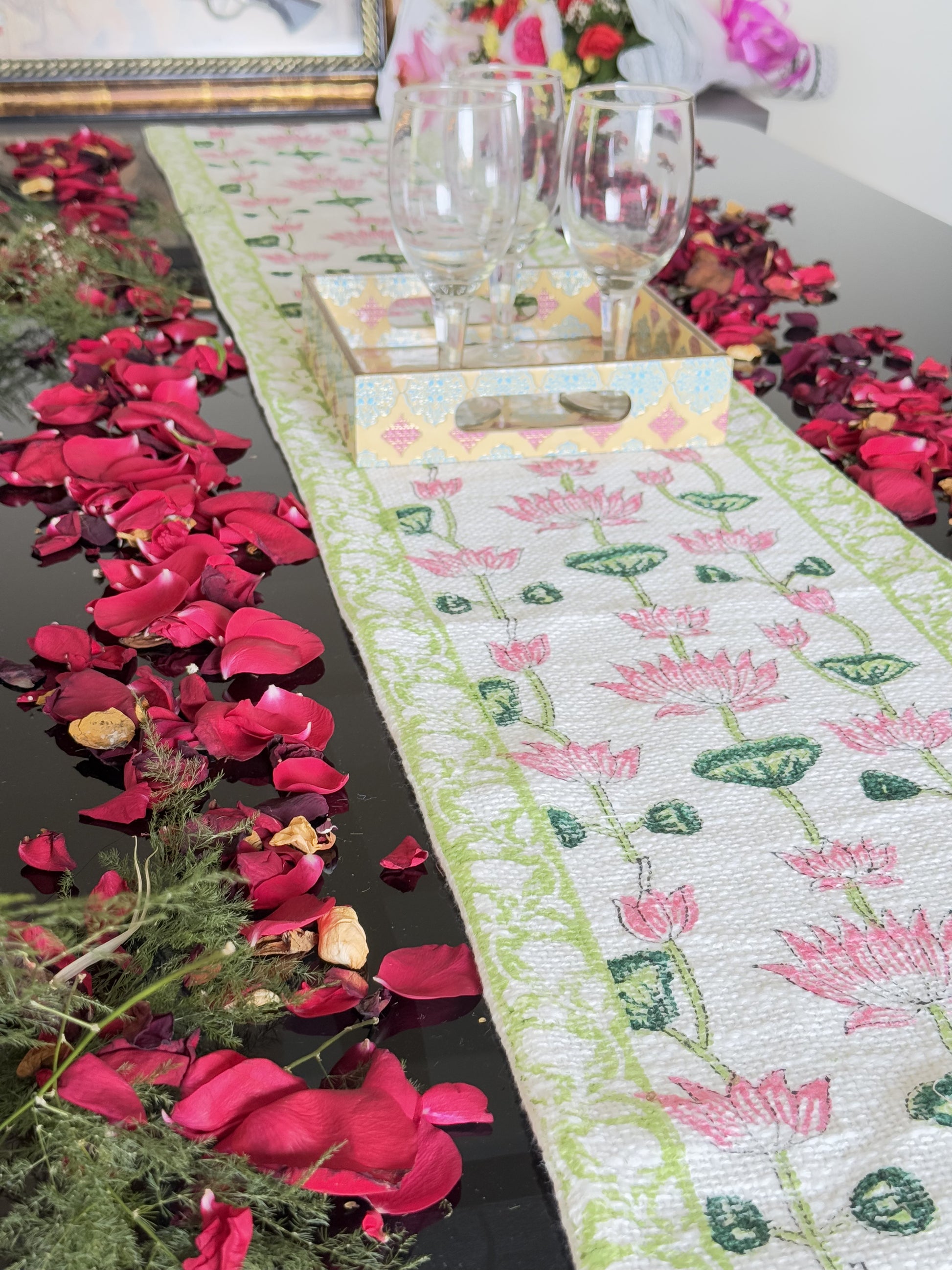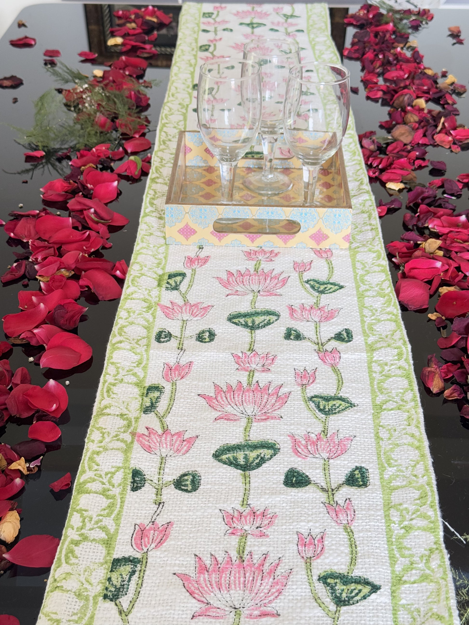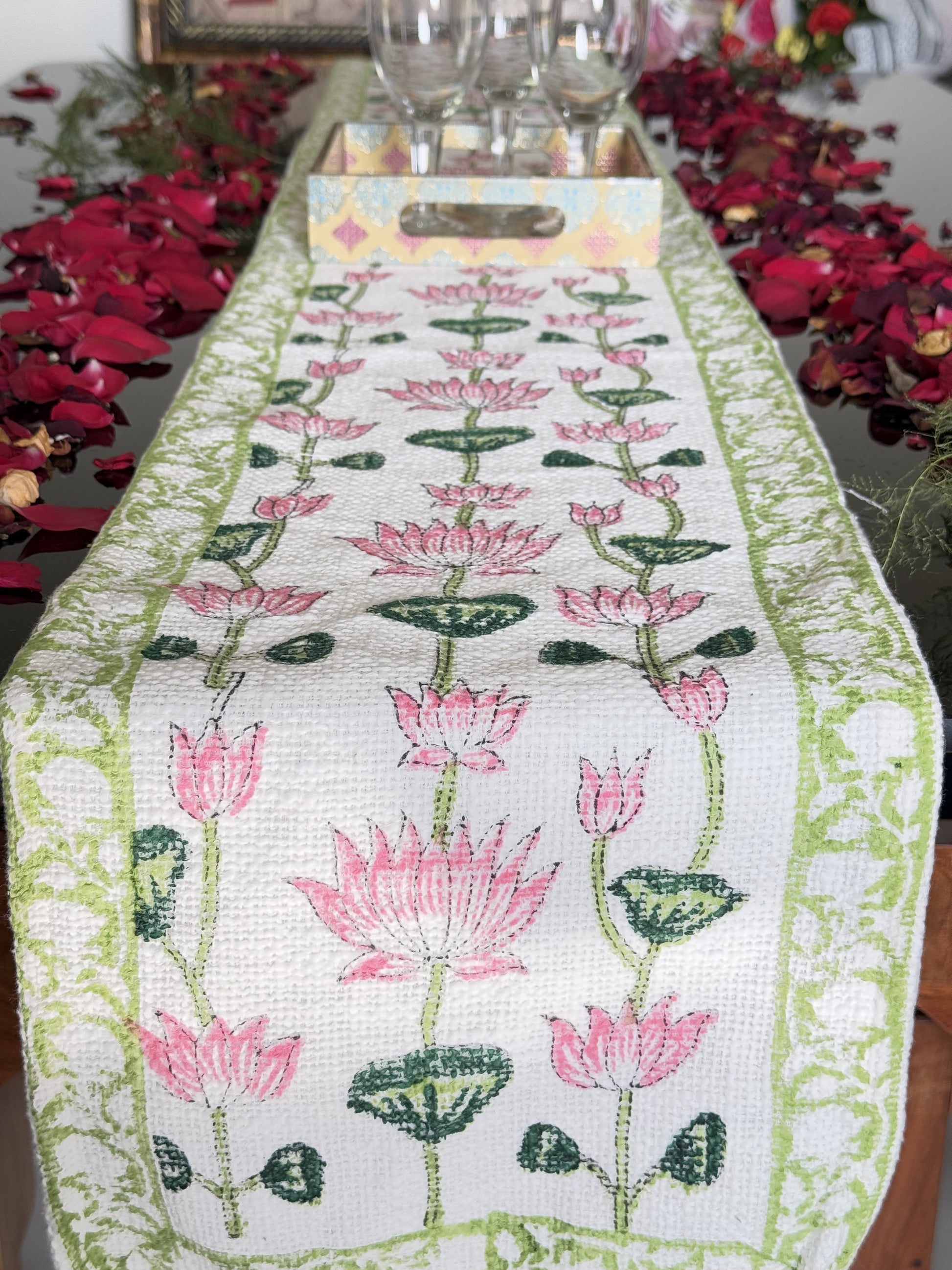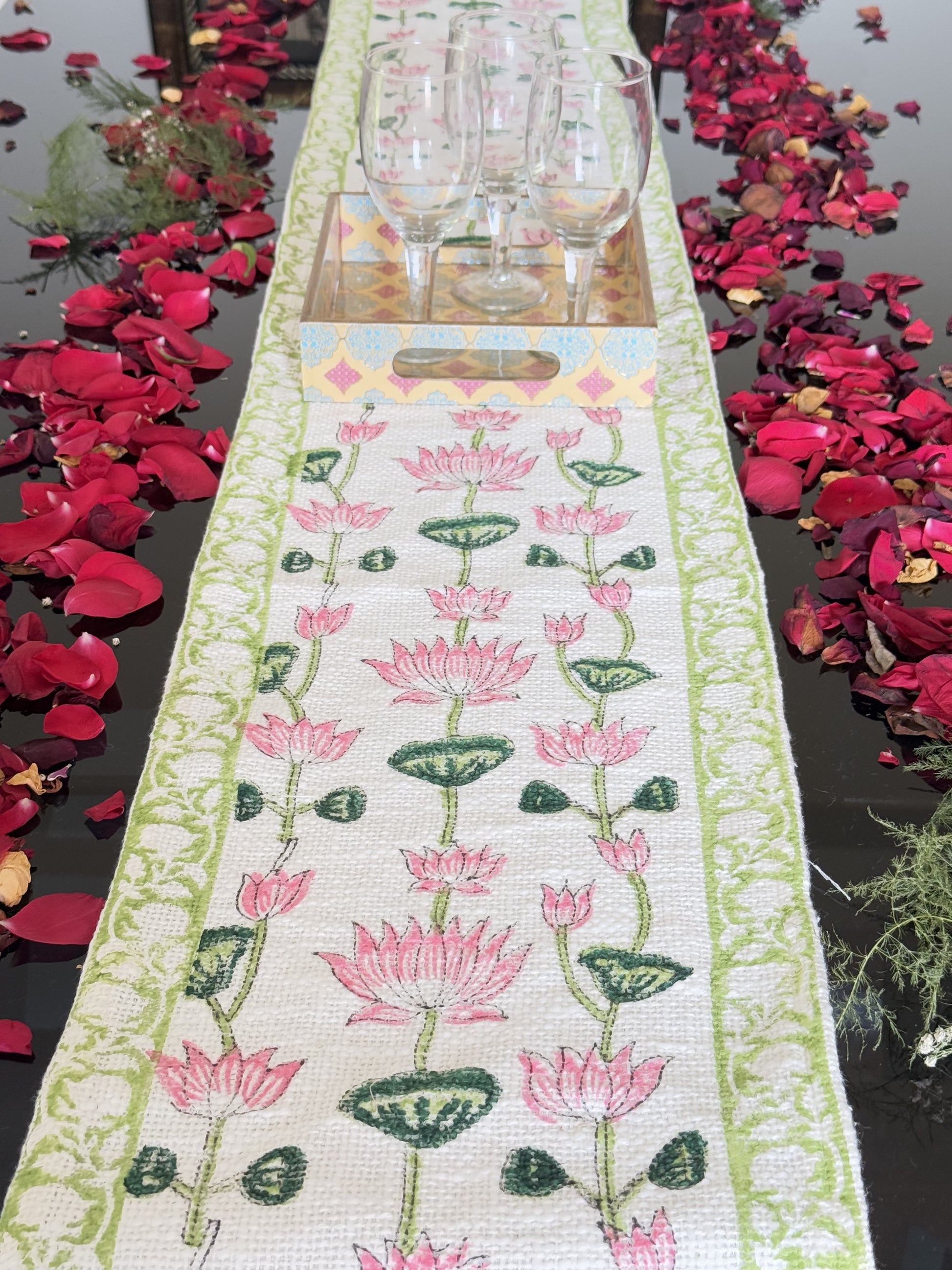 Pink Lotus Handblock Jute Runner – Artisan Craftsmanship from Rajasthan