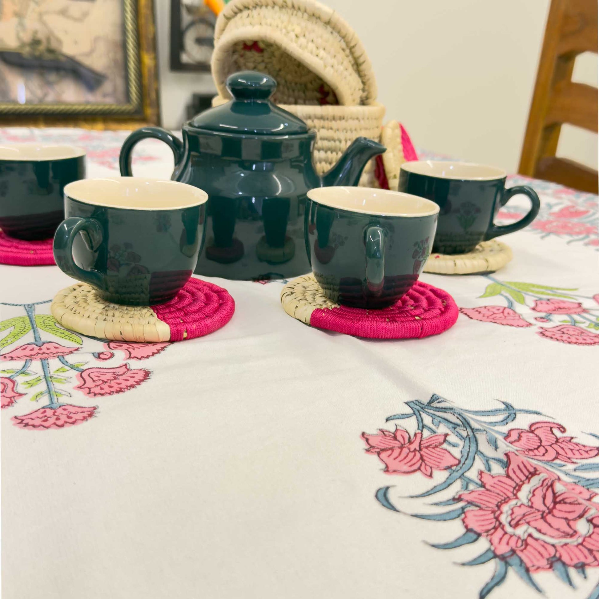 Transform your dining area with the Floral Handblock Table Cover, a perfect combination of style and functionality. Handcrafted using traditional handblock printing techniques, this tablecloth is designed to add elegance to your 6-seater rectangular dining table. Made from 100% cotton, it ensures durability, comfort, and easy maintenance.