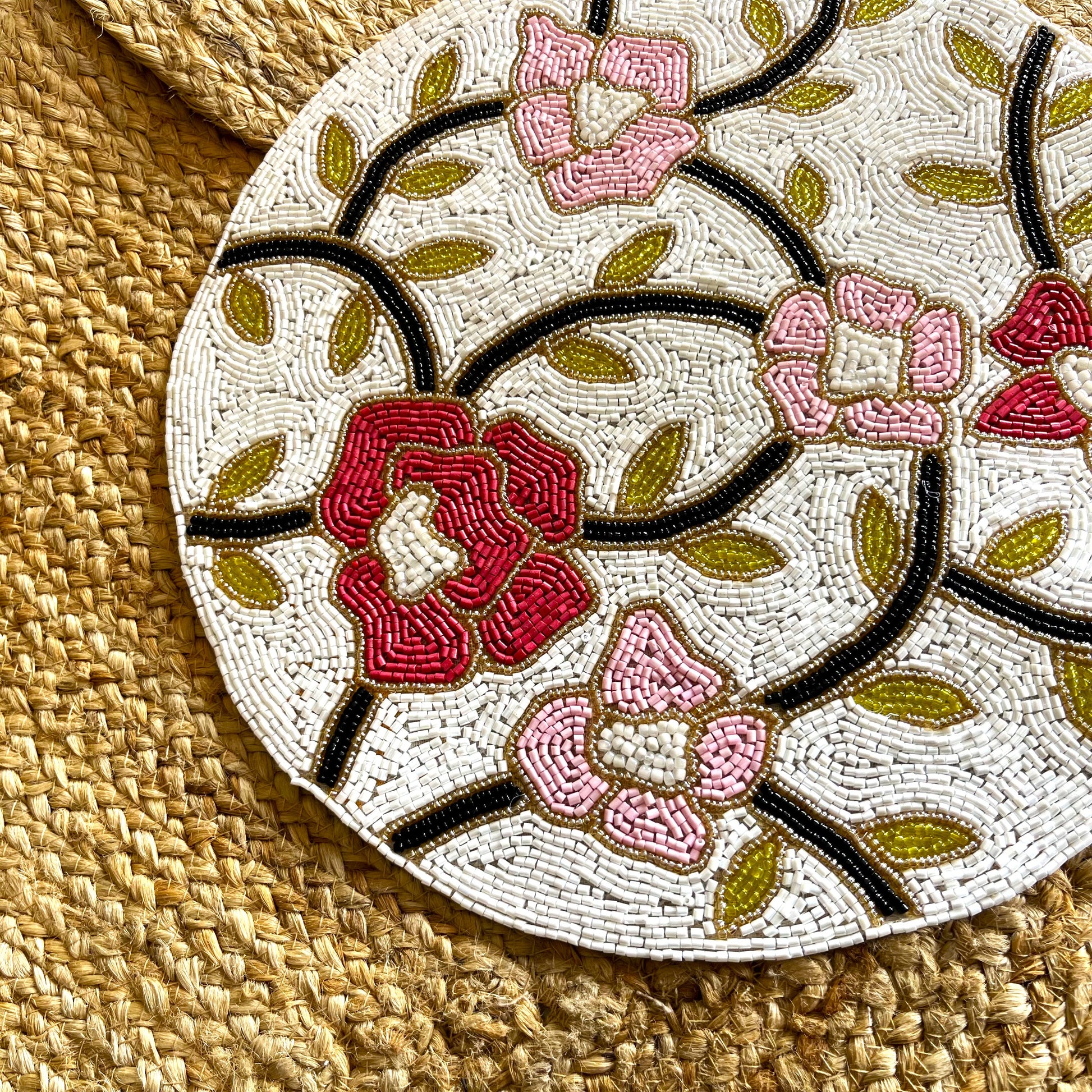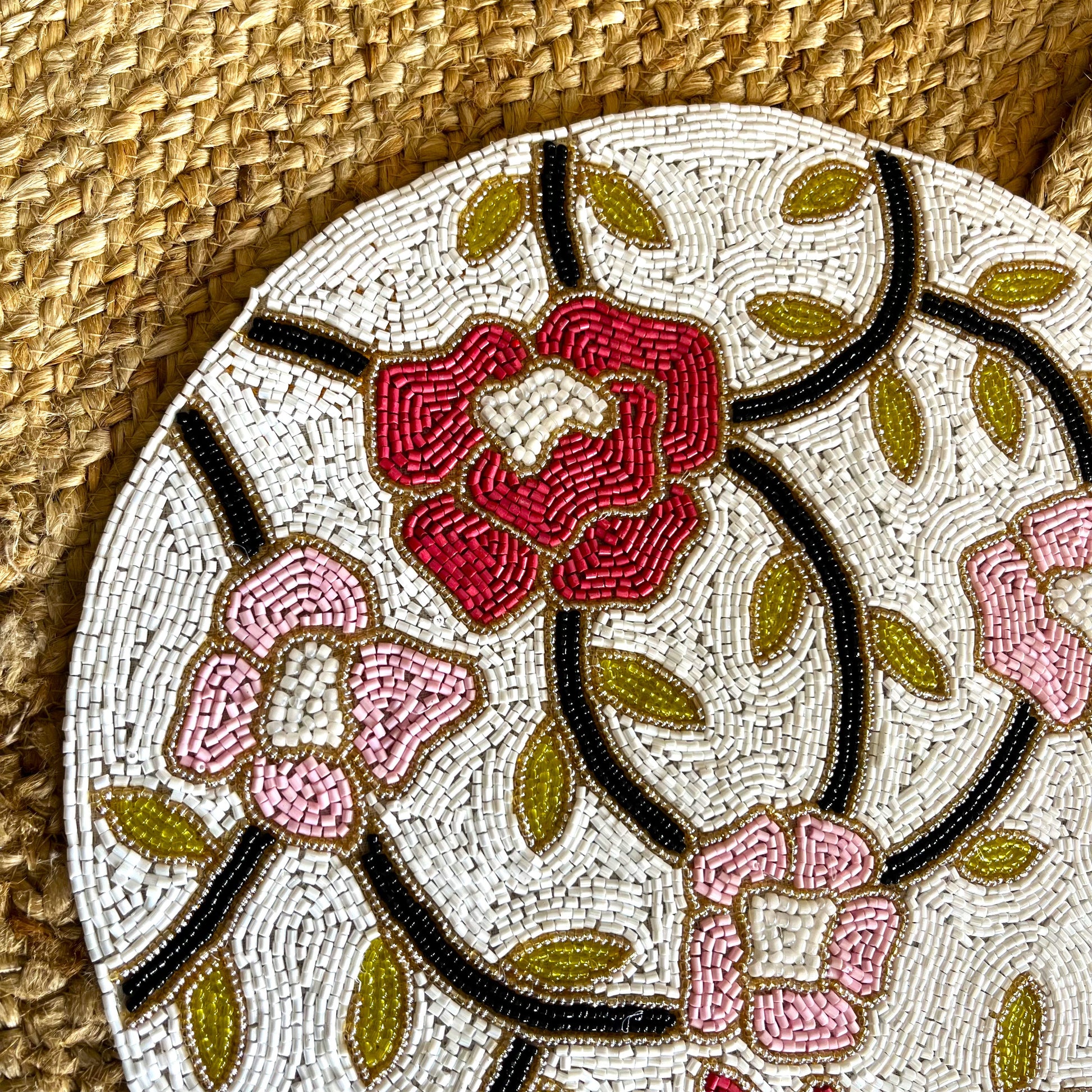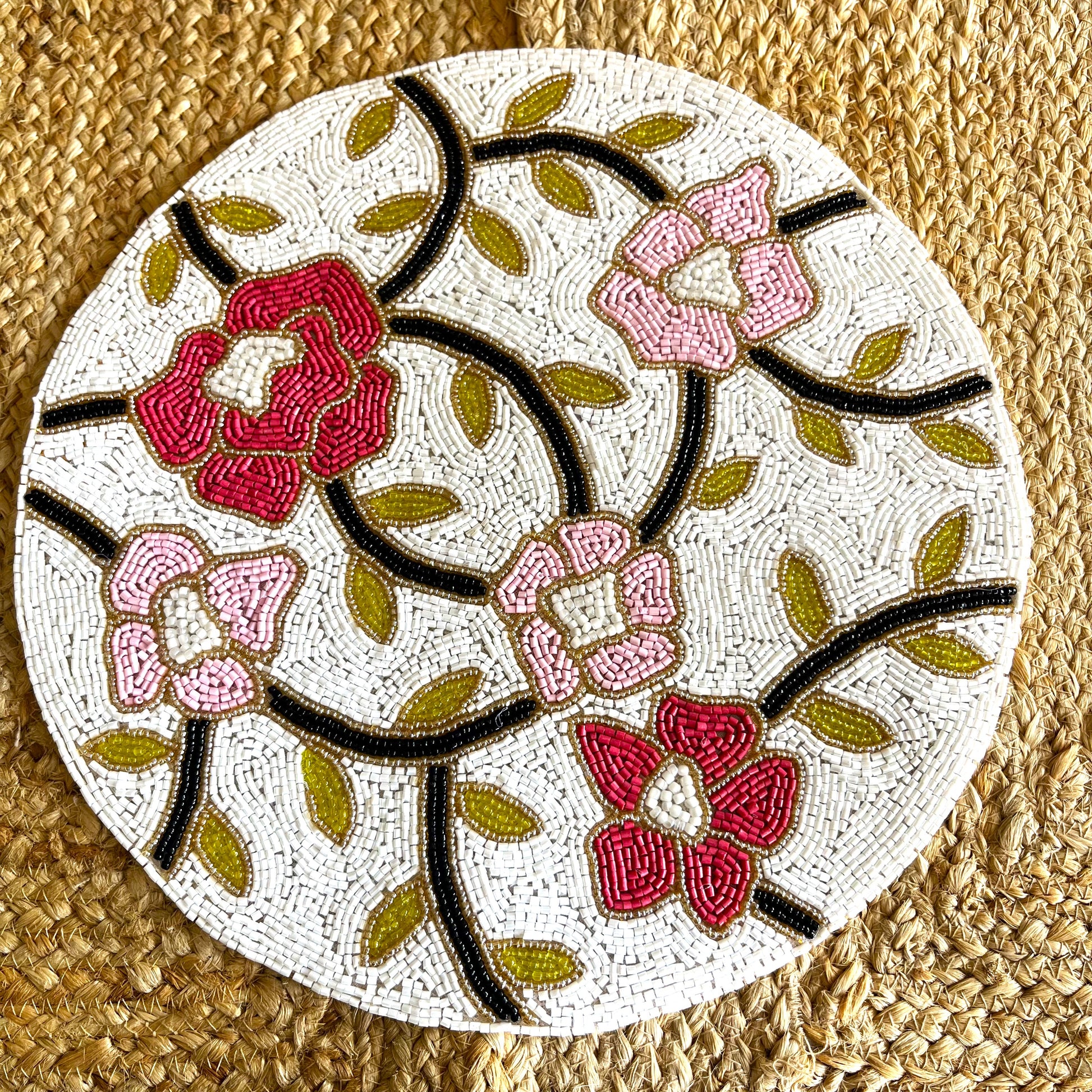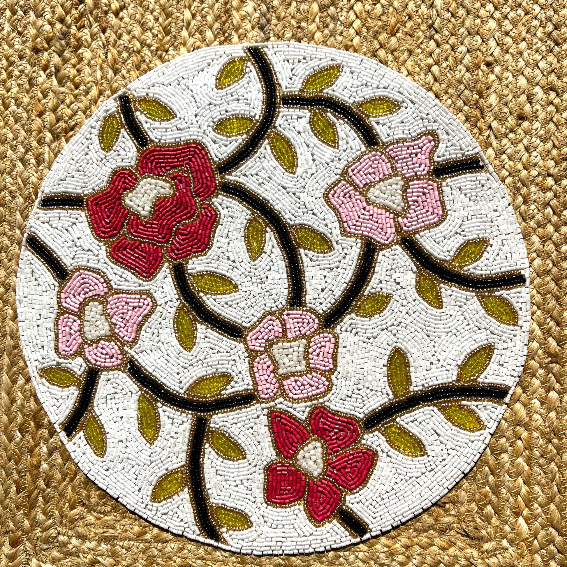 Pink Red Floral Round Handcrafted Beaded Placemat- 14-inch Round Decorative Table Mat