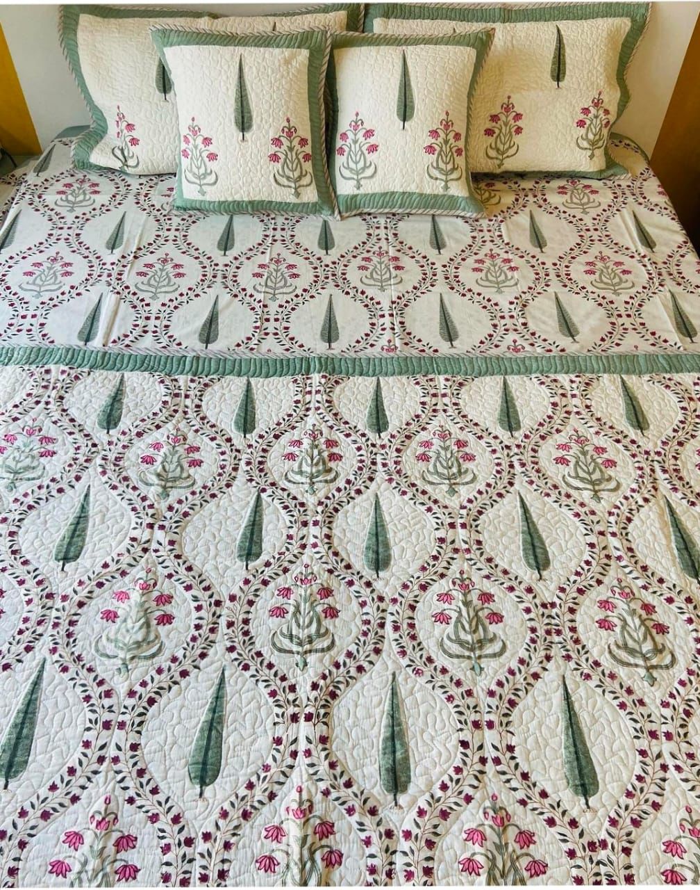 Pink and Green Leaf Handblock Quilted Reversible Bedcover with 2 Pillow Covers – Elegant and Eco-Friendly Bedroom Décorly Bedroom Décor