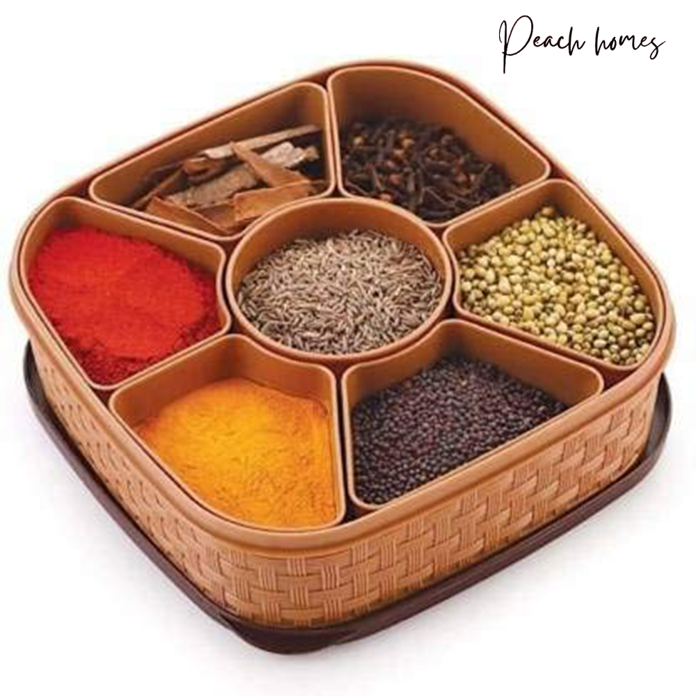 Elevate your kitchen organization with the Plastic Square 7-Section Multipurpose Masala Box. Crafted from high-quality, durable plastic, this sleek spice box offers seven segmented sections to neatly organize your spices, masalas, herbs, and seasoning mixes. The lock-in system ensures your spices remain fresh and moisture-free, while the slim and chic design makes it easy to fit on any counter or in cabinets. Easy to clean and maintain, this versatile masala box is the perfect solution for a clutter-free, efficient kitchen.