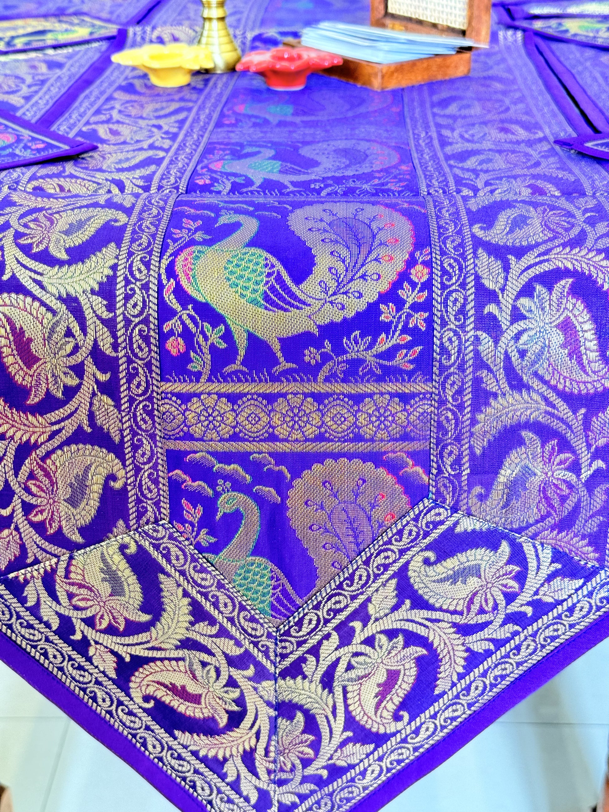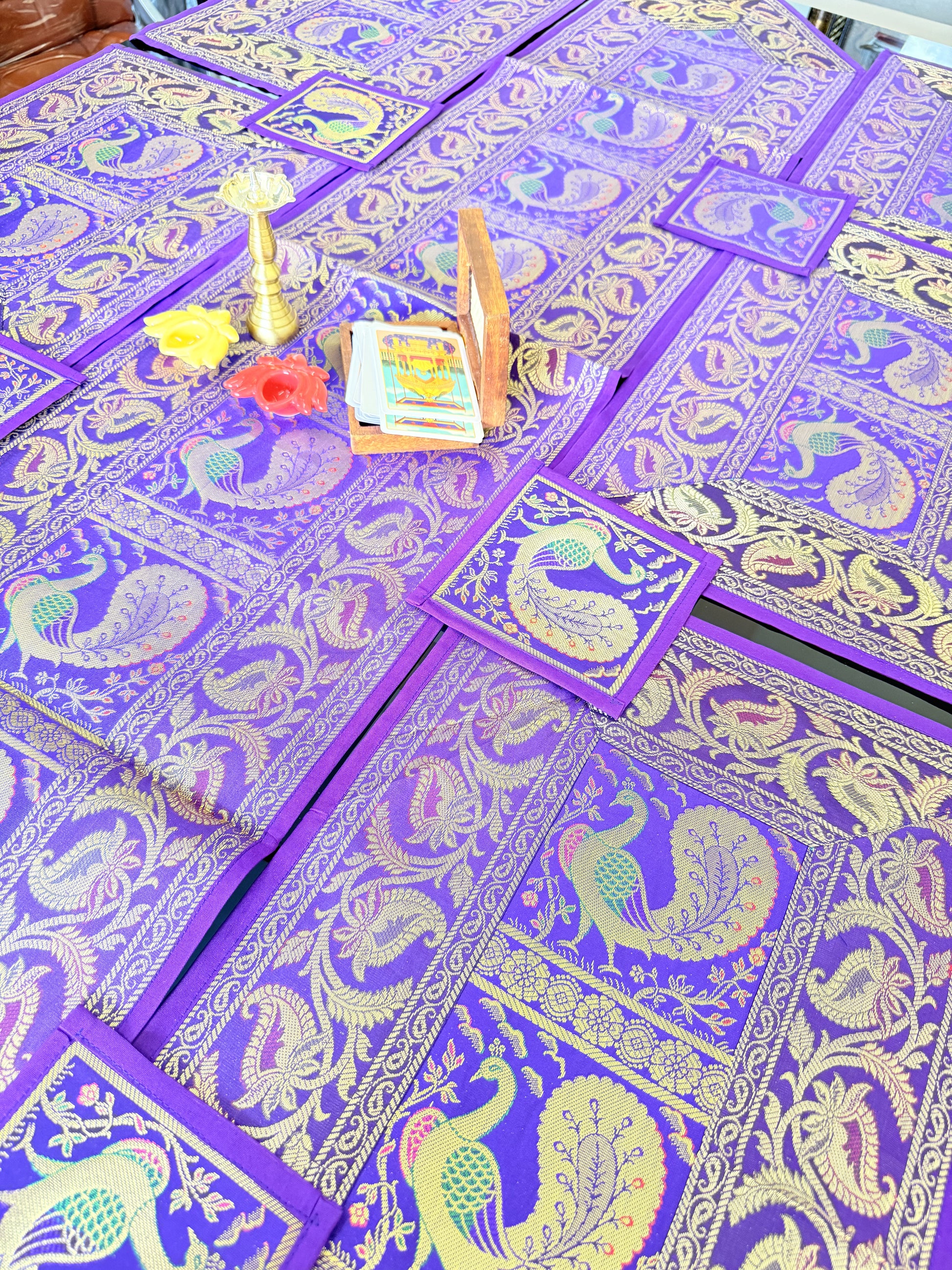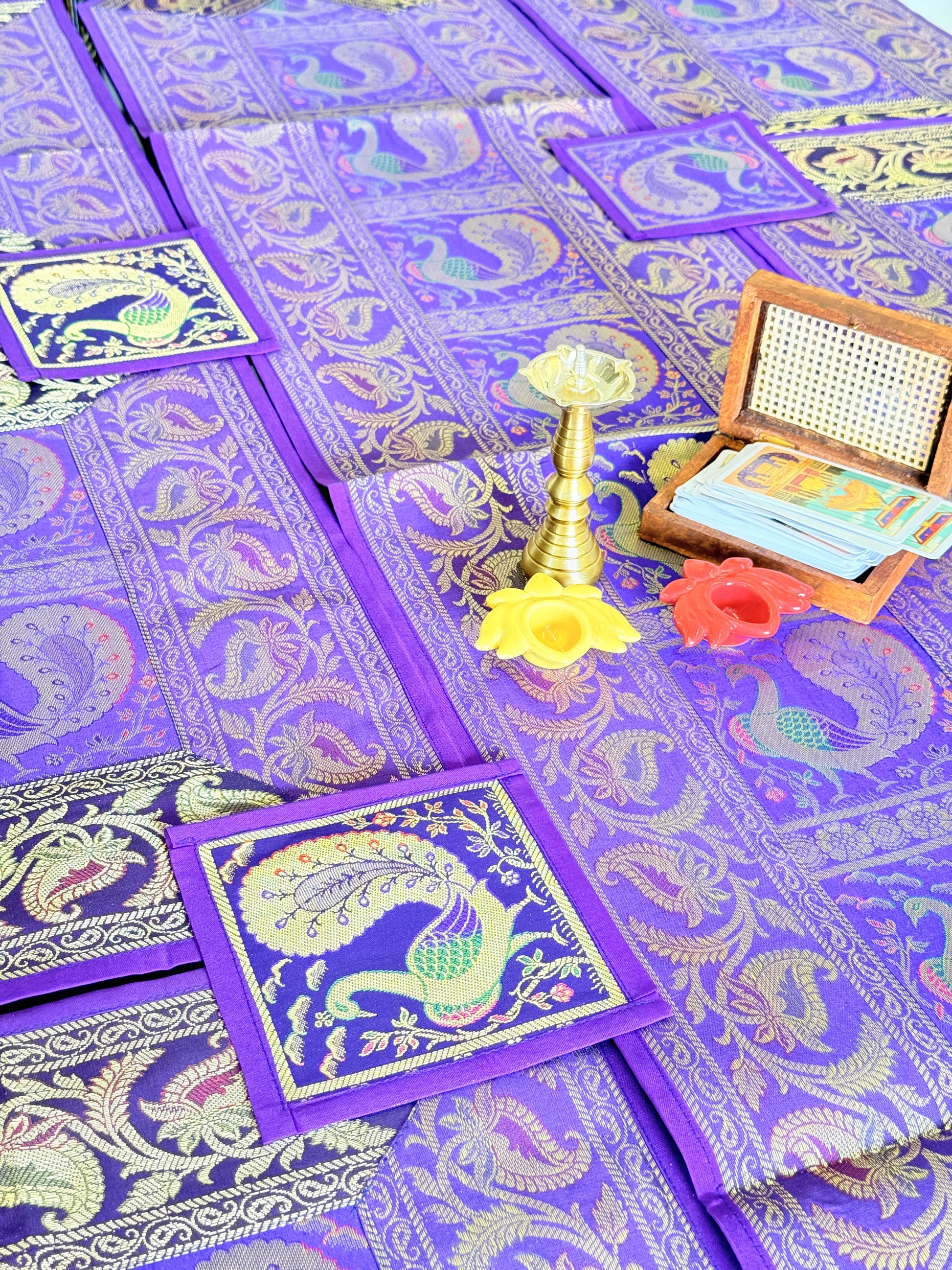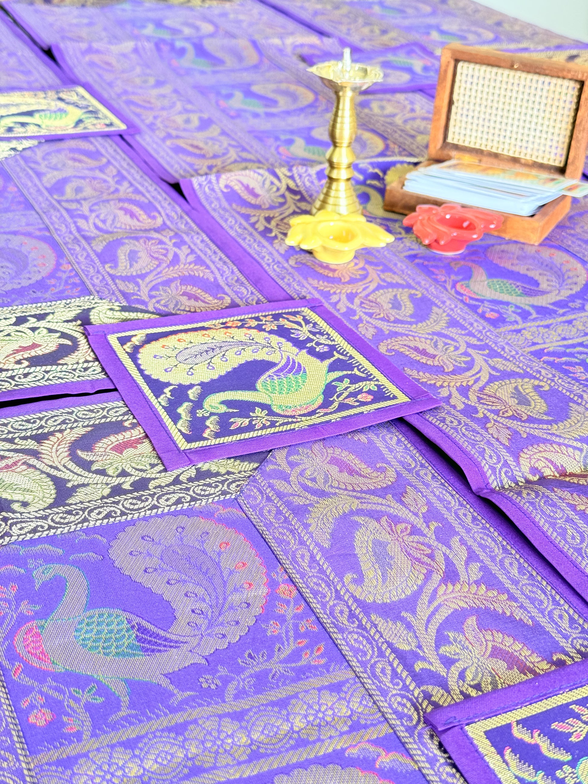 Purple Peacock Silk Banarasi Table Runner and Mats with Coaster Set of 6