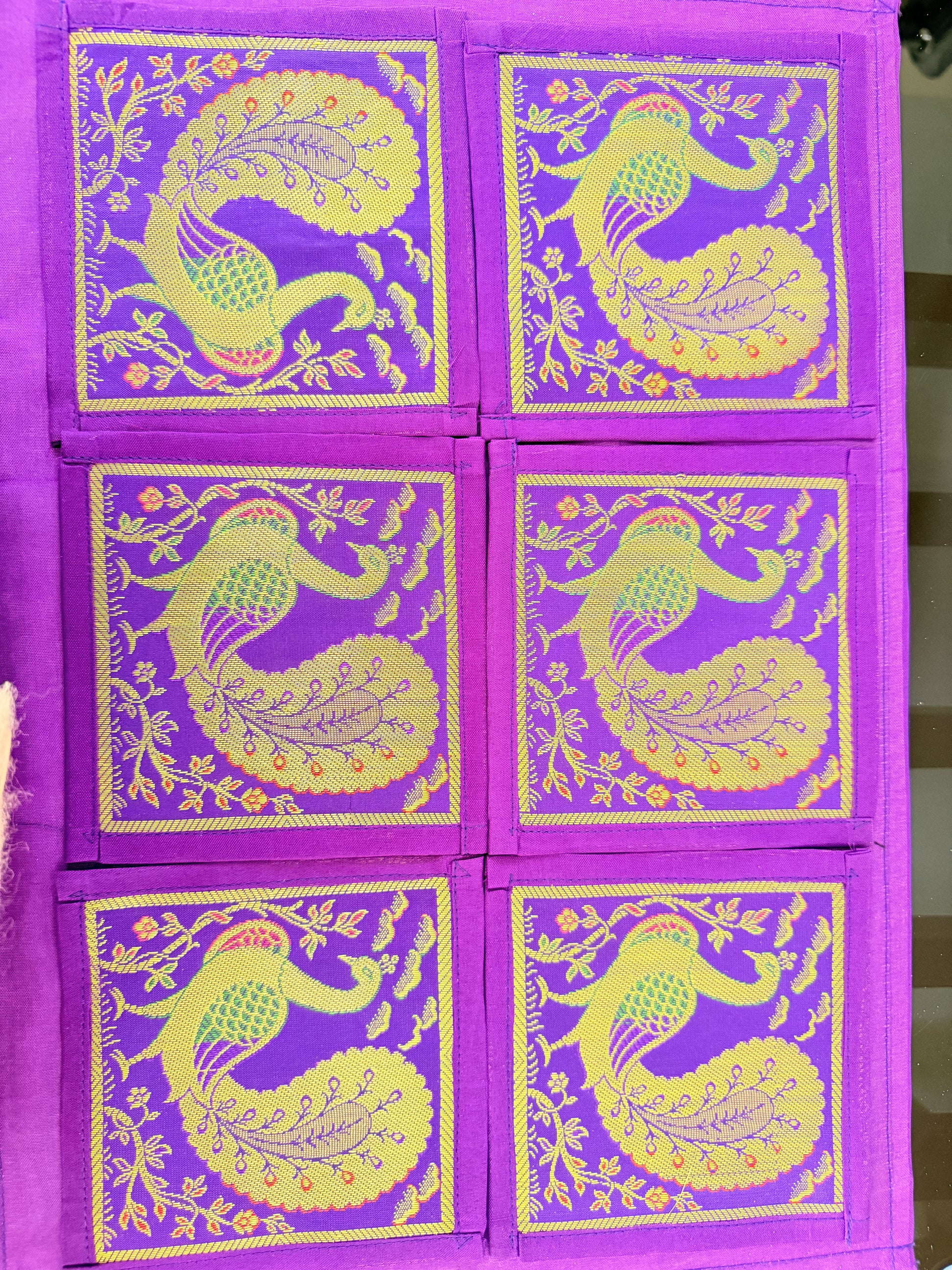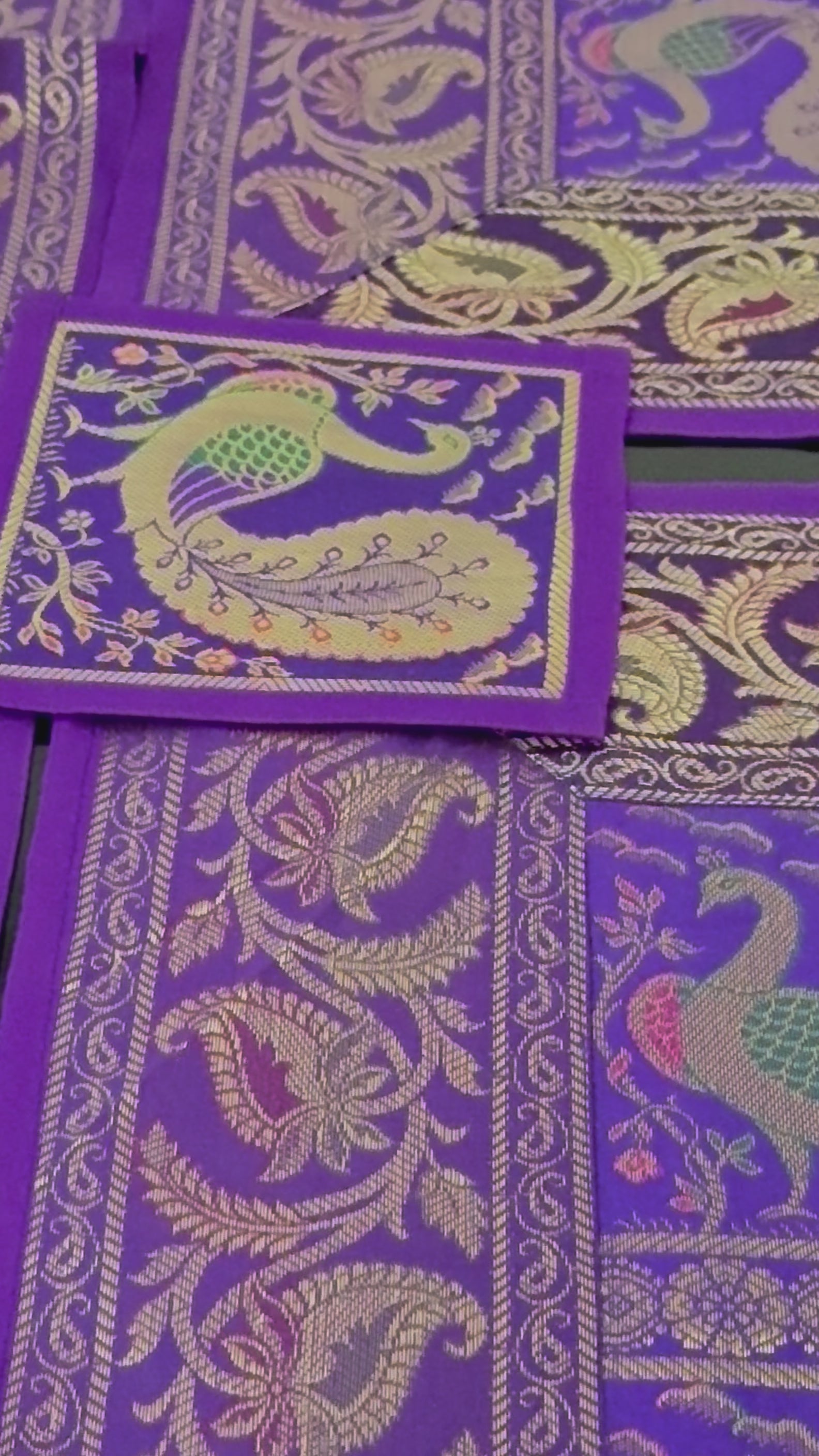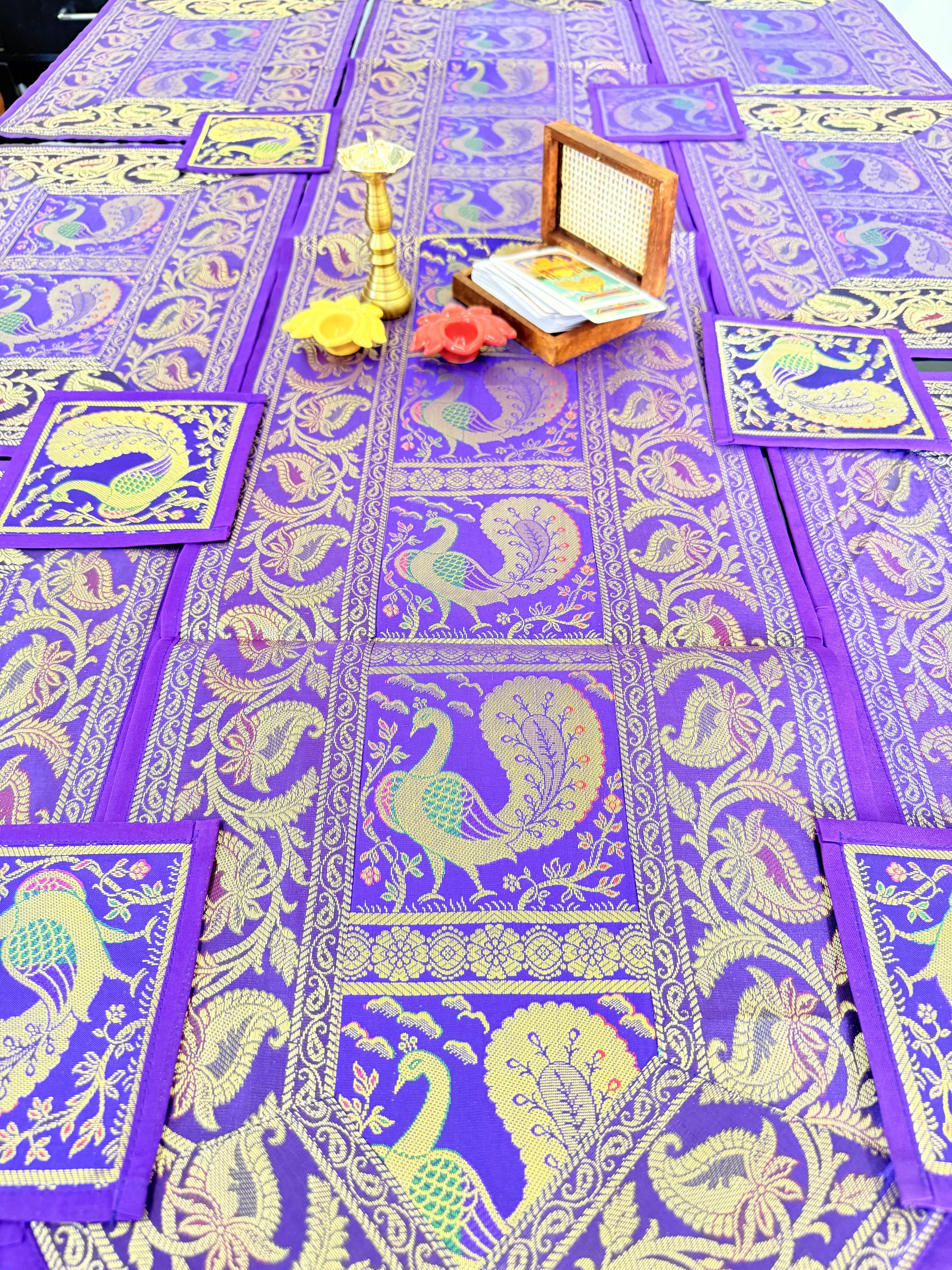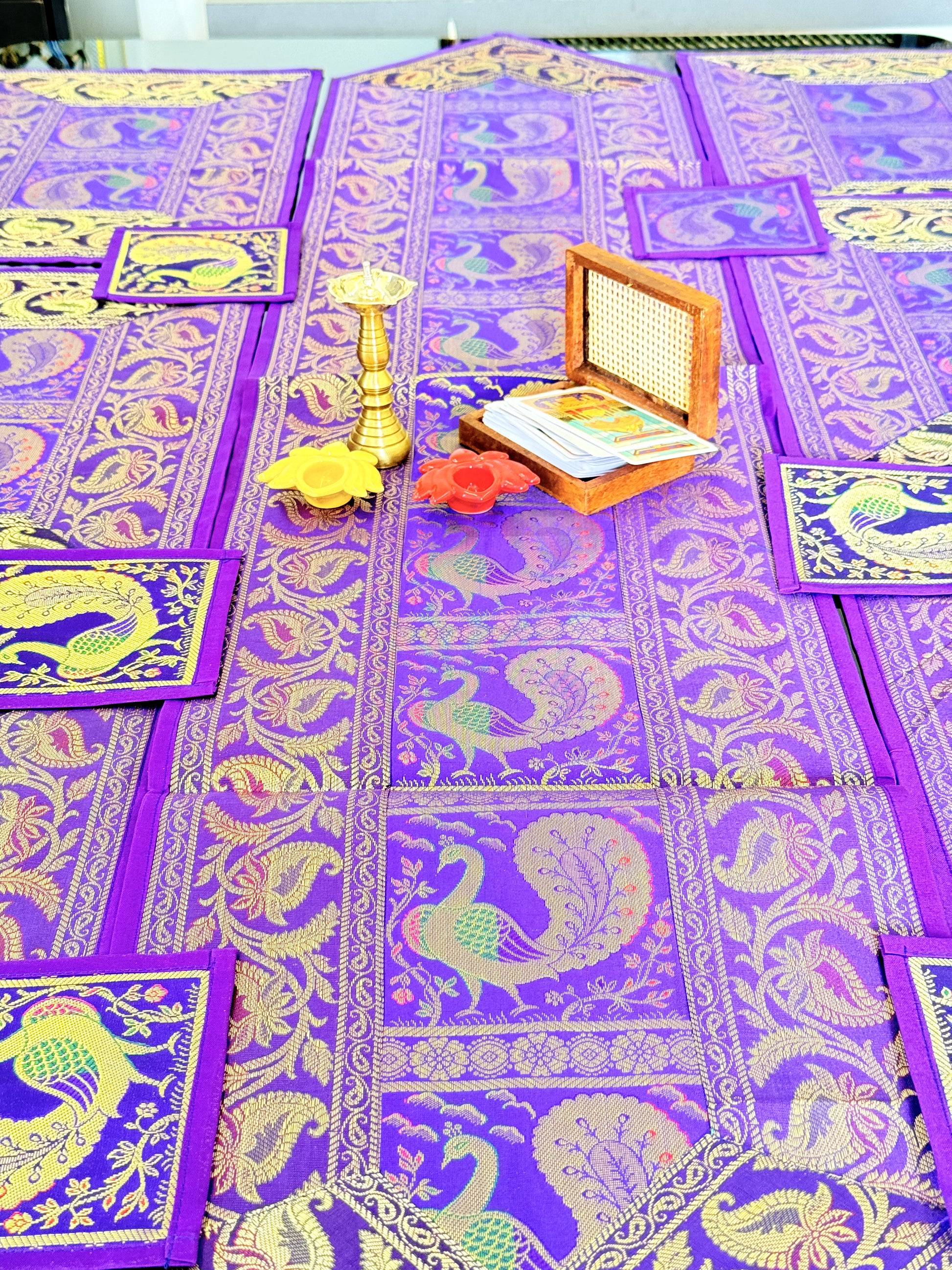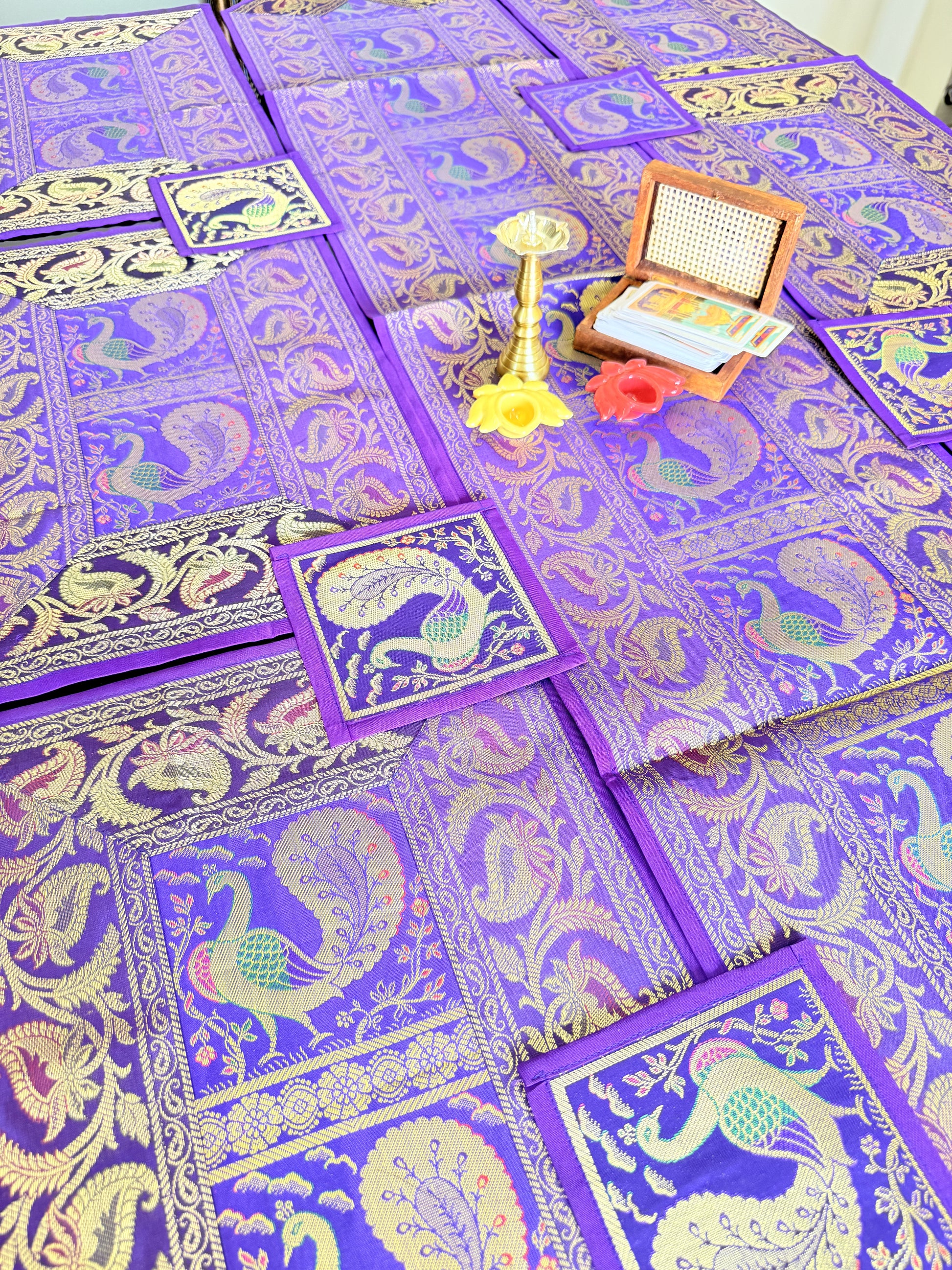 Purple Peacock Silk Banarasi Table Runner and Mats with Coaster Set of 6