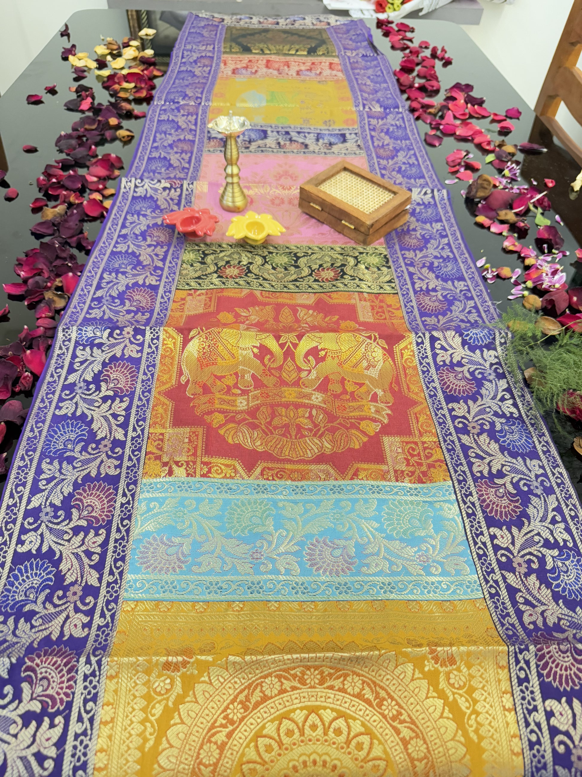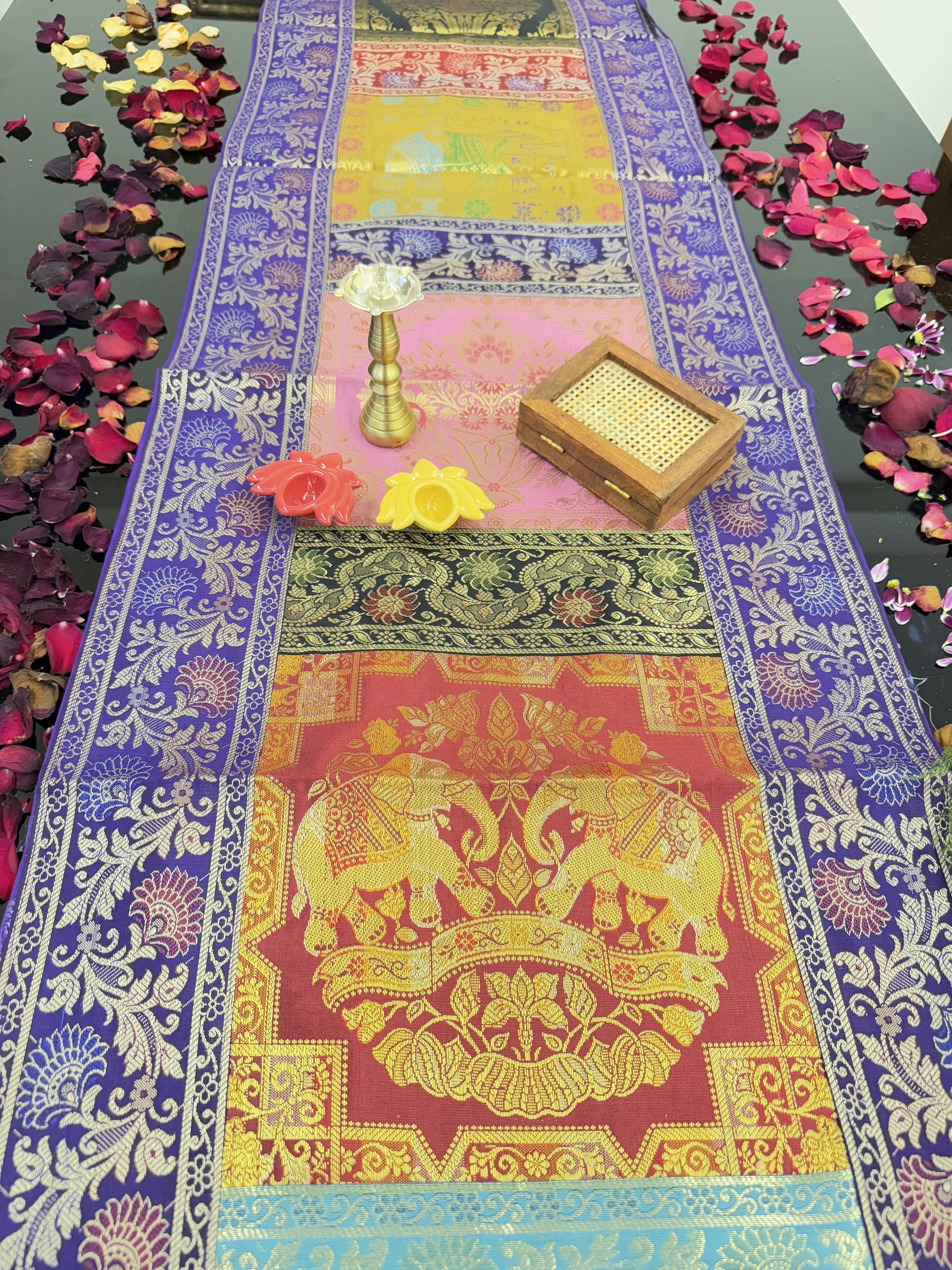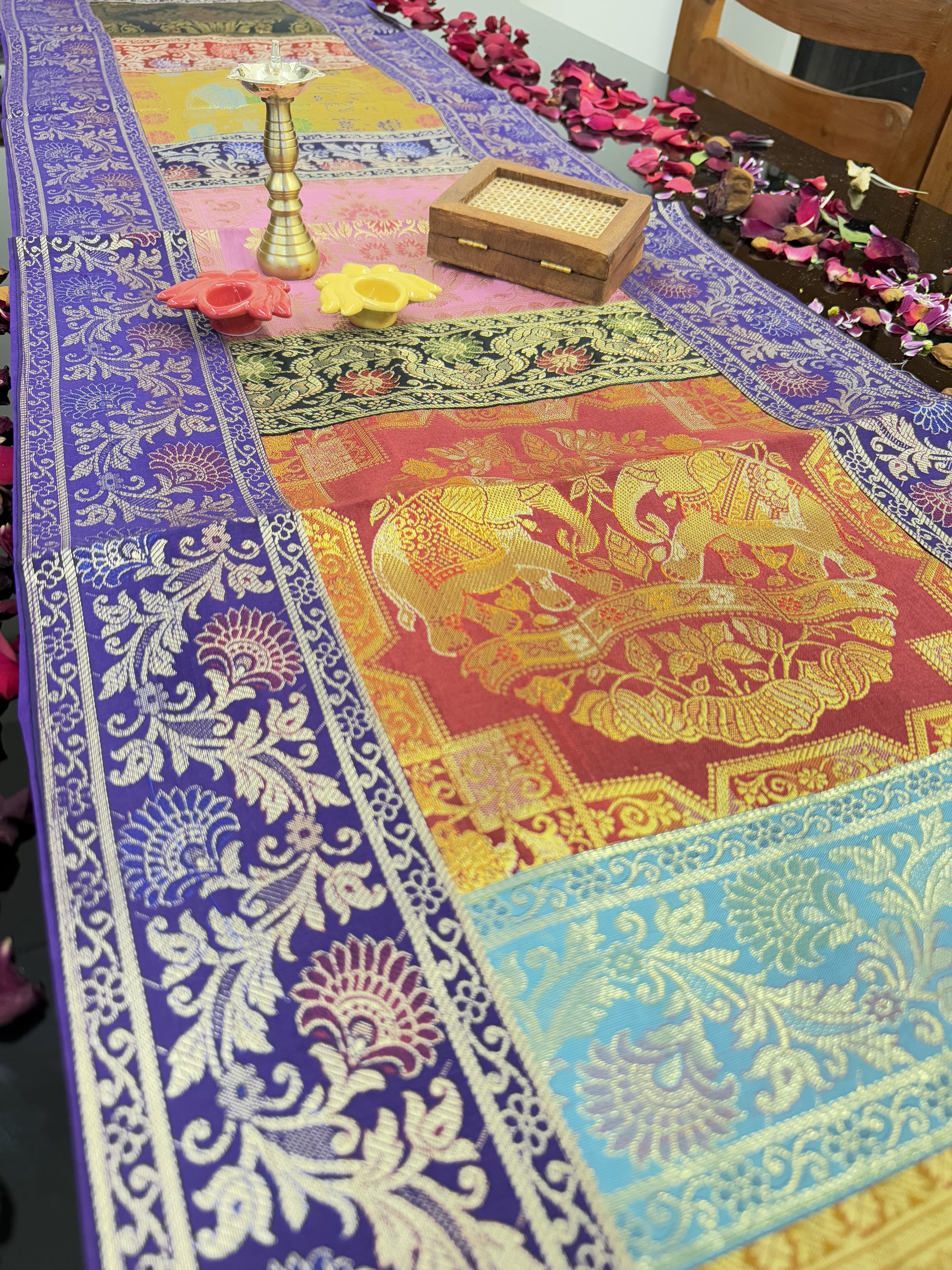 Purple Banarasi Silk Patchwork Table Runner – Luxurious Brocade & Art Silk Décor for Elegant Spaces