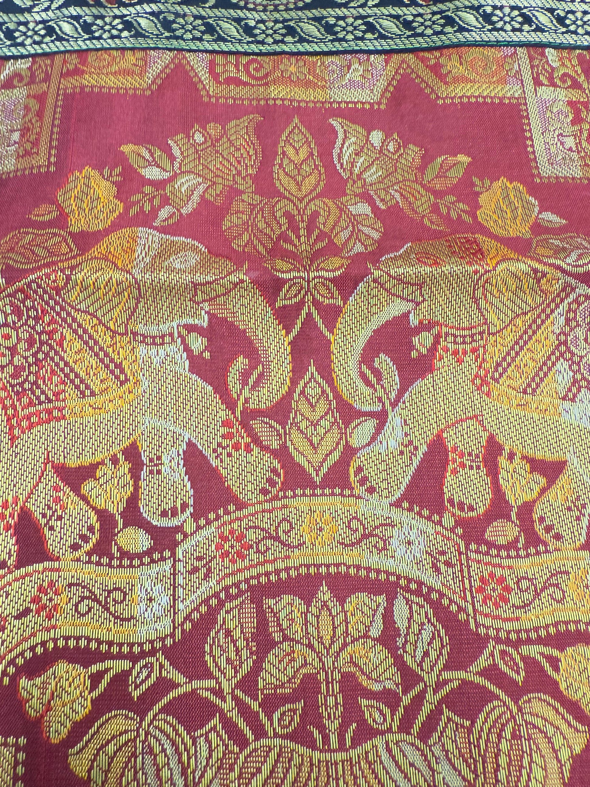 - Design: Banarasi brocade borders paired with golden Gardish Circles hand-block print
