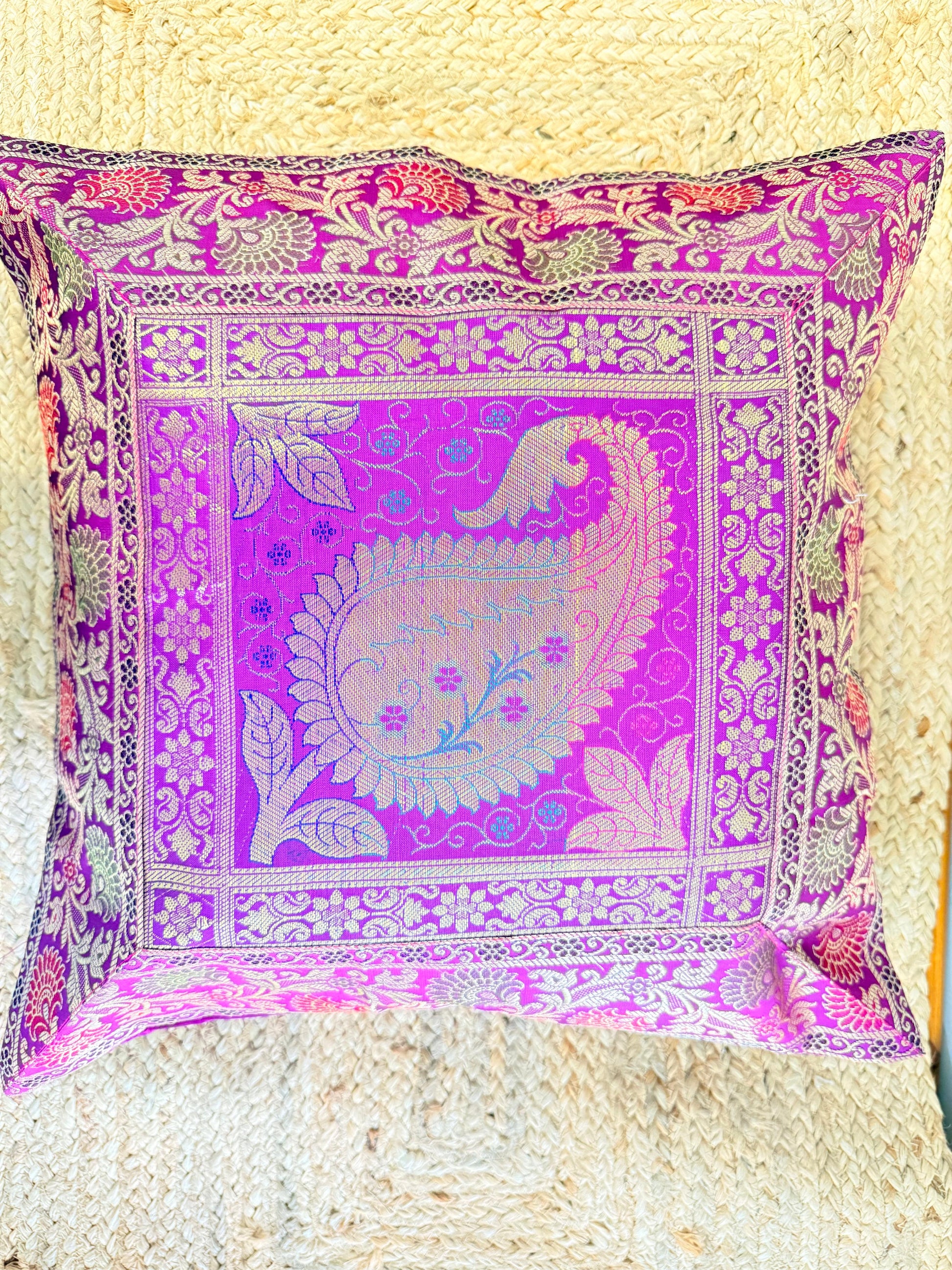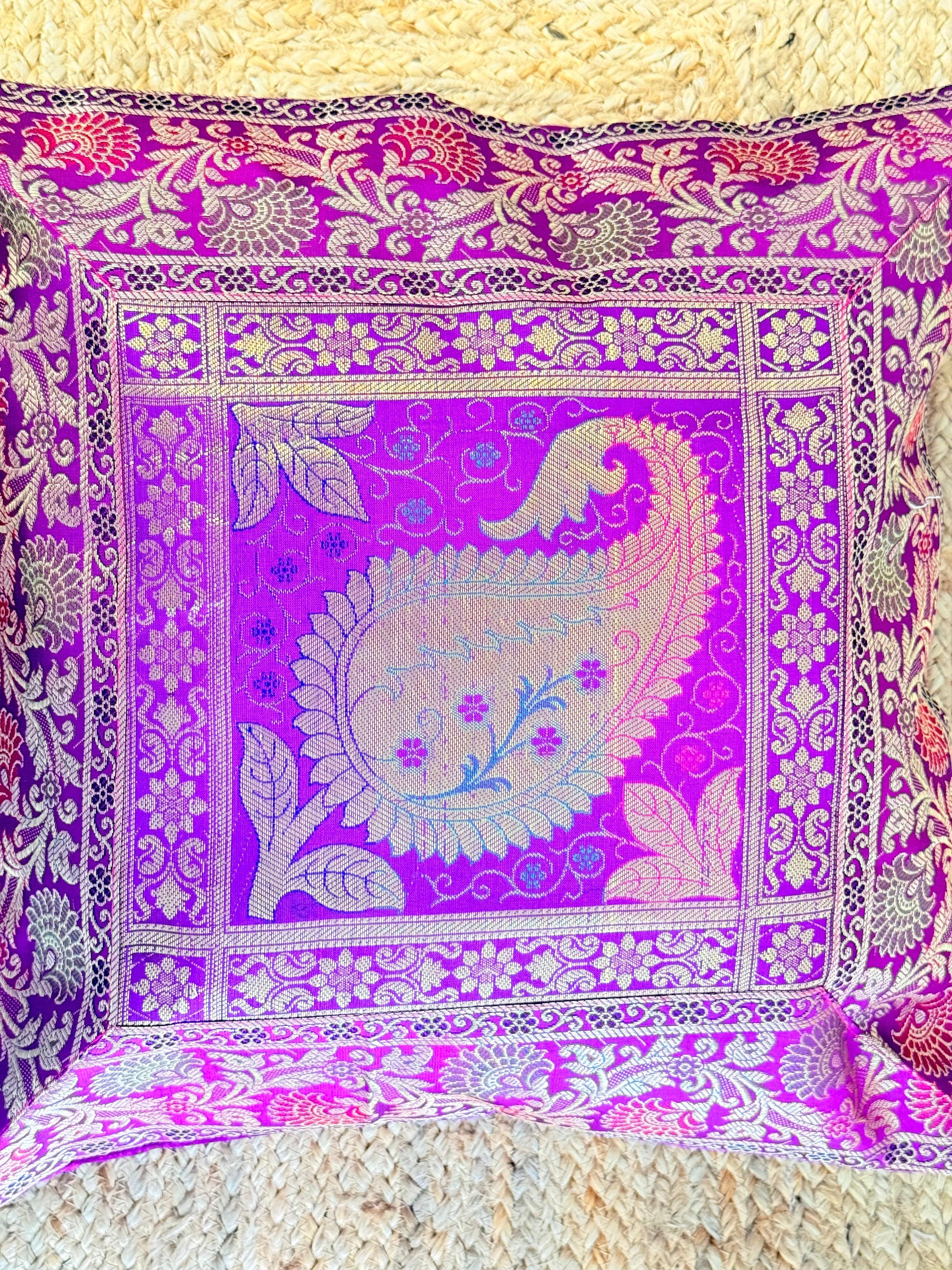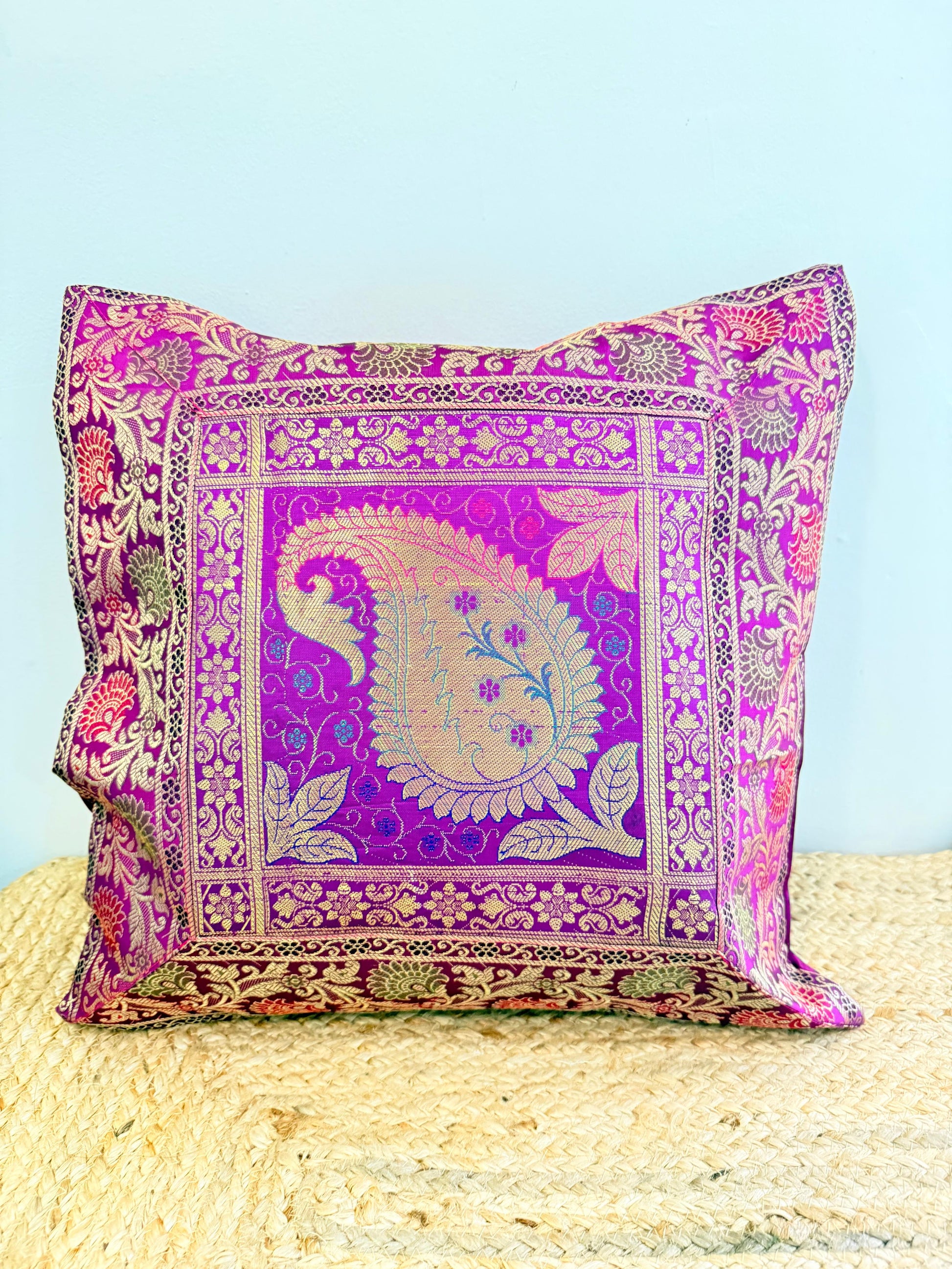 Purple Leaf Embroidery Banarasi Silk Cushion Cover – Size 16*16