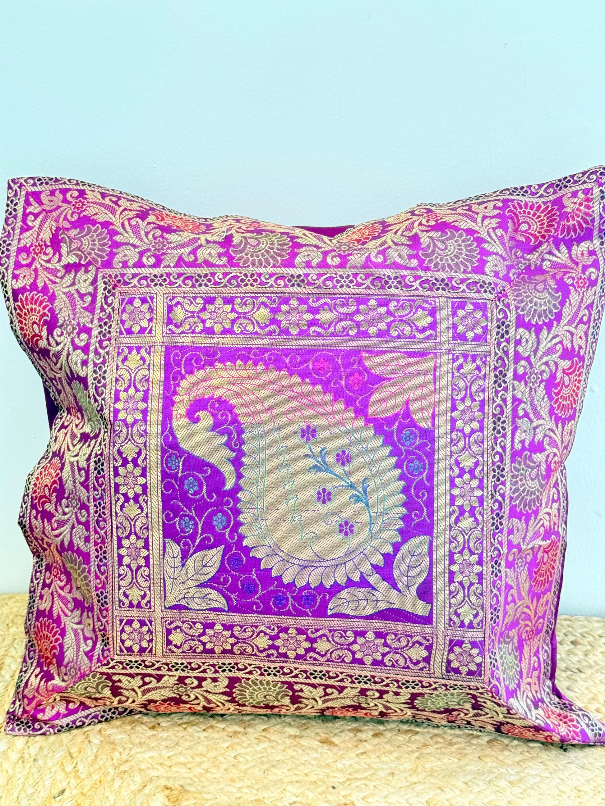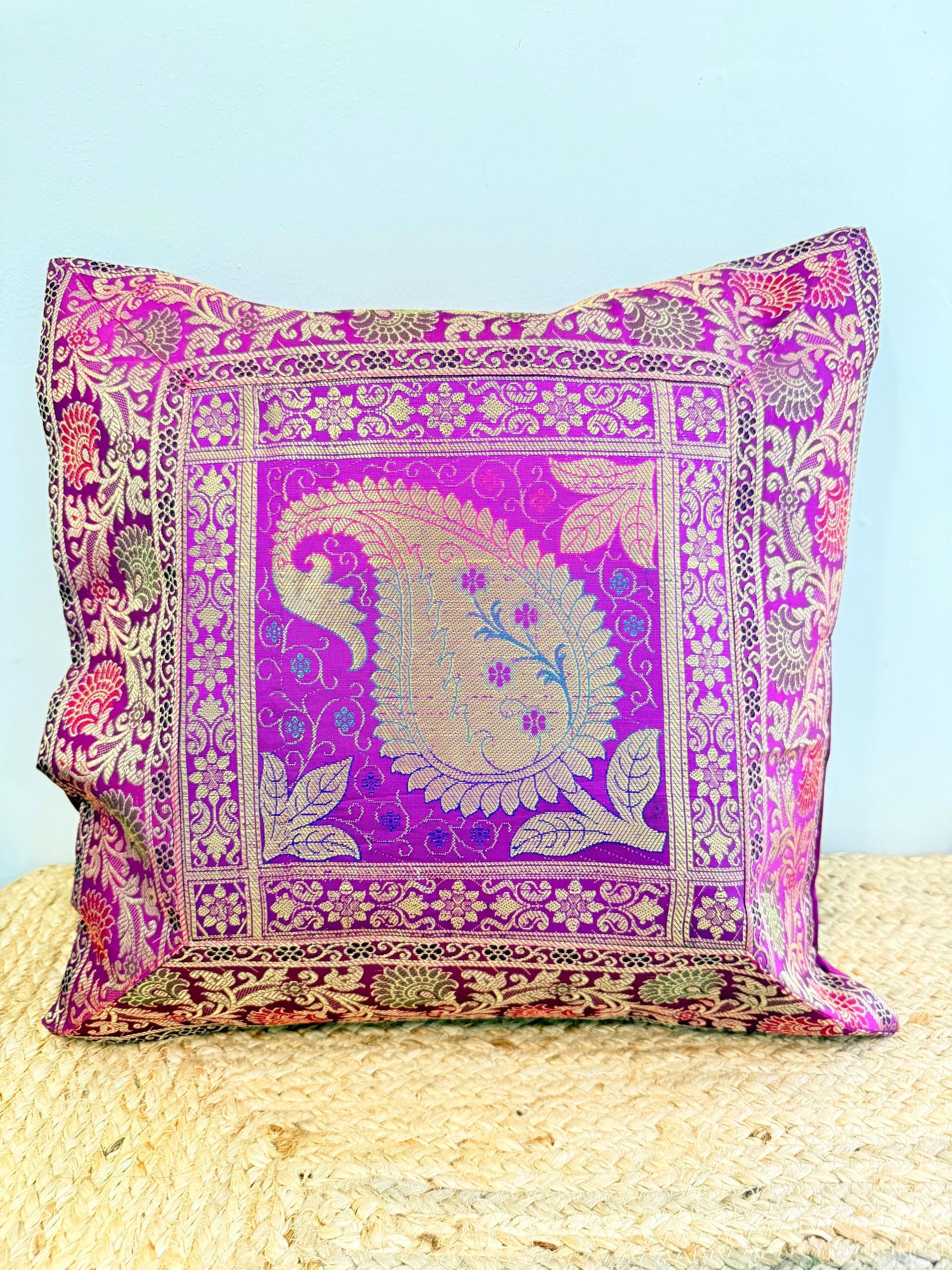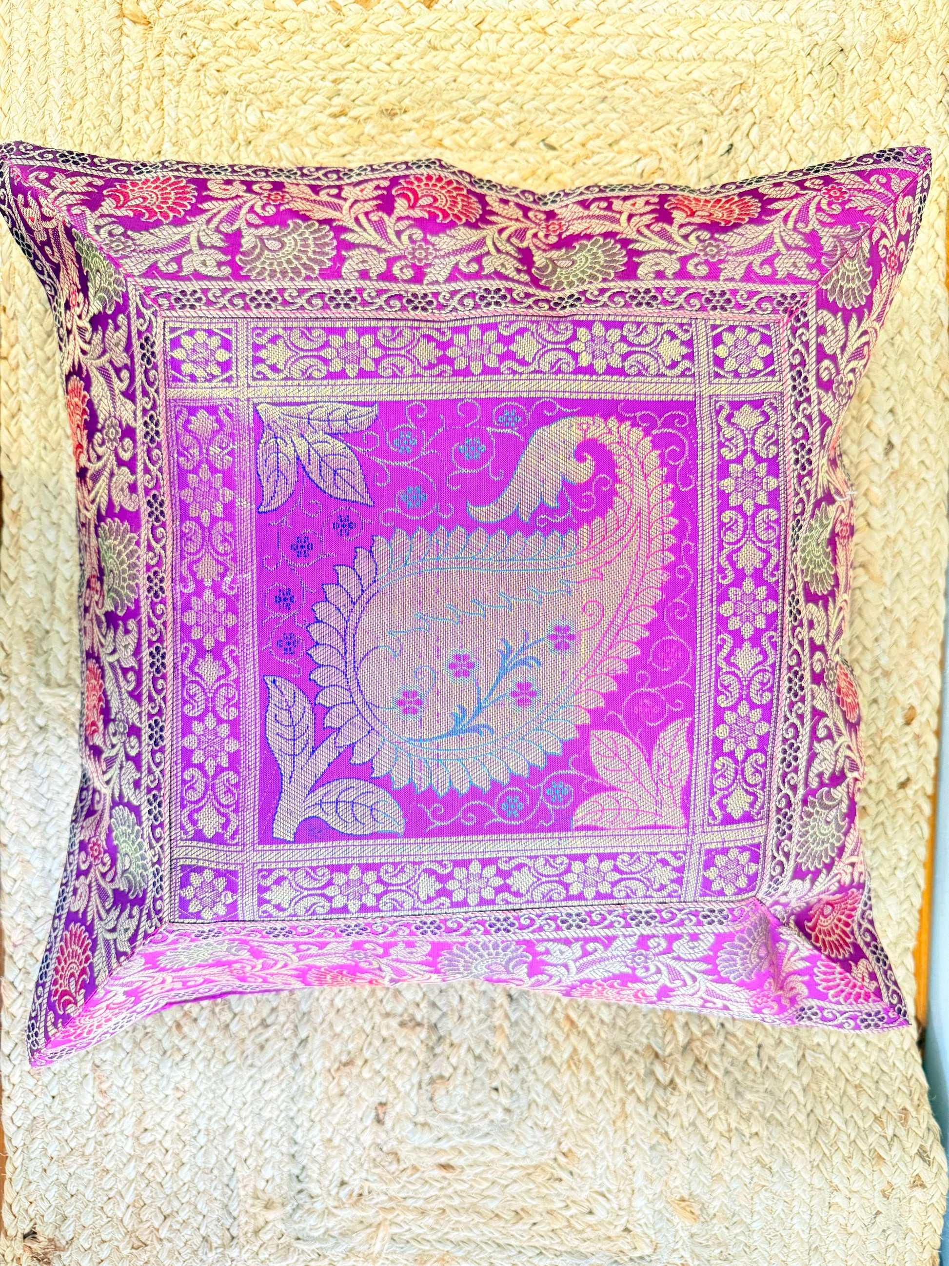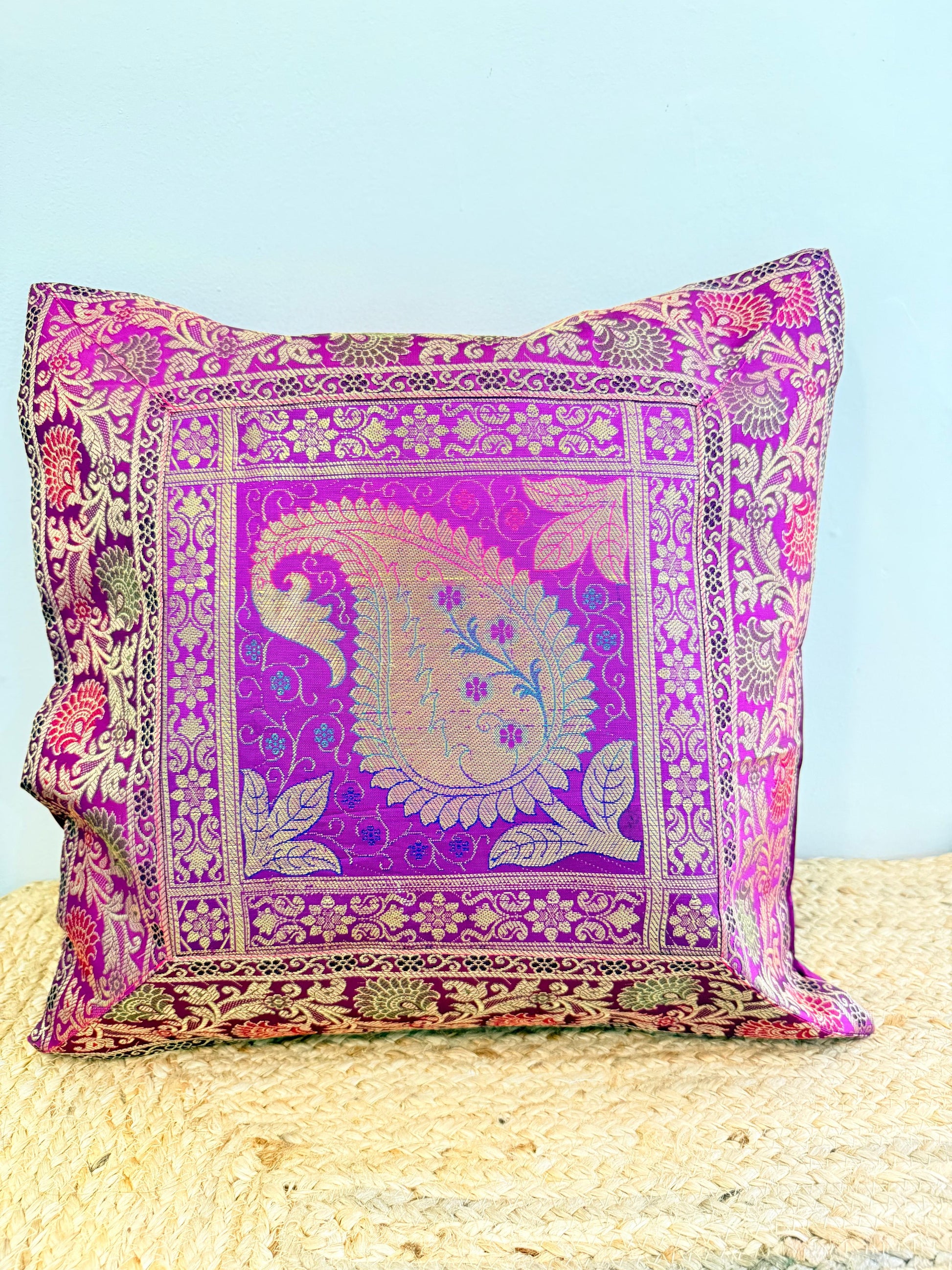 Purple Leaf Embroidery Banarasi Silk Cushion Cover – Size 16*16