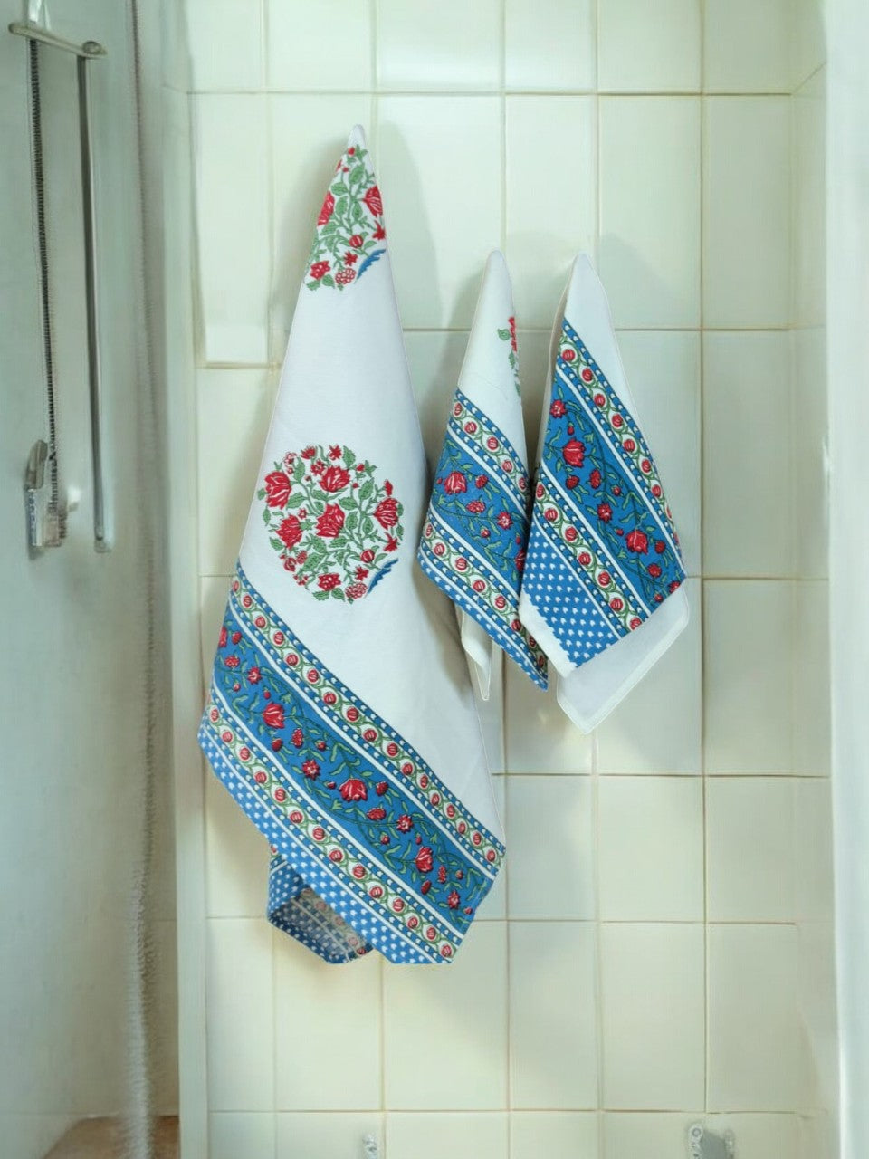 Red and Blue Floral White Handblock Towel Set of 3 – 1 Bath Towel, 2 Hand Towels