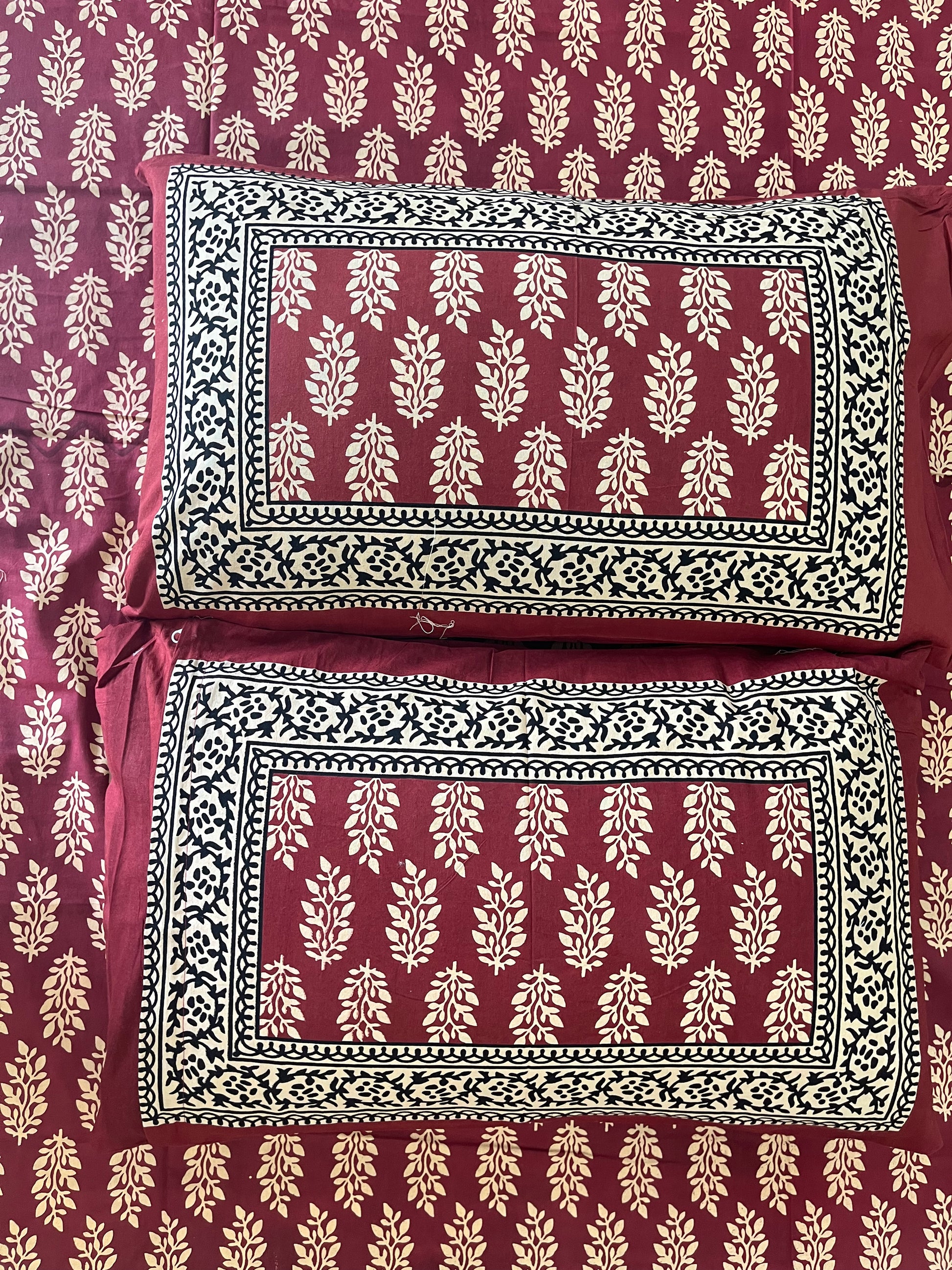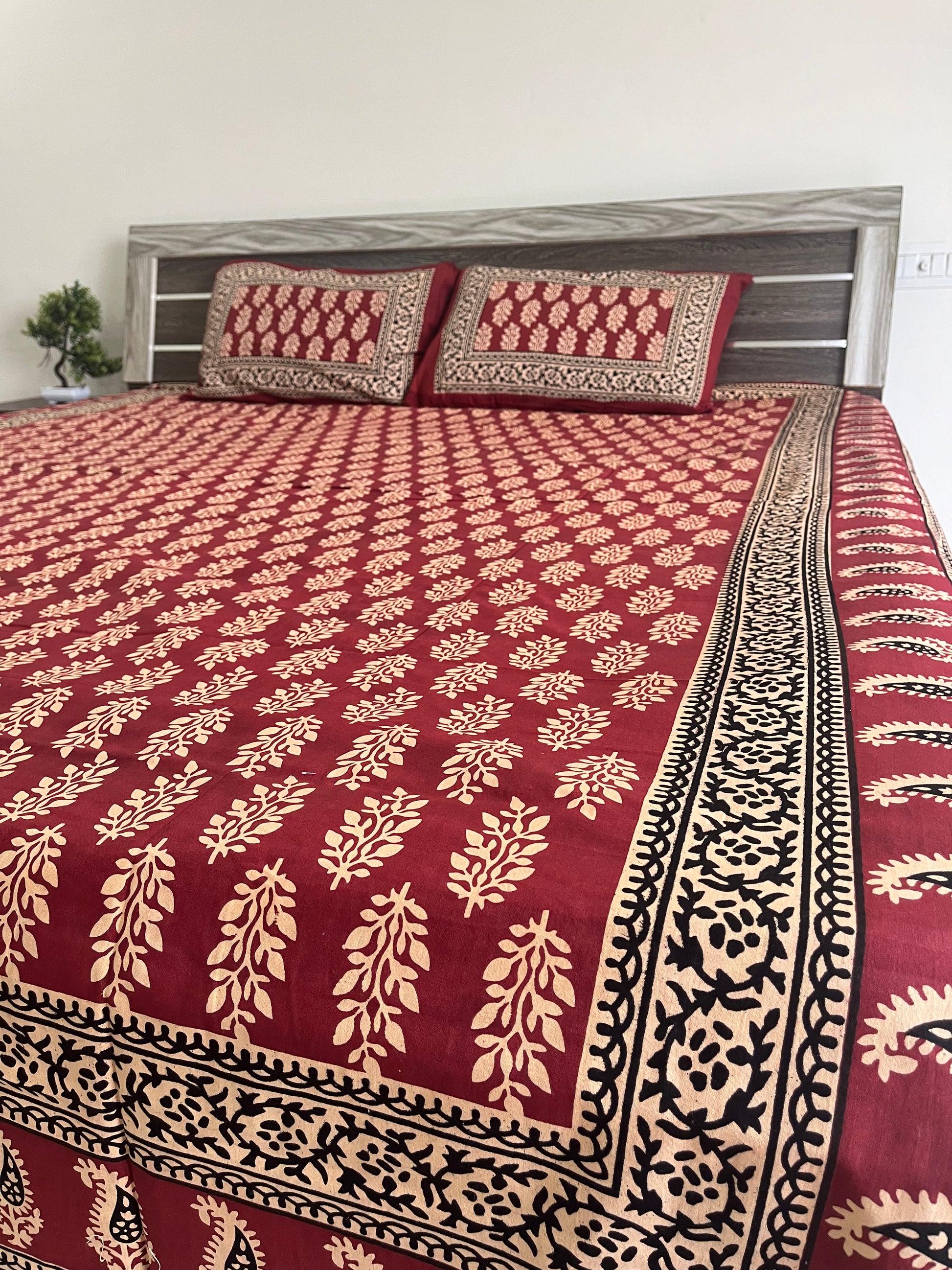 Elevate your bedroom decor with the Red and Gold Barmeri Print Handblock Cotton Double Bedsheet, complete with 2 matching pillow covers. Featuring intricate Barmeri-inspired patterns in rich red and gold hues, this bedsheet is crafted from 100% premium cotton using traditional Indian handblock printing techniques. Its soft, breathable fabric offers lasting comfort and durability, making it perfect for everyday use or festive occasions. Eco-friendly and easy to maintain, this elegant bedding set blends heritage charm with modern style. Shop now to add a touch of luxury and tradition to your home!