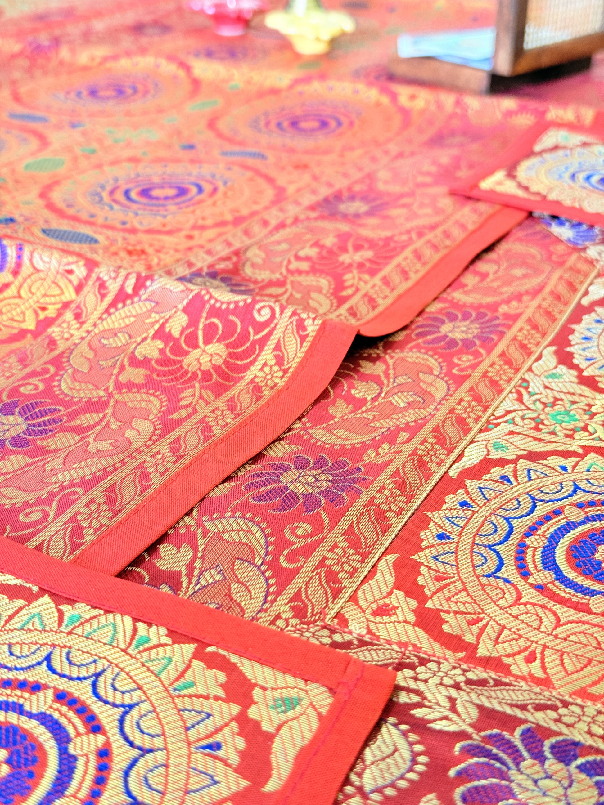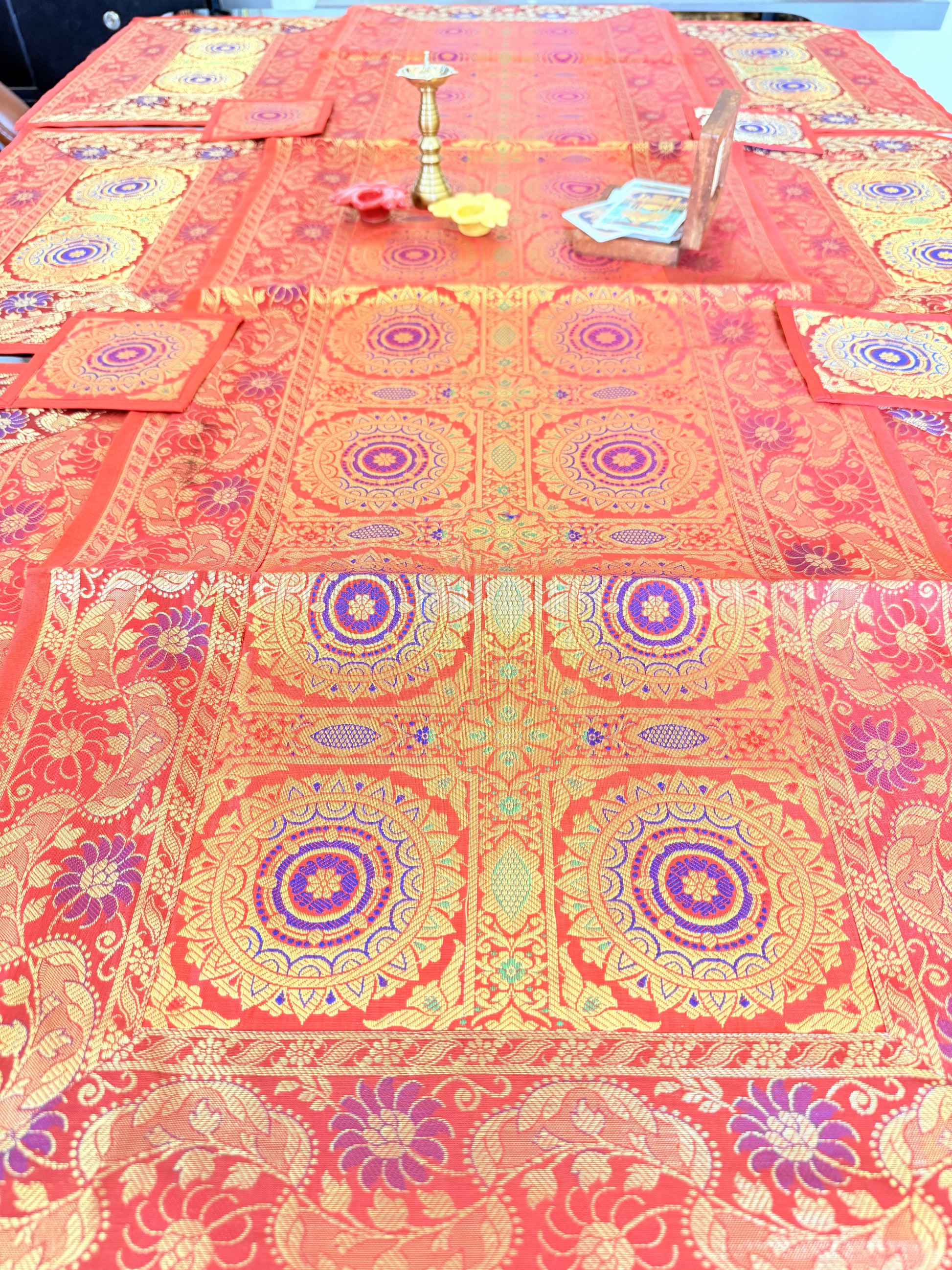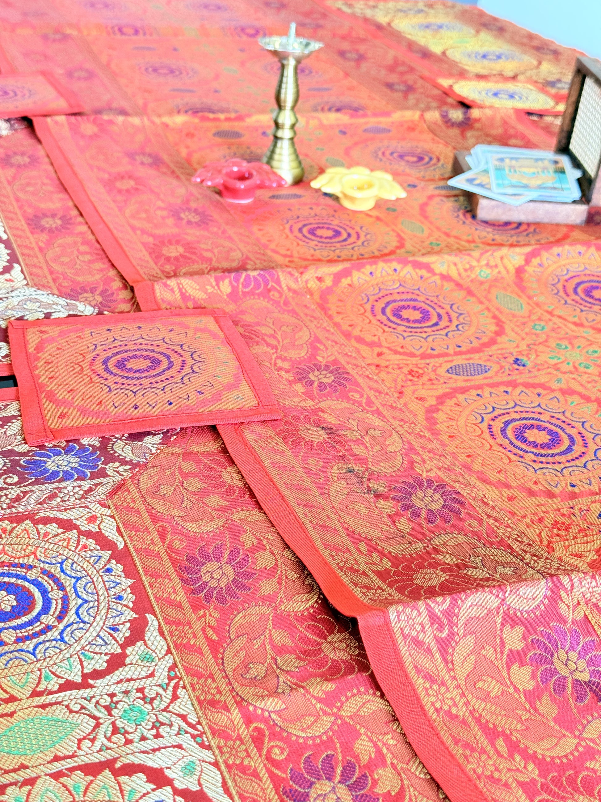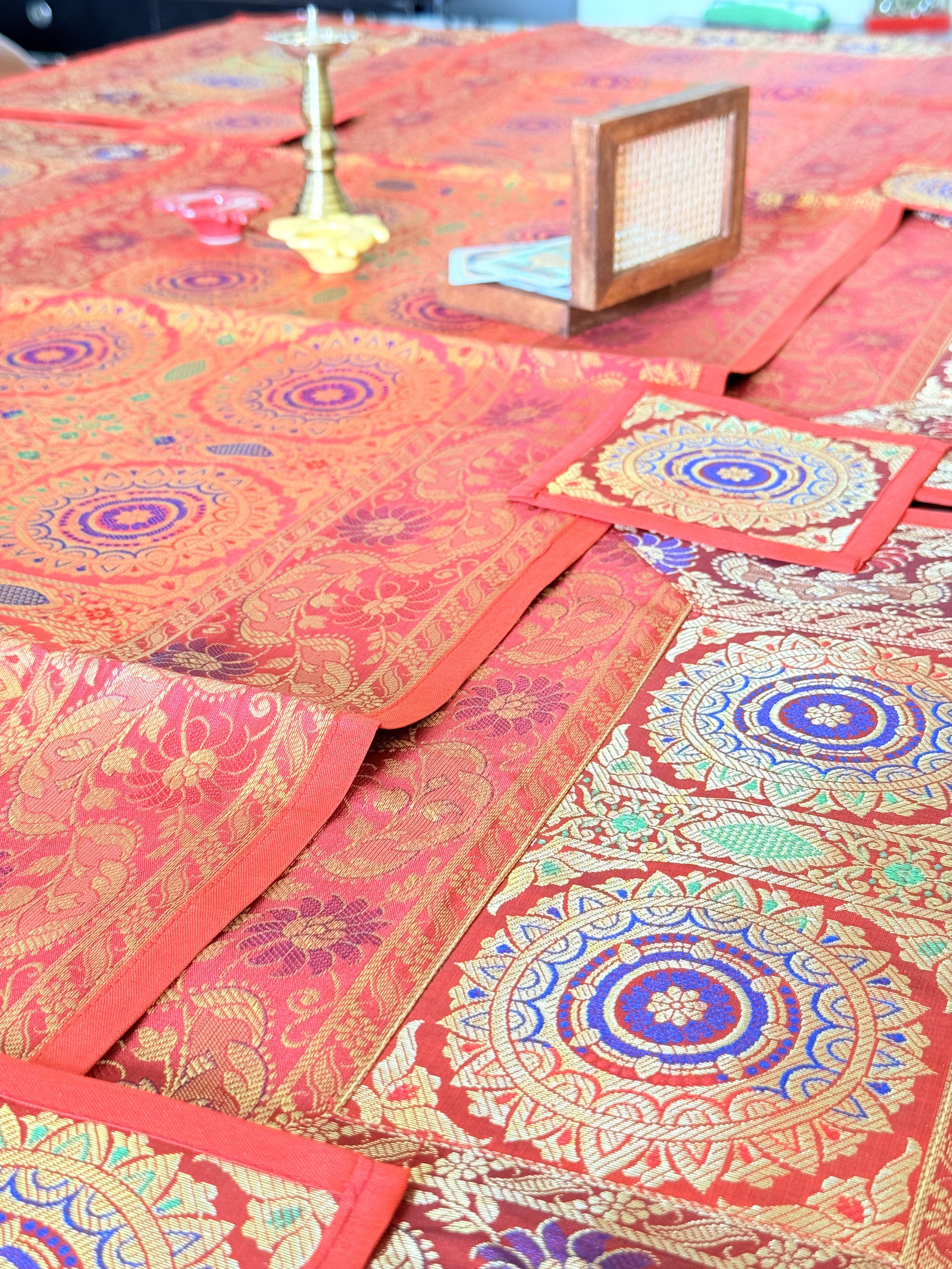 Red Banarasi Silk Decorative Festive Runner Mat and Coaster Set