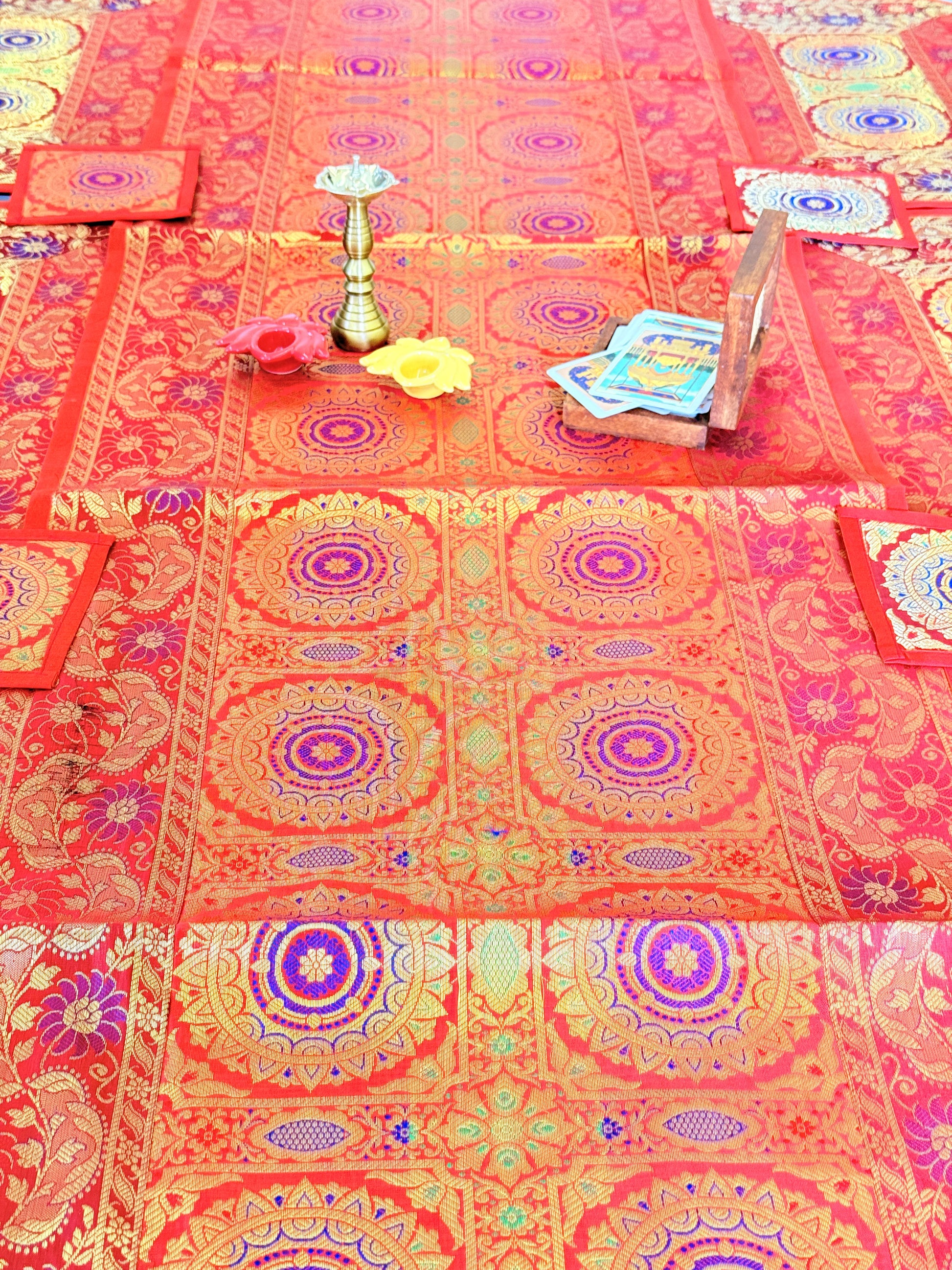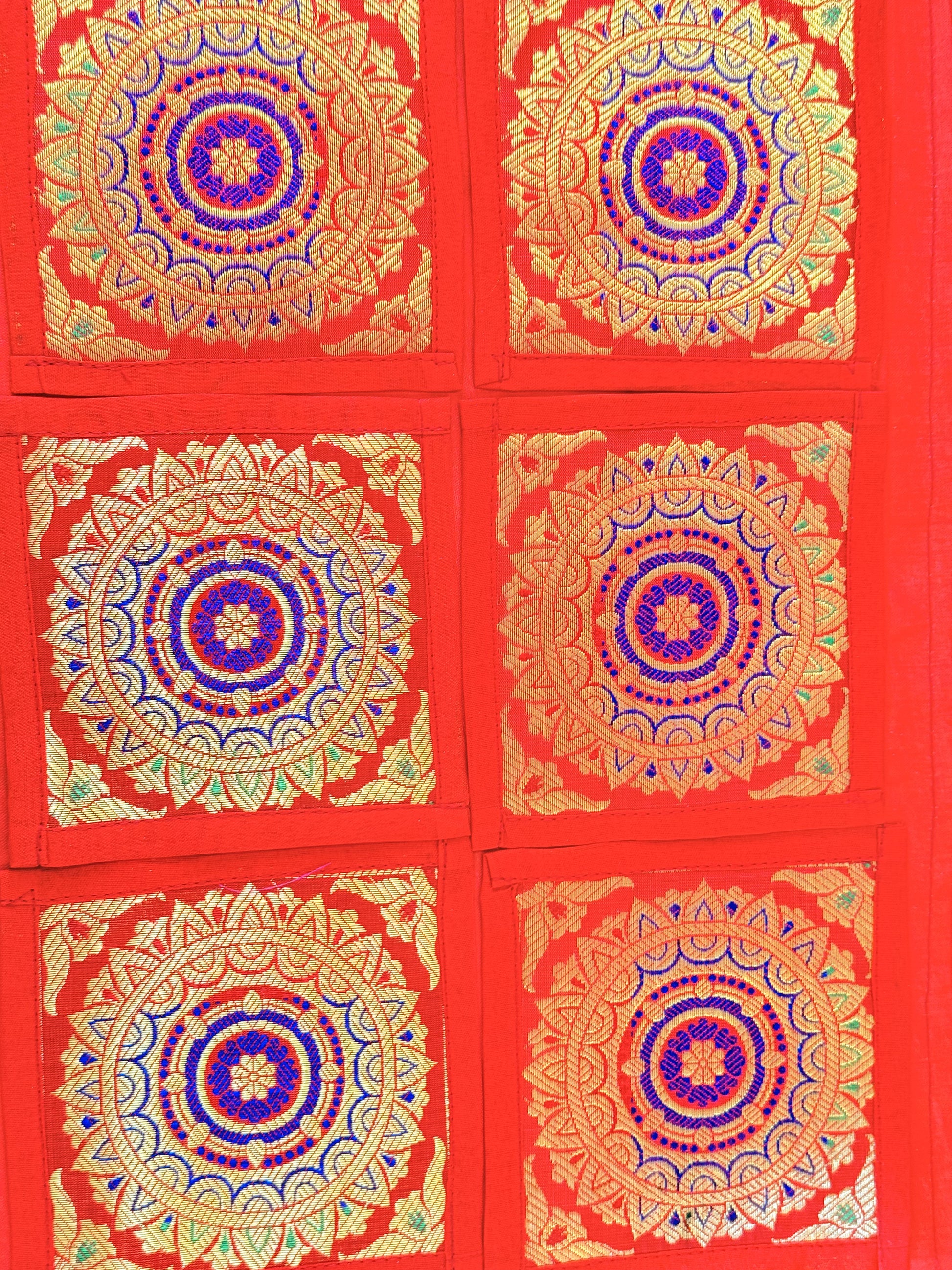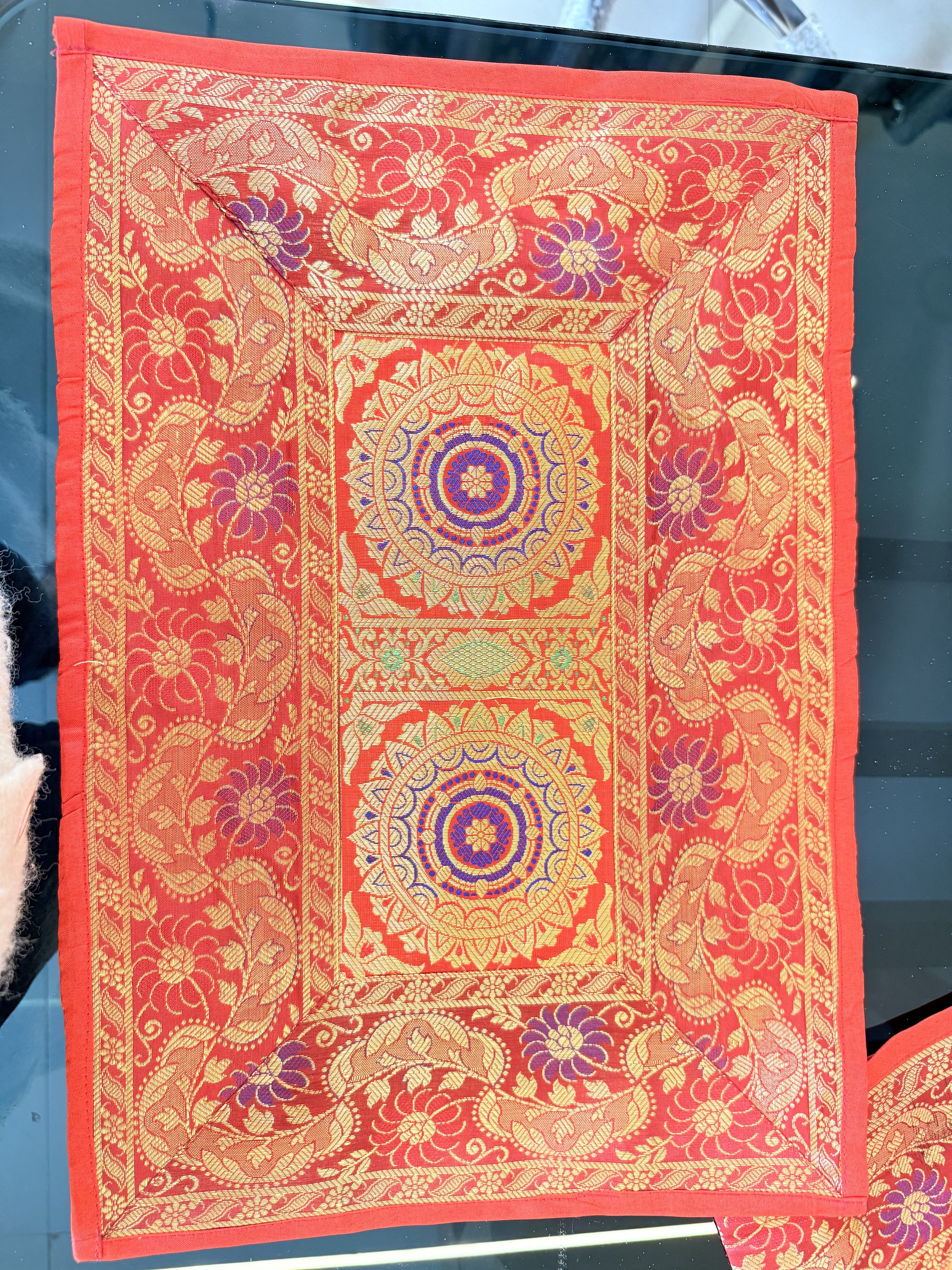 Add a touch of opulence to your home décor with the Red Banarasi Silk Decorative Festive Runner Mat and Coaster Set. Crafted from premium Banarasi silk, this exquisite set features intricate golden brocade detailing, reflecting the grandeur of traditional craftsmanship. The rich red hue combined with delicate gold accents makes it an ideal choice for festive gatherings, elegant dining settings, or adding a luxurious flair to your everyday décor.