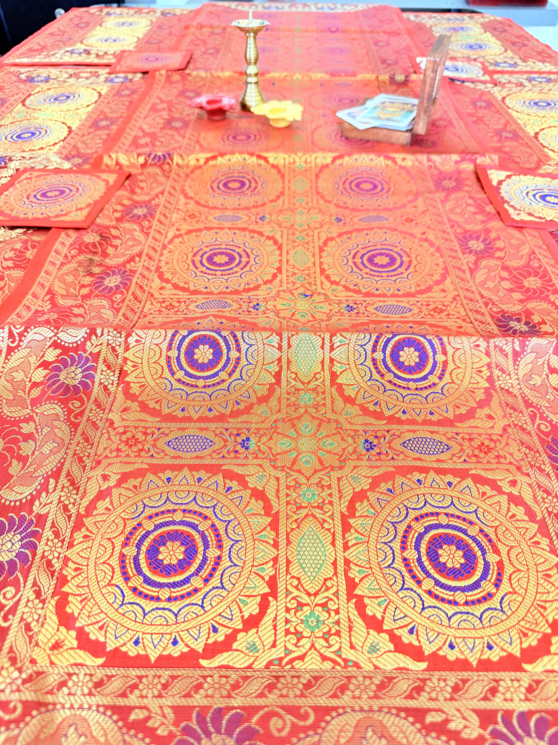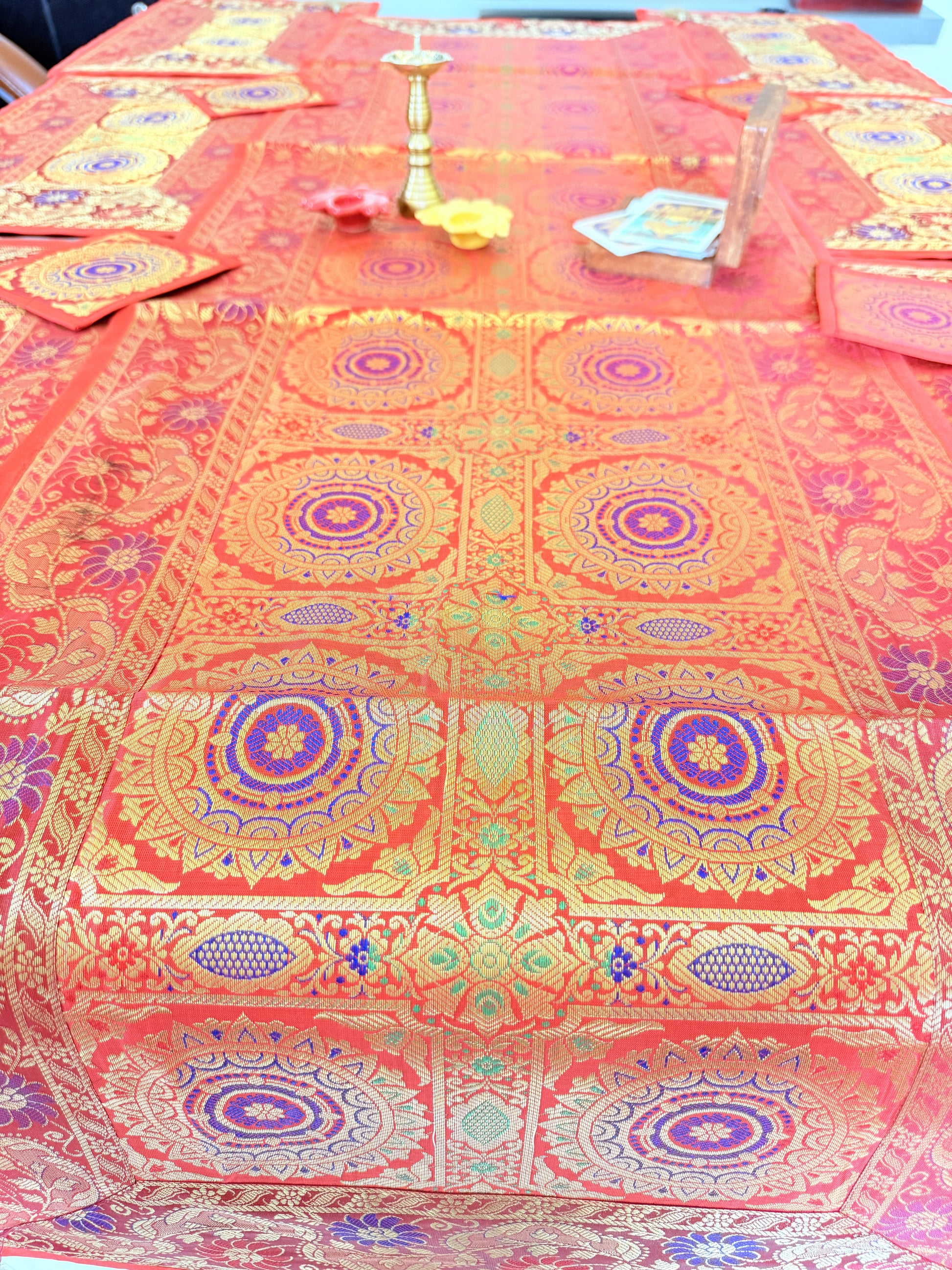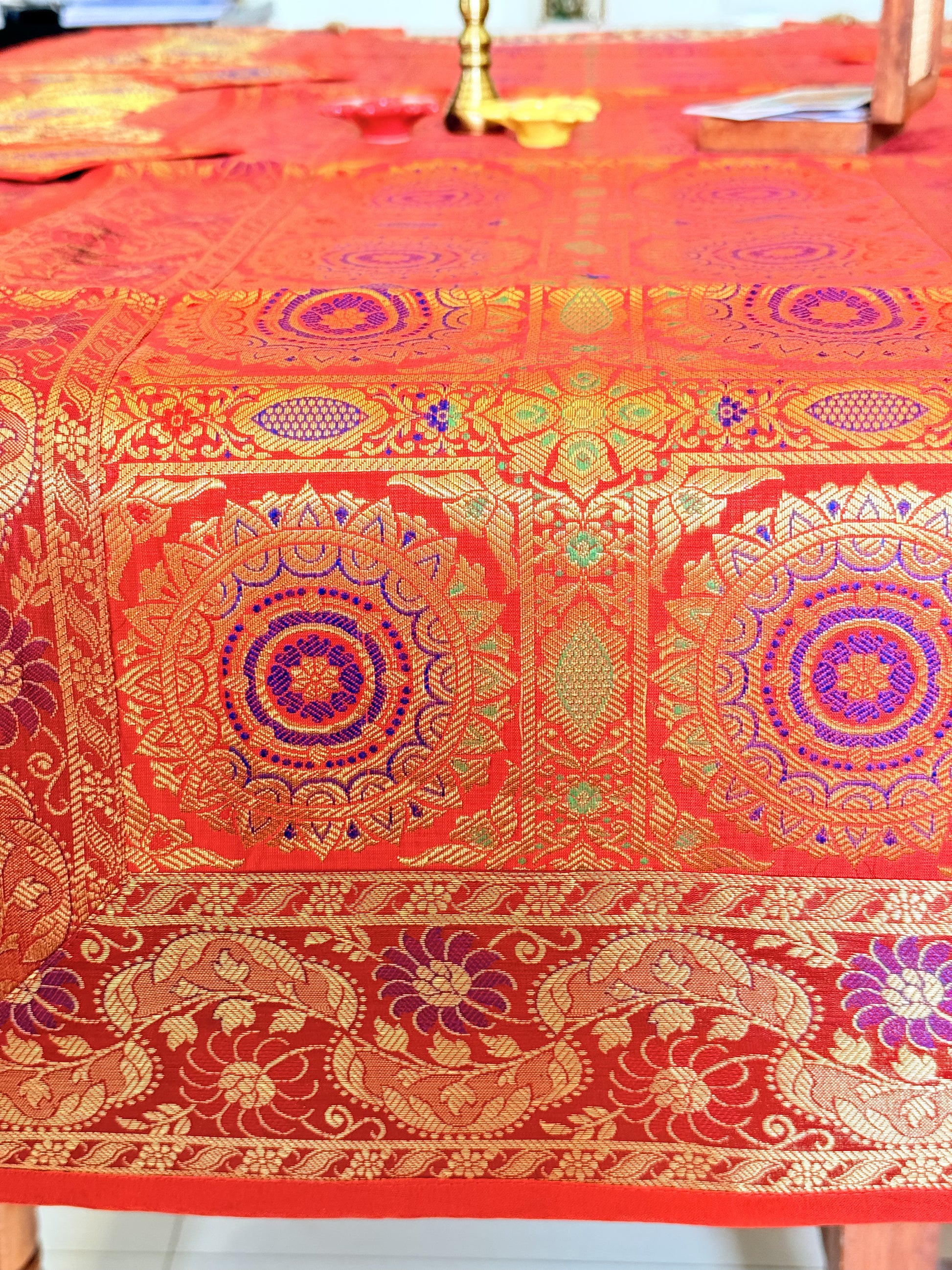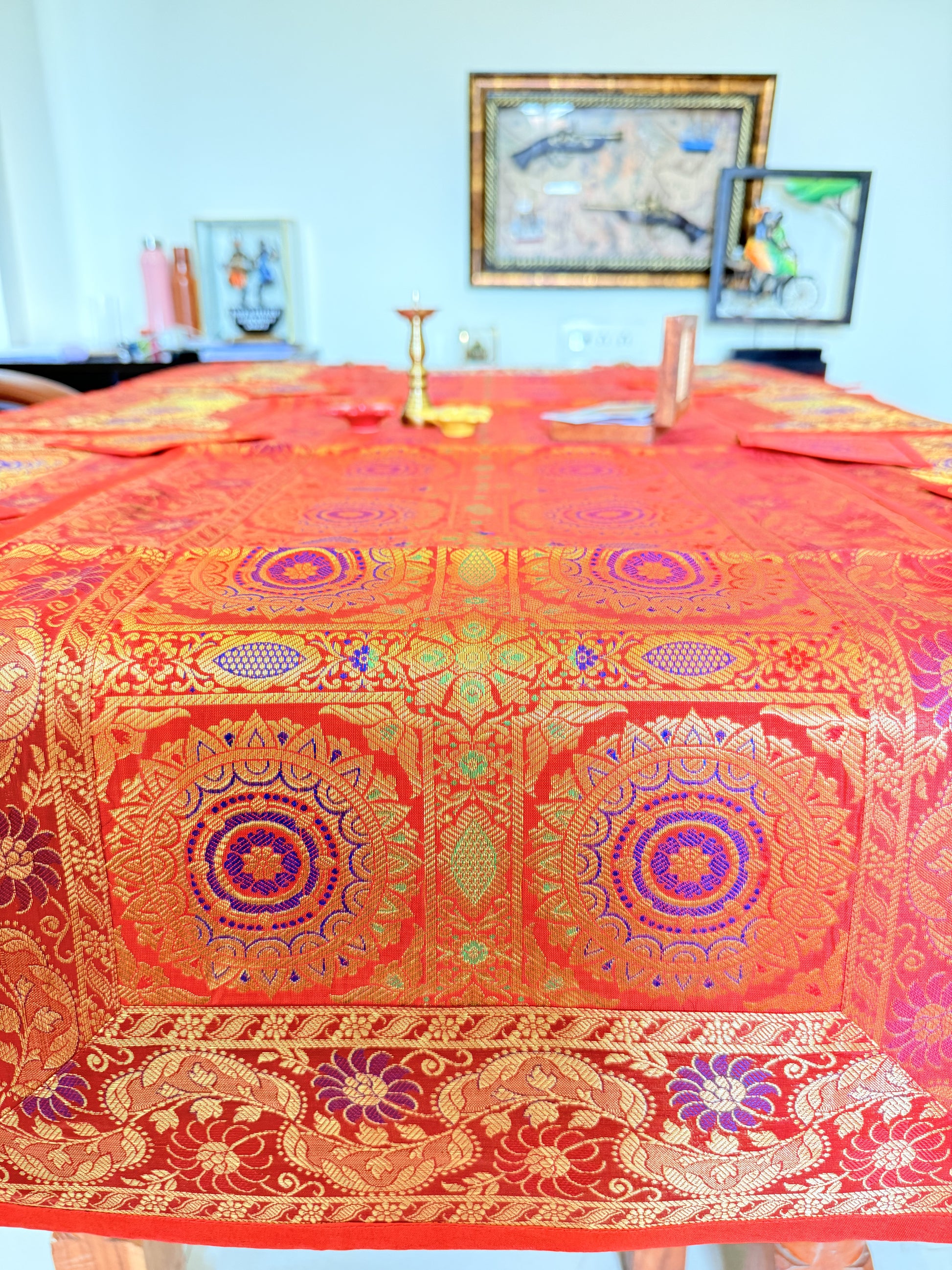 Elevate your table setting with this Red Banarasi Silk Decorative Festive Runner Mat and Coaster Set, perfect for festivals, celebrations, or adding a royal touch to your home décor!