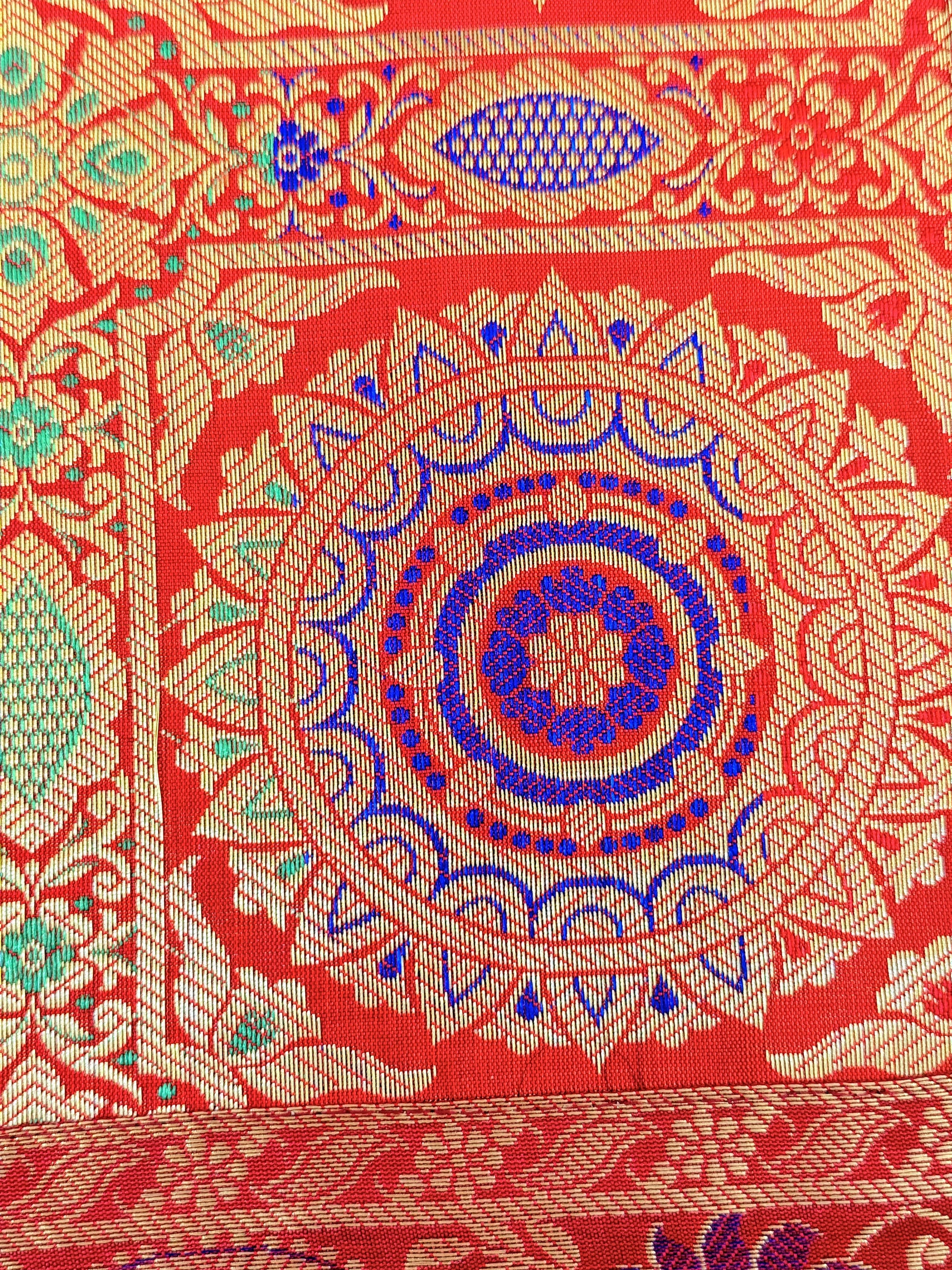 - Color: Luxurious Red Banarasi Silk with intricate gold brocade accents.