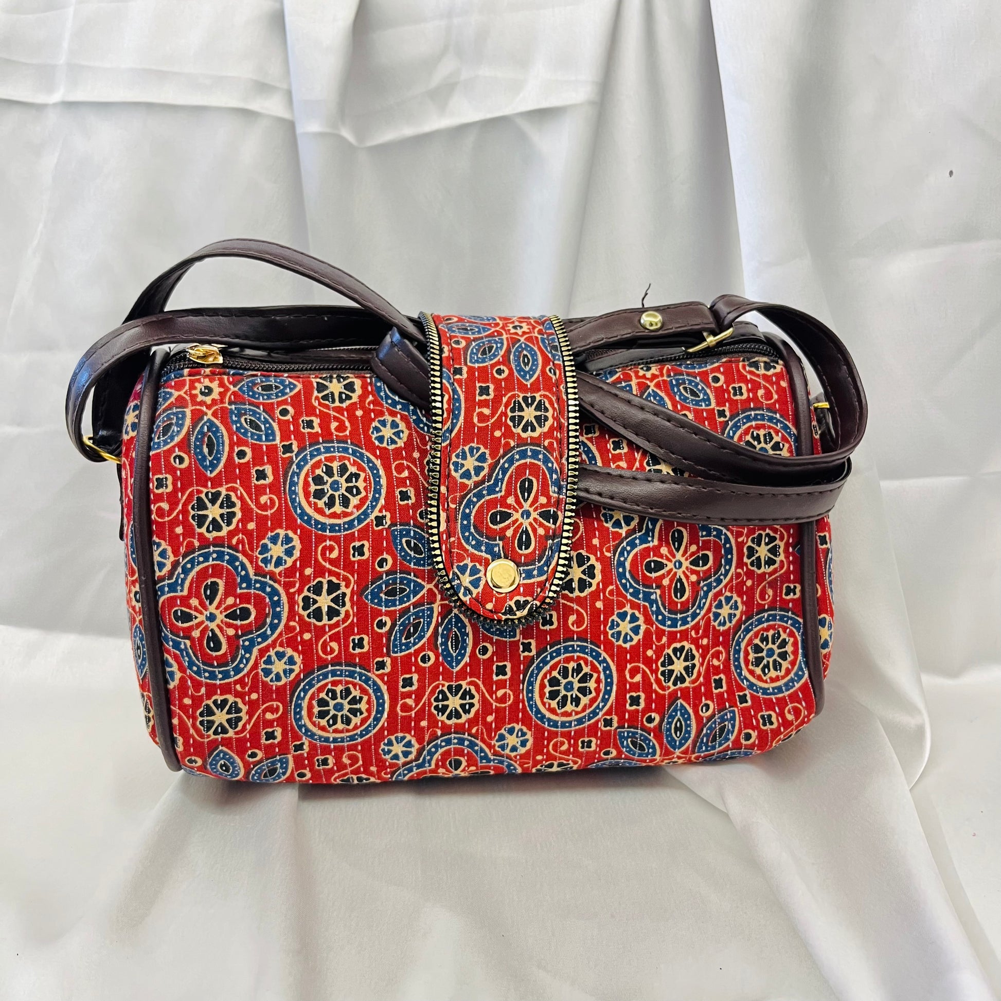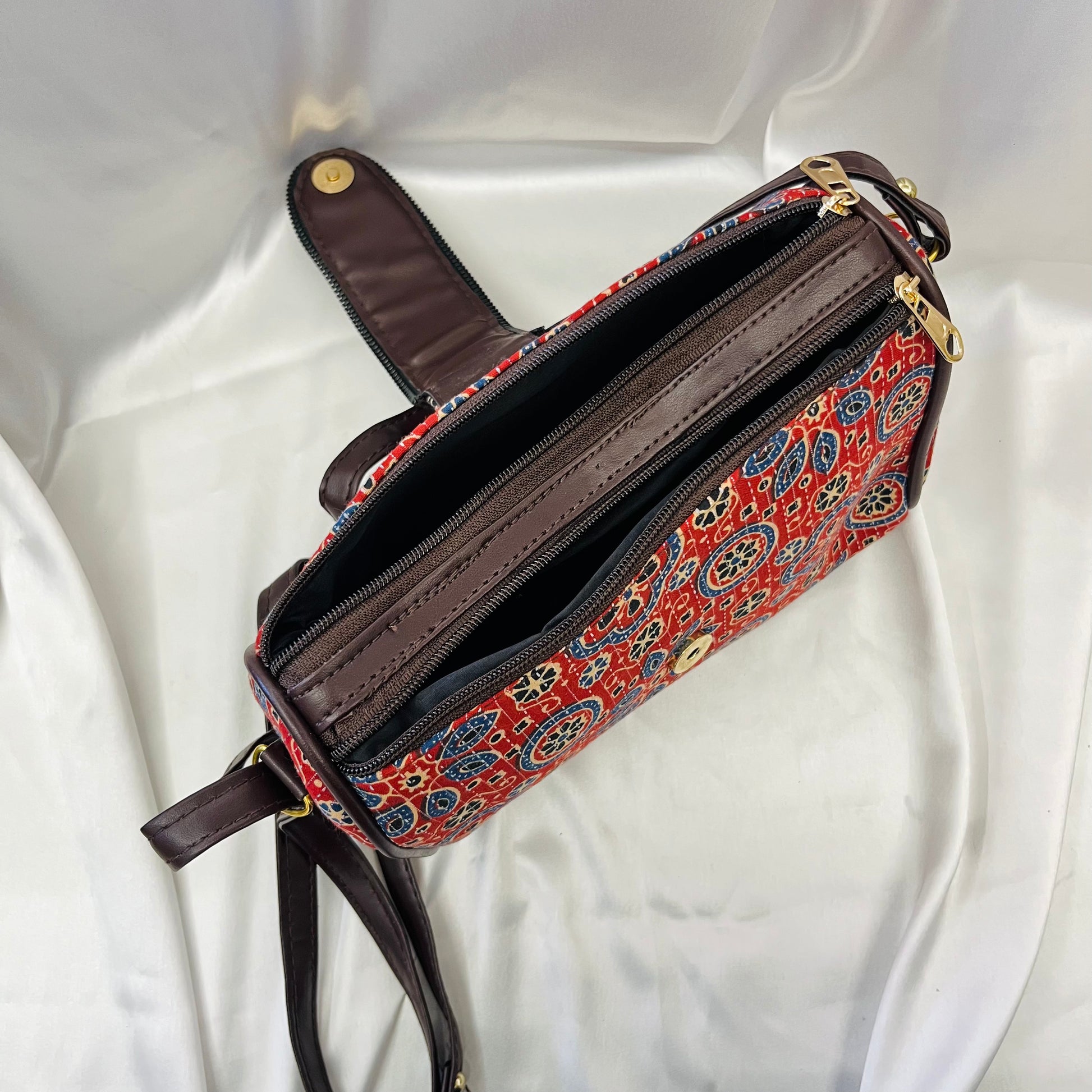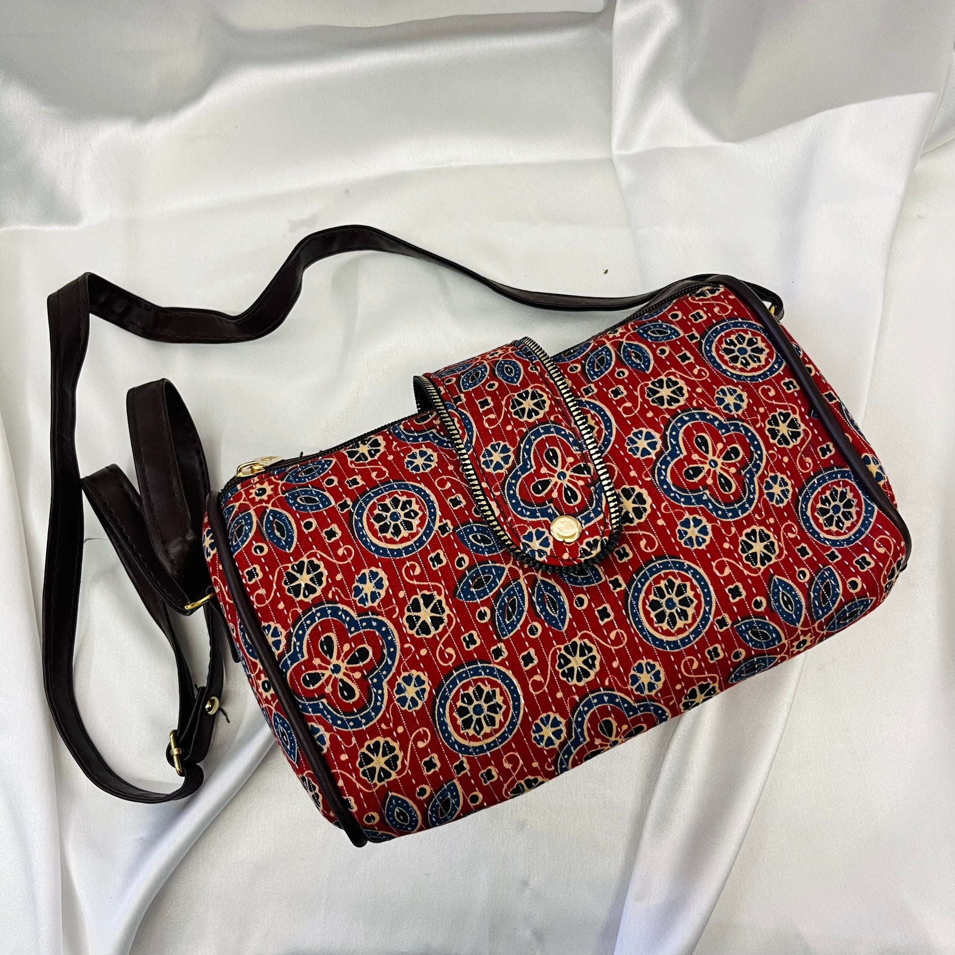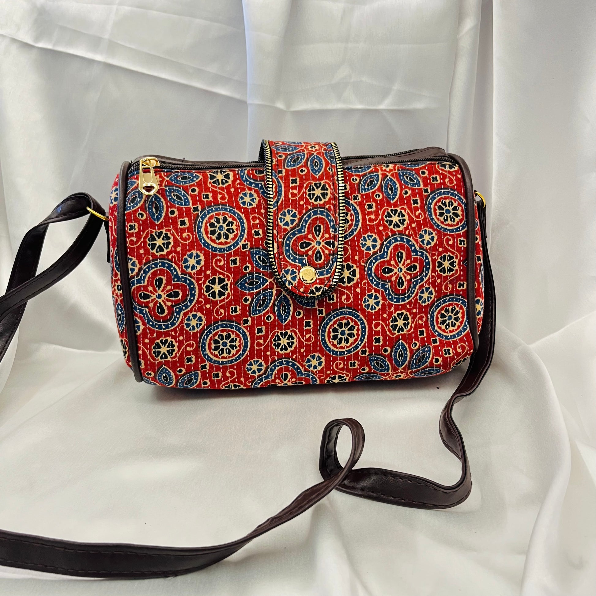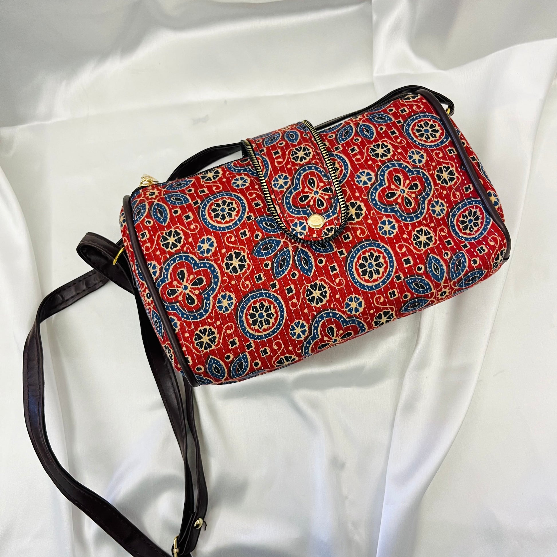 Make a vibrant style statement with this Red Handblock Printed Sling Bag, adorned with a stunning mix of floral and geometric motifs in blue, black, and off-white. This handcrafted bag is a beautiful representation of traditional Indian block printing, blending classic charm with a modern silhouette.