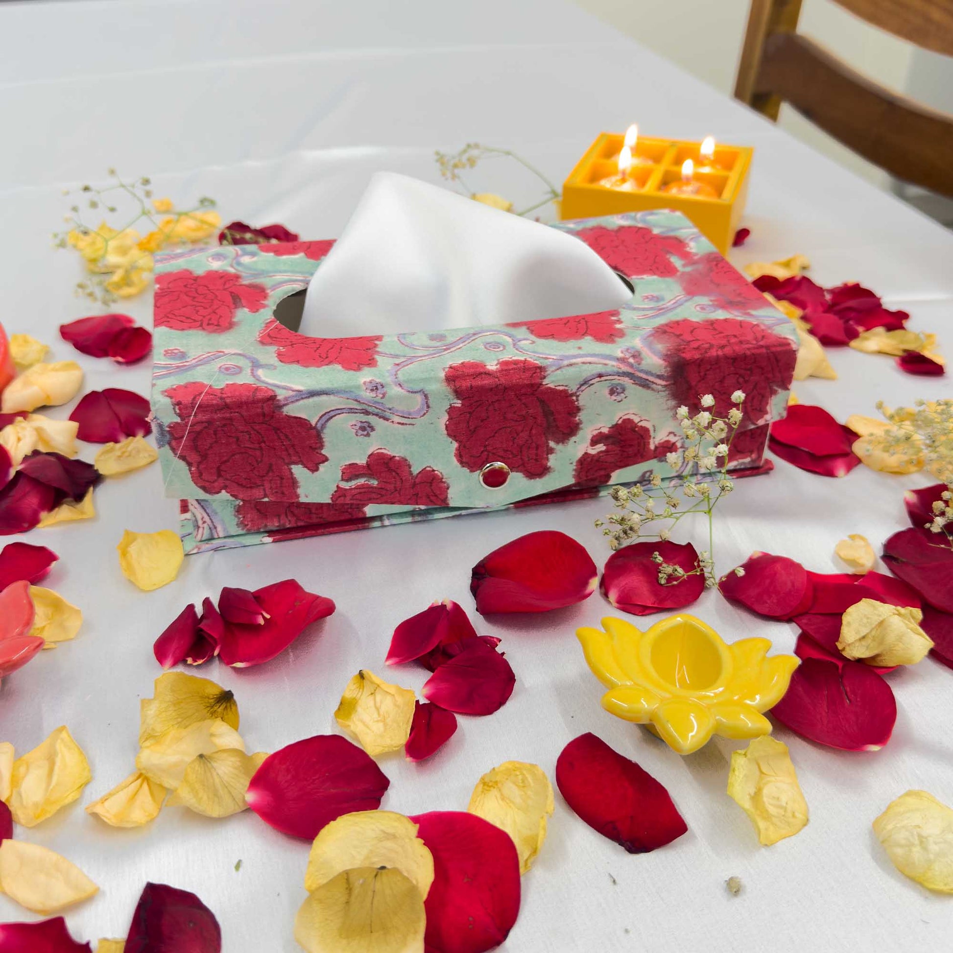 Upgrade your tissue box game with our Handblock Tissue Box! Hand-pressed with exquisite details, this box adds a touch of elegance to any room. Keep your tissues organized and easily accessible in a stylish and unique way. Say goodbye to boring tissue boxes and hello to a functional decor piece.