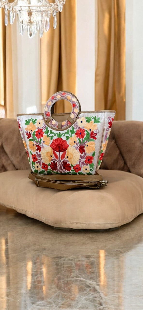 Make a style statement with the Red Floral White Kashmiri Embroidery Bag, a perfect blend of traditional craftsmanship and modern elegance. This handcrafted tote features intricate Kashmiri embroidery with vibrant red floral patterns, beautifully contrasted against a white base for a timeless and sophisticated look. Designed for both style and functionality, this bag offers ample space to carry your essentials with ease. Whether you're heading to a casual outing, festive event, or need a standout accessory, this bag is the ideal choice for adding charm and elegance to any outfit.