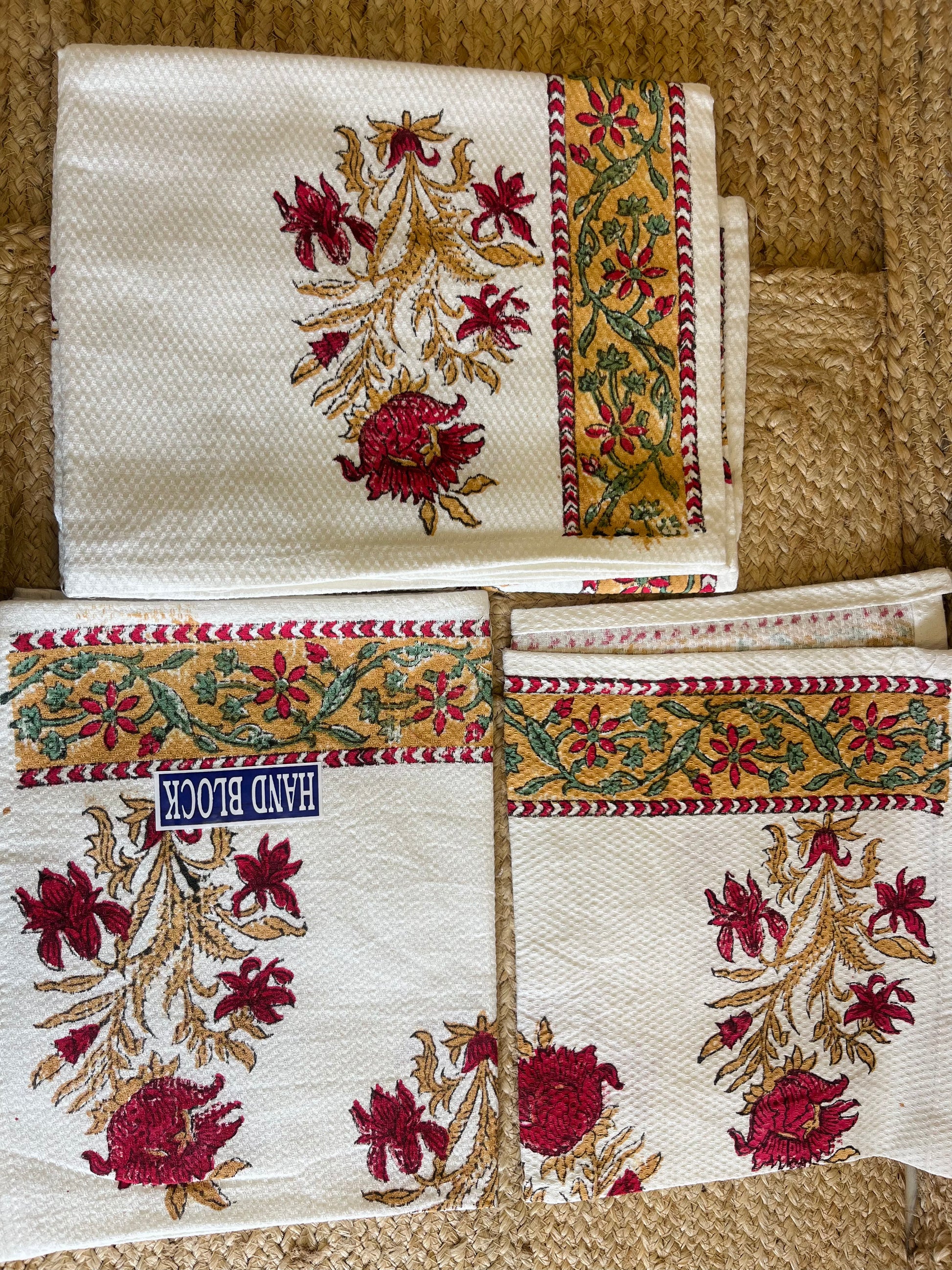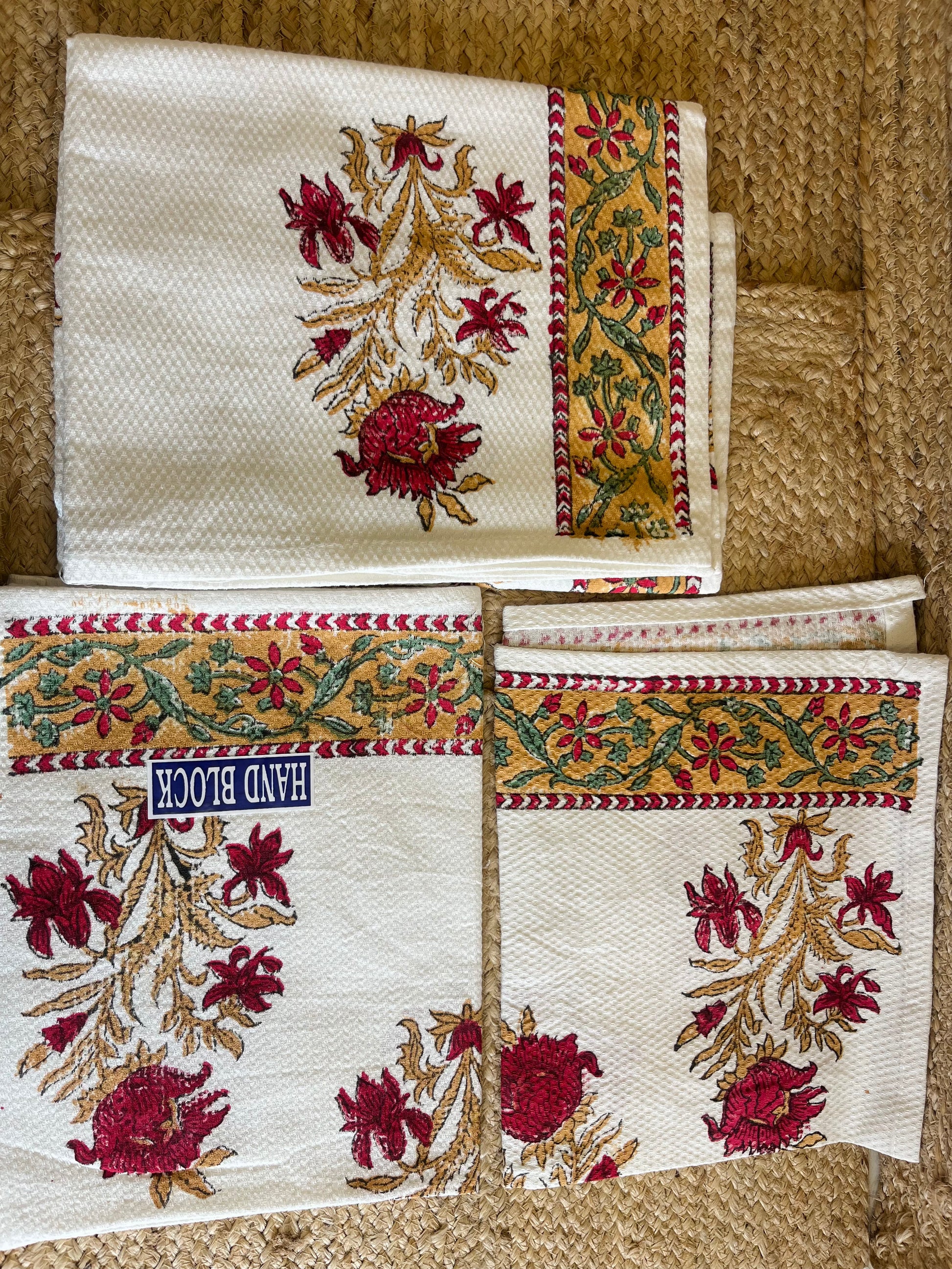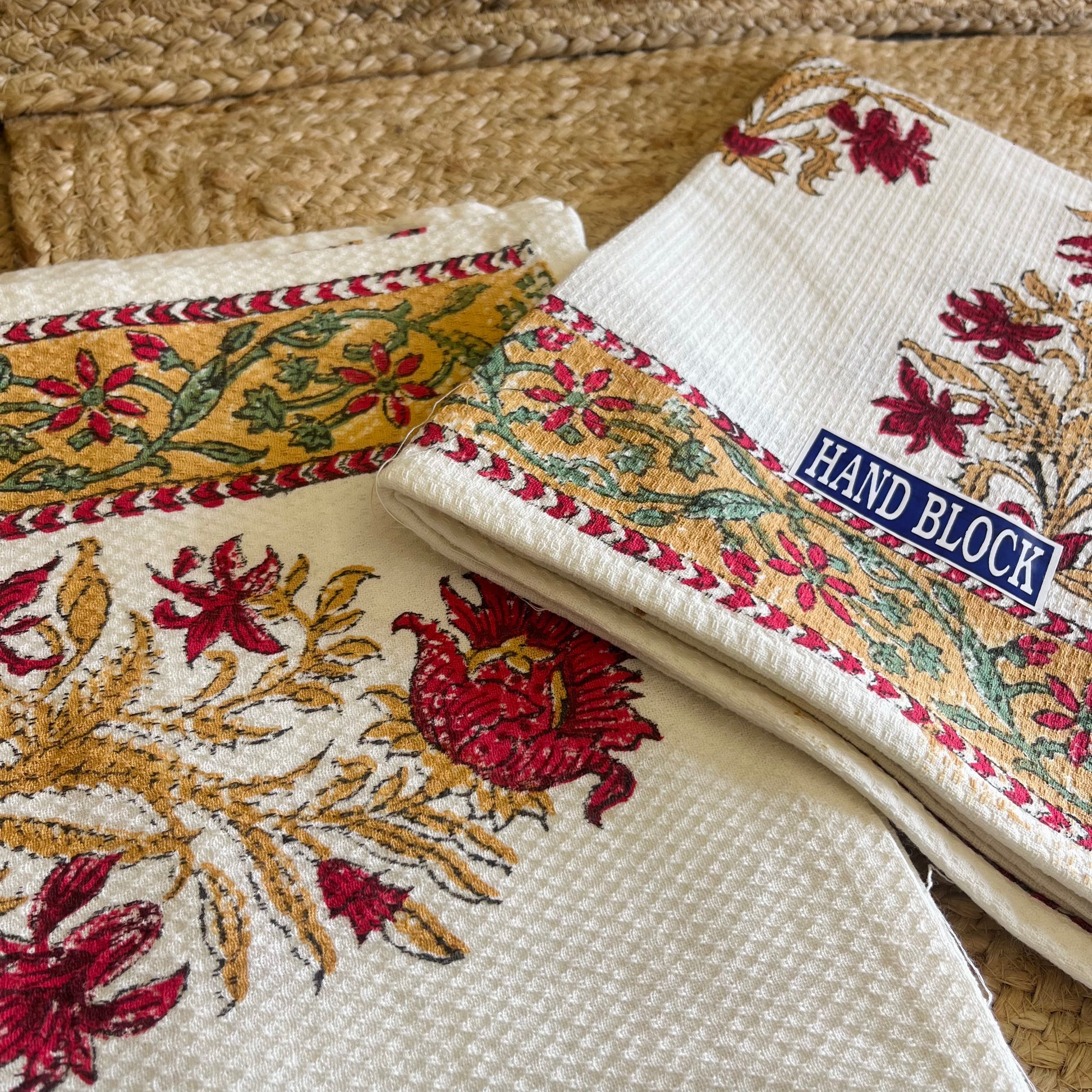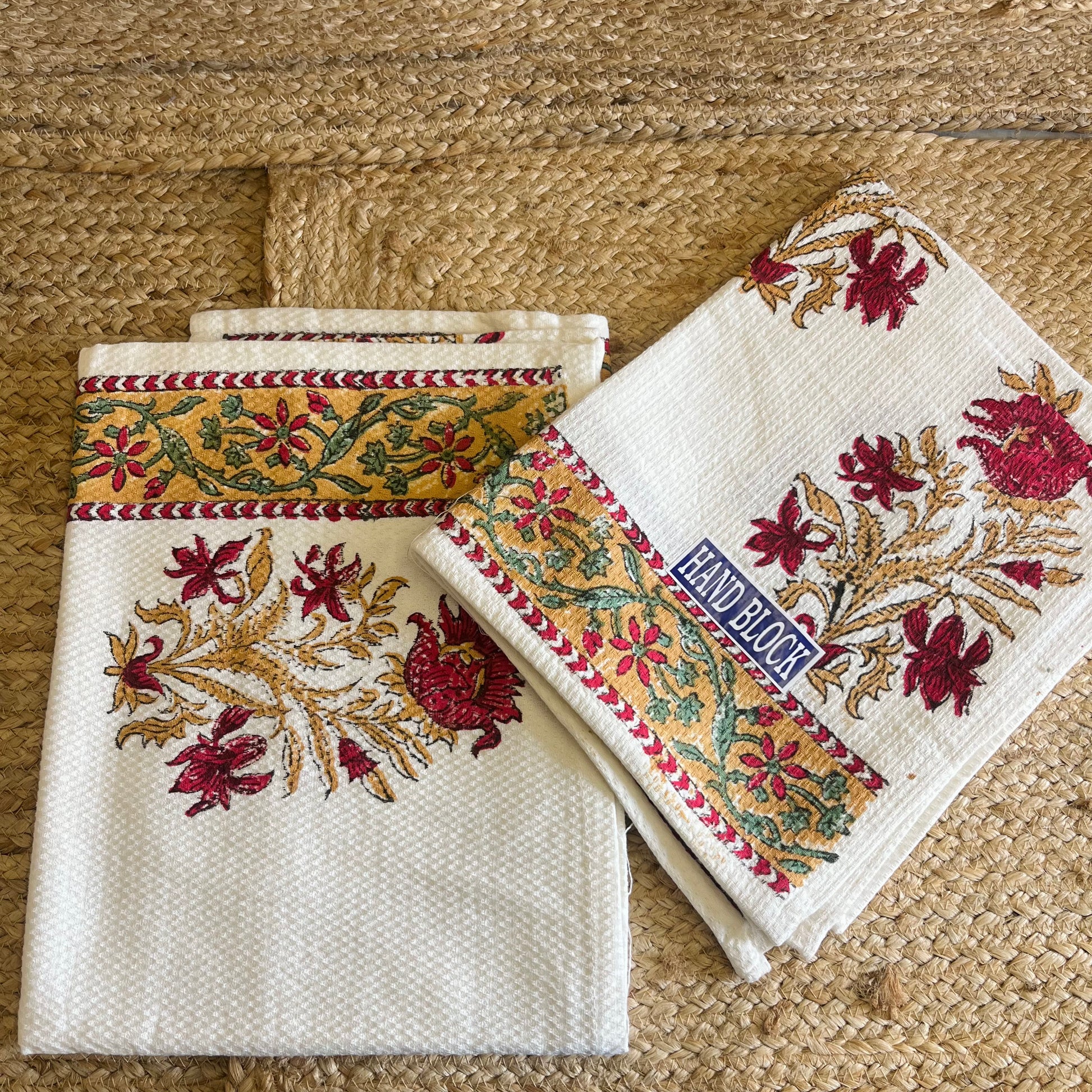 Red Golden Plant Handblock Waffle Cotton Towel Set