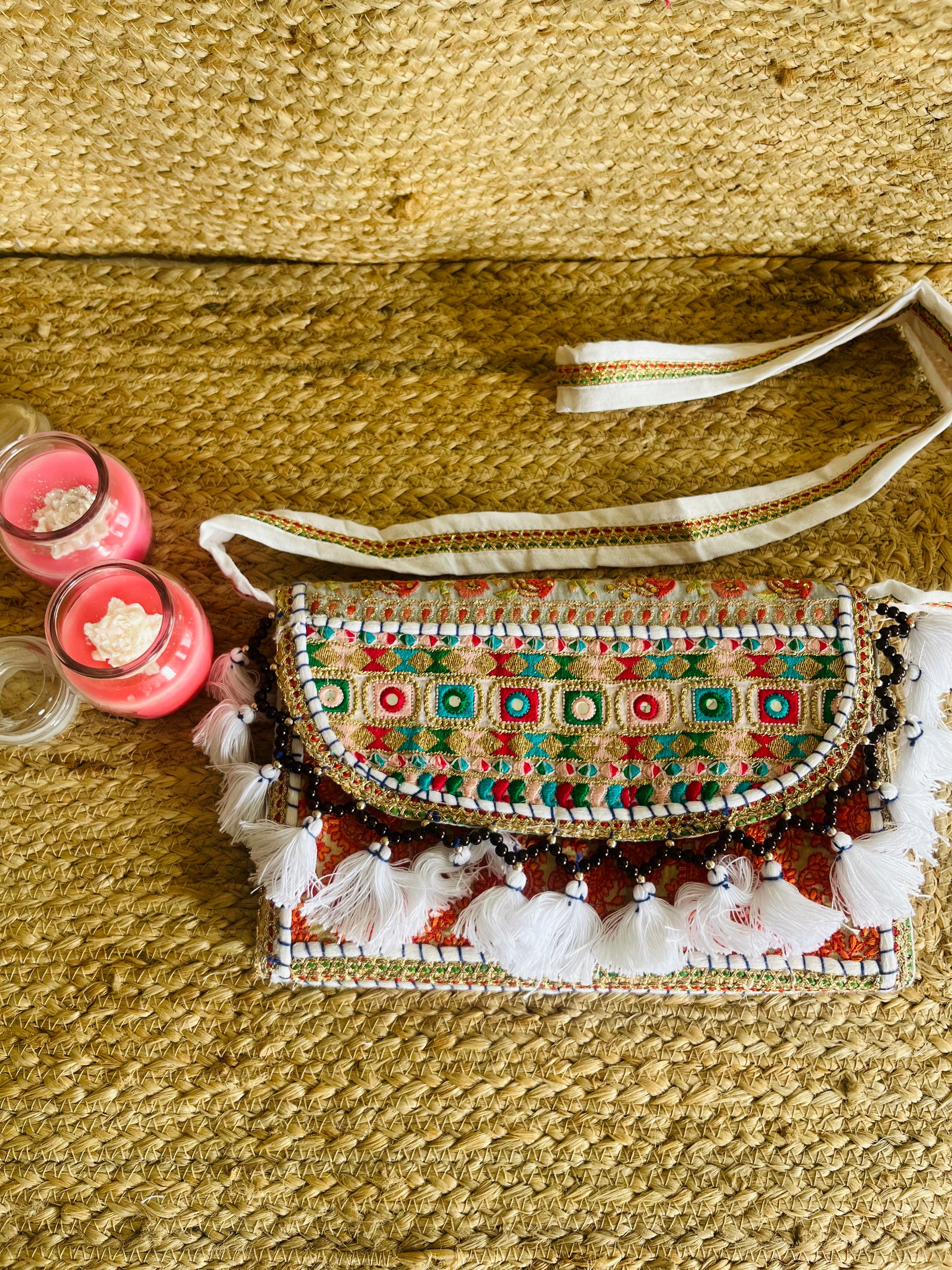 Carry a piece of Rajasthani heritage with you! This Hand-Embroidered Patchwork Sling Bag is a true masterpiece, featuring exquisite hand embroidery and patchwork designs that make each bag one of a kind. Crafted from high-quality cotton, this lightweight yet durable bag is adorned with intricate stone embellishments and finished with charming cotton tassels, adding a touch of bohemian elegance to your look.