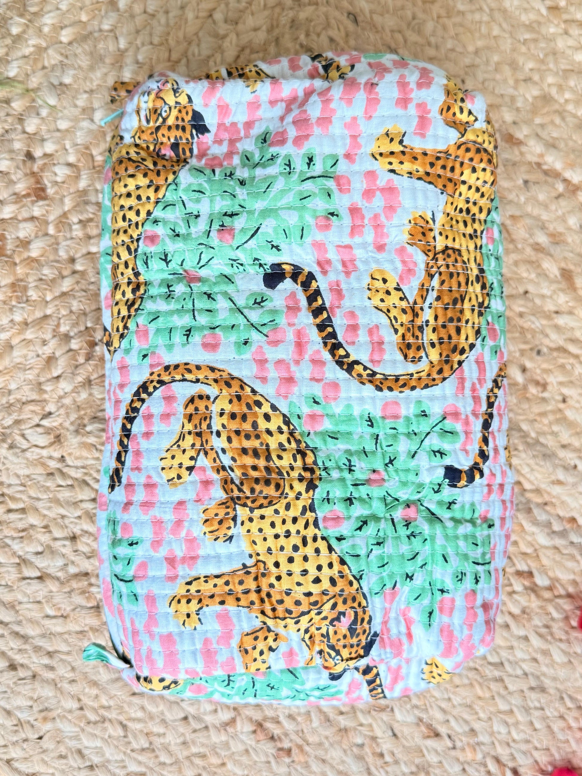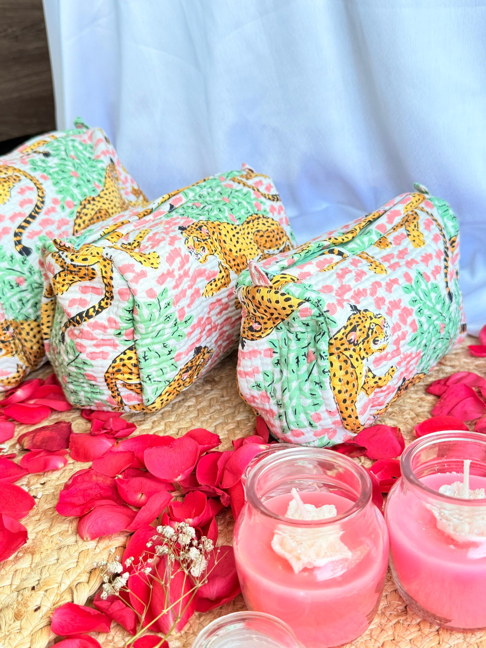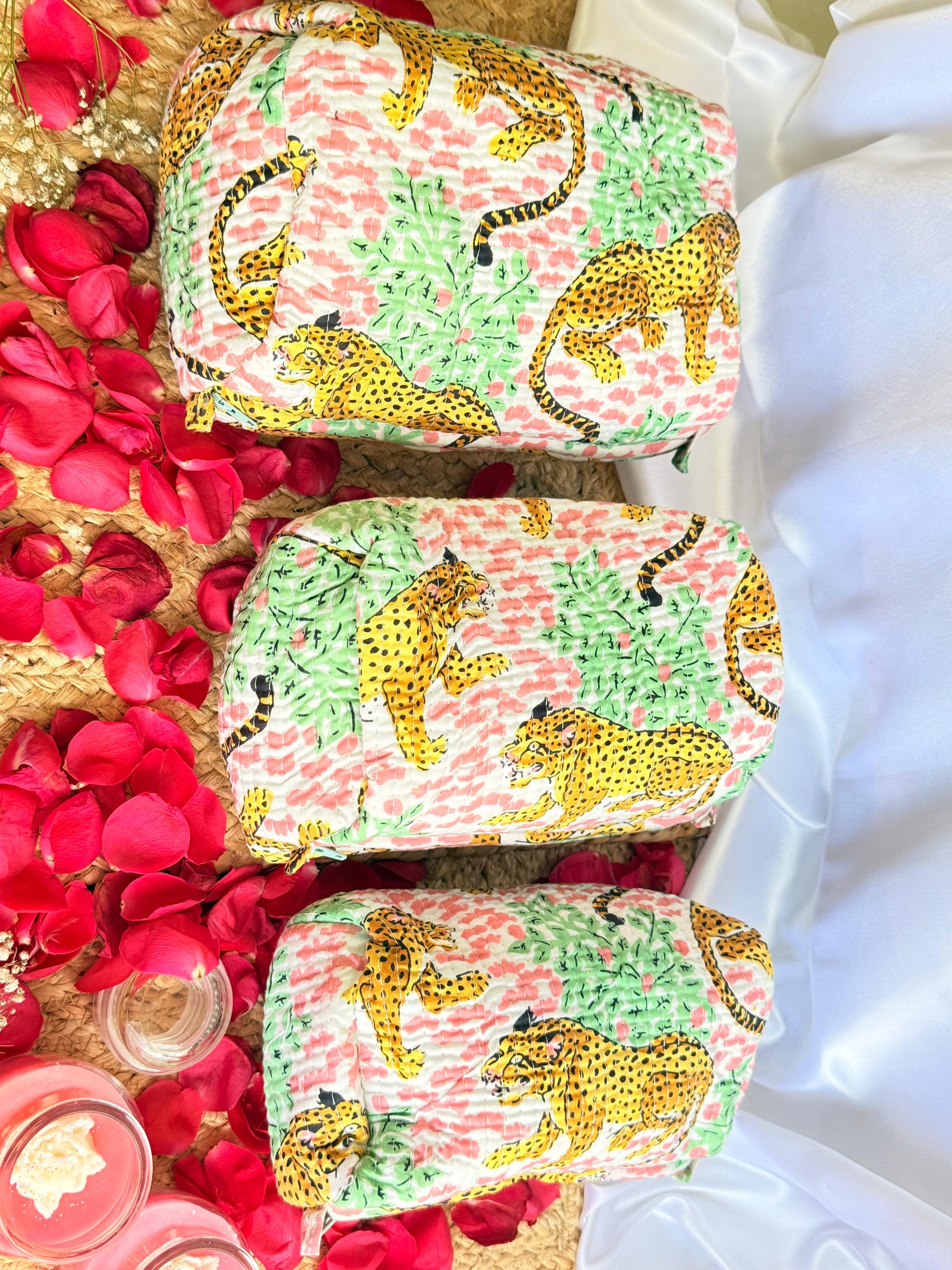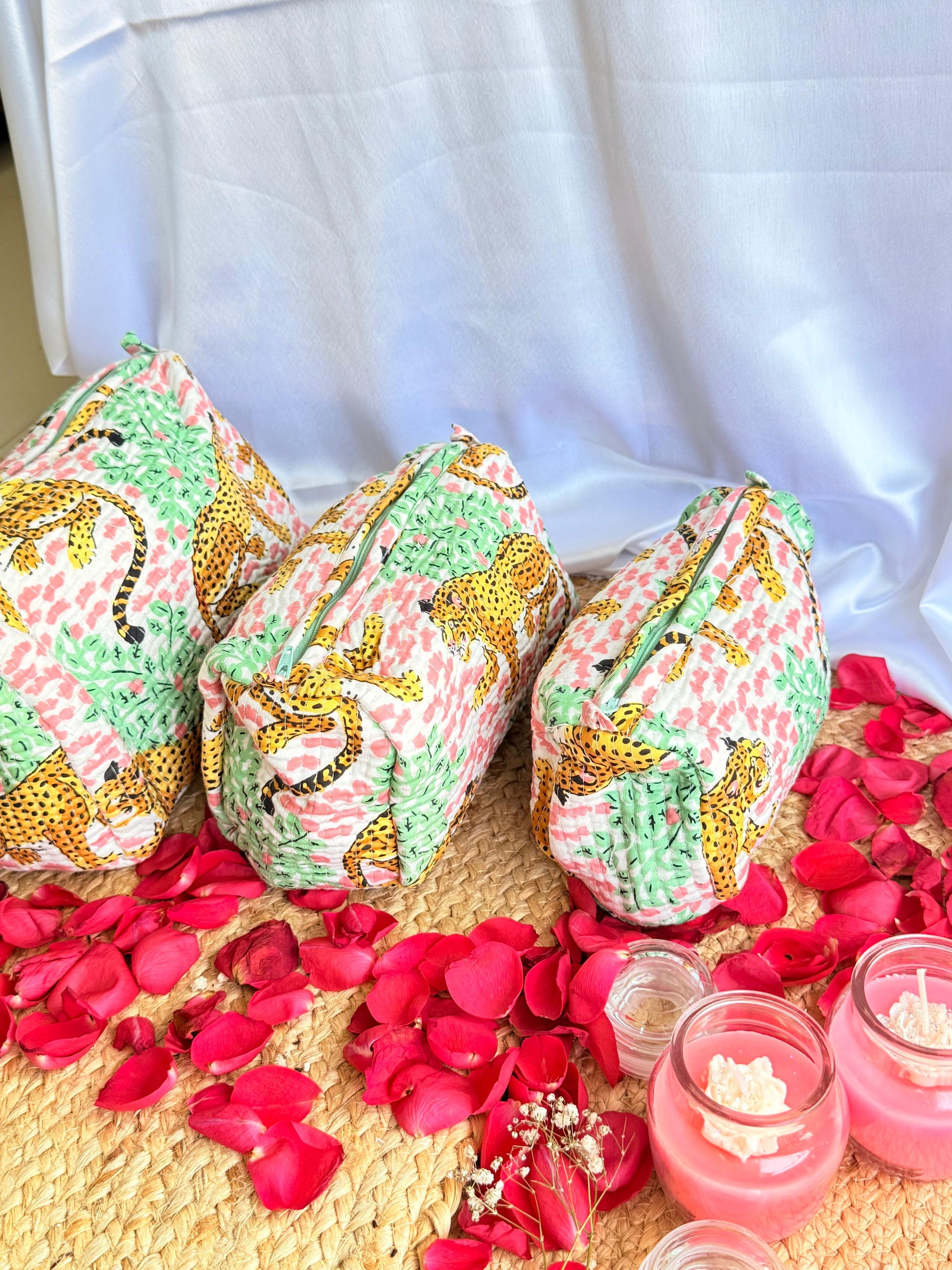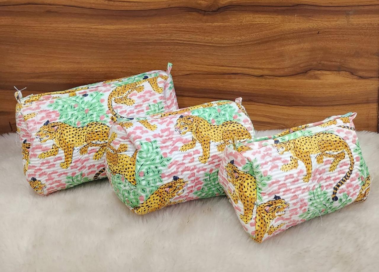 Pink Animal Print Handblock Travel Pouch Organizer Set of 3