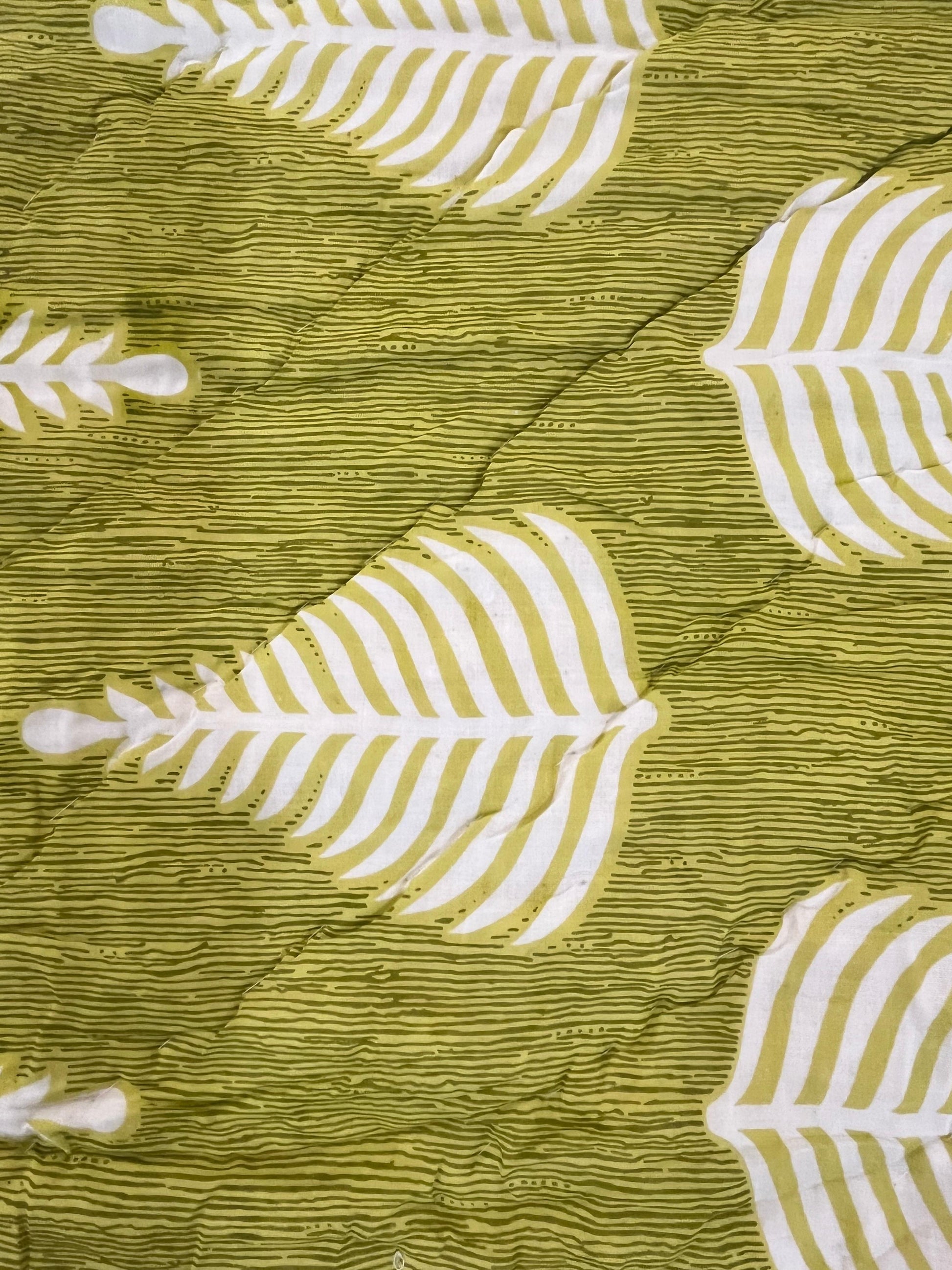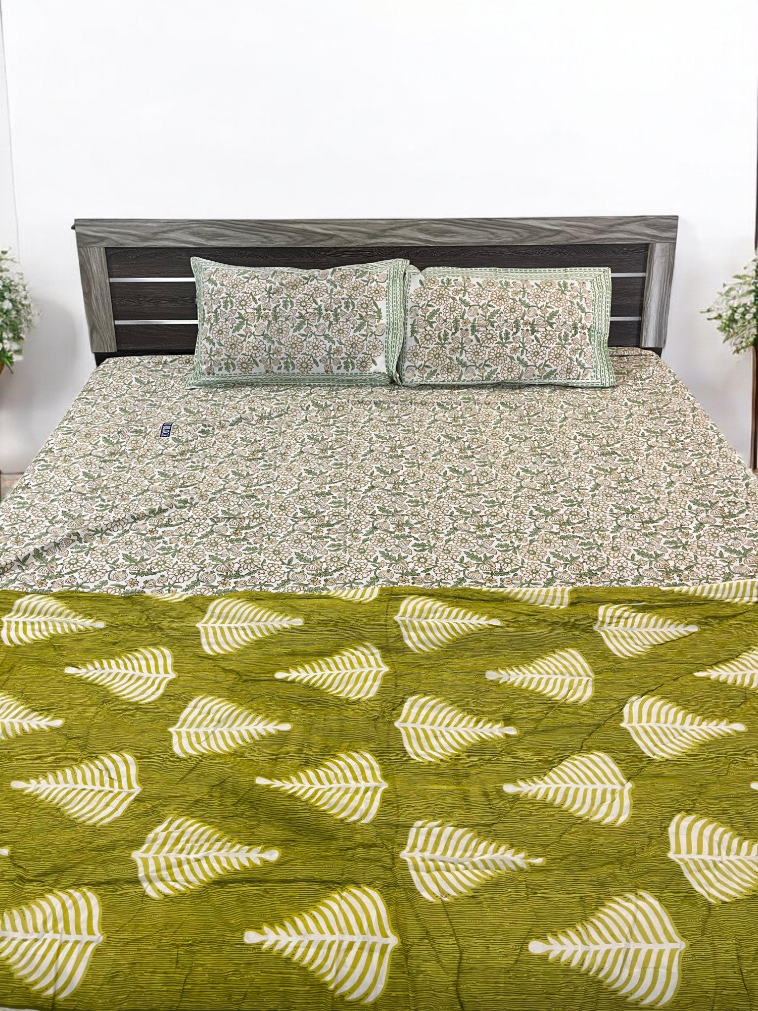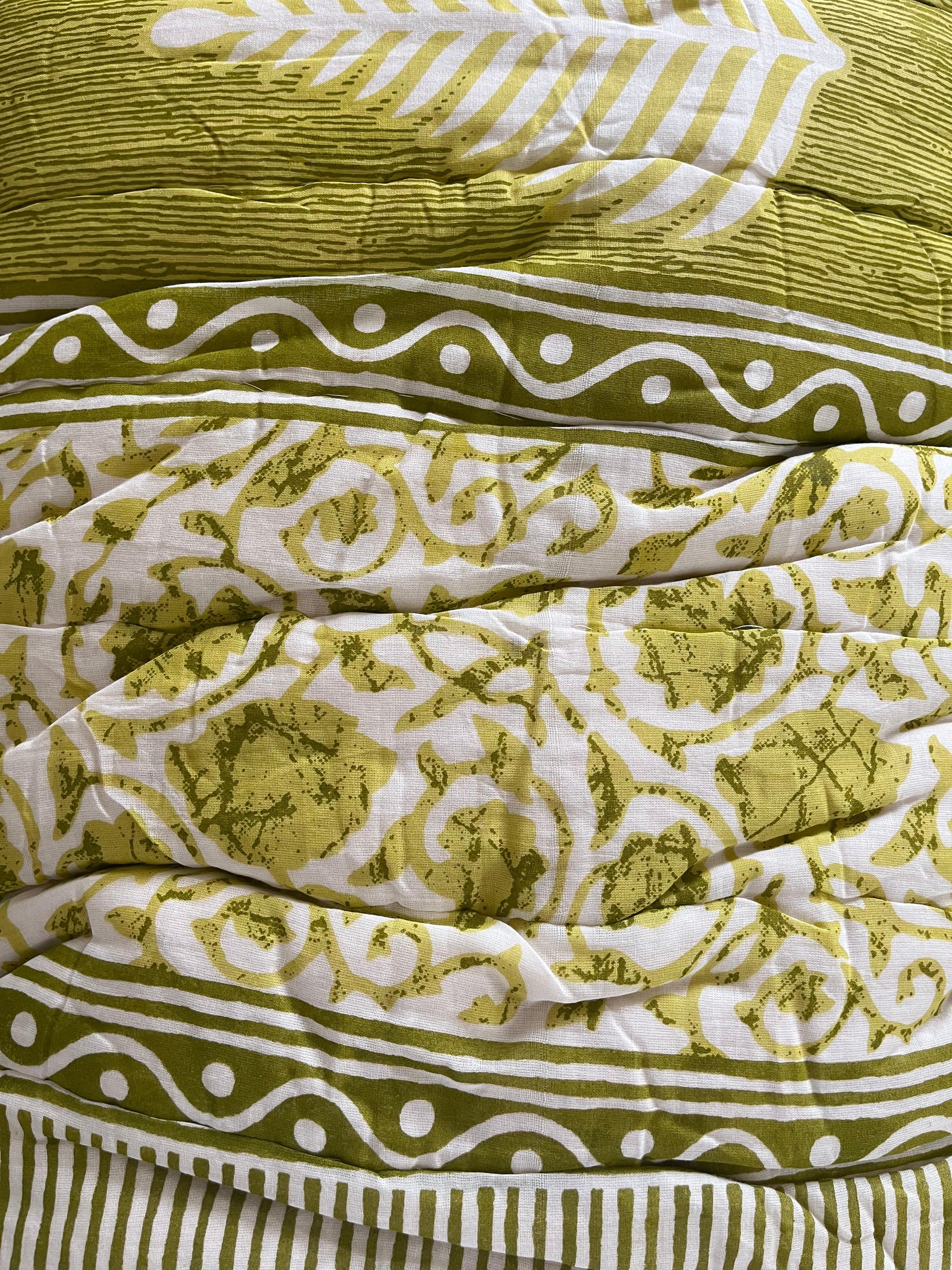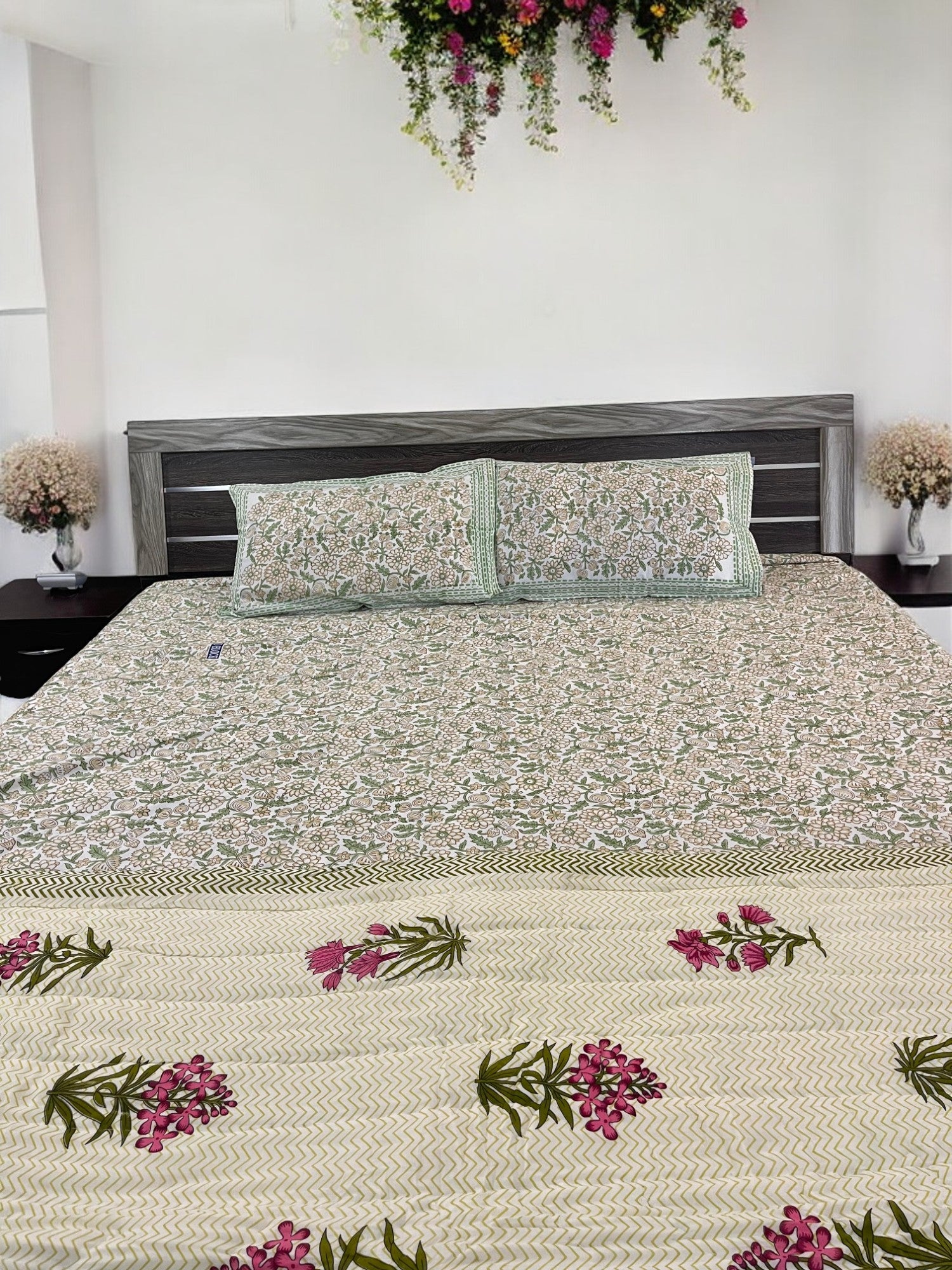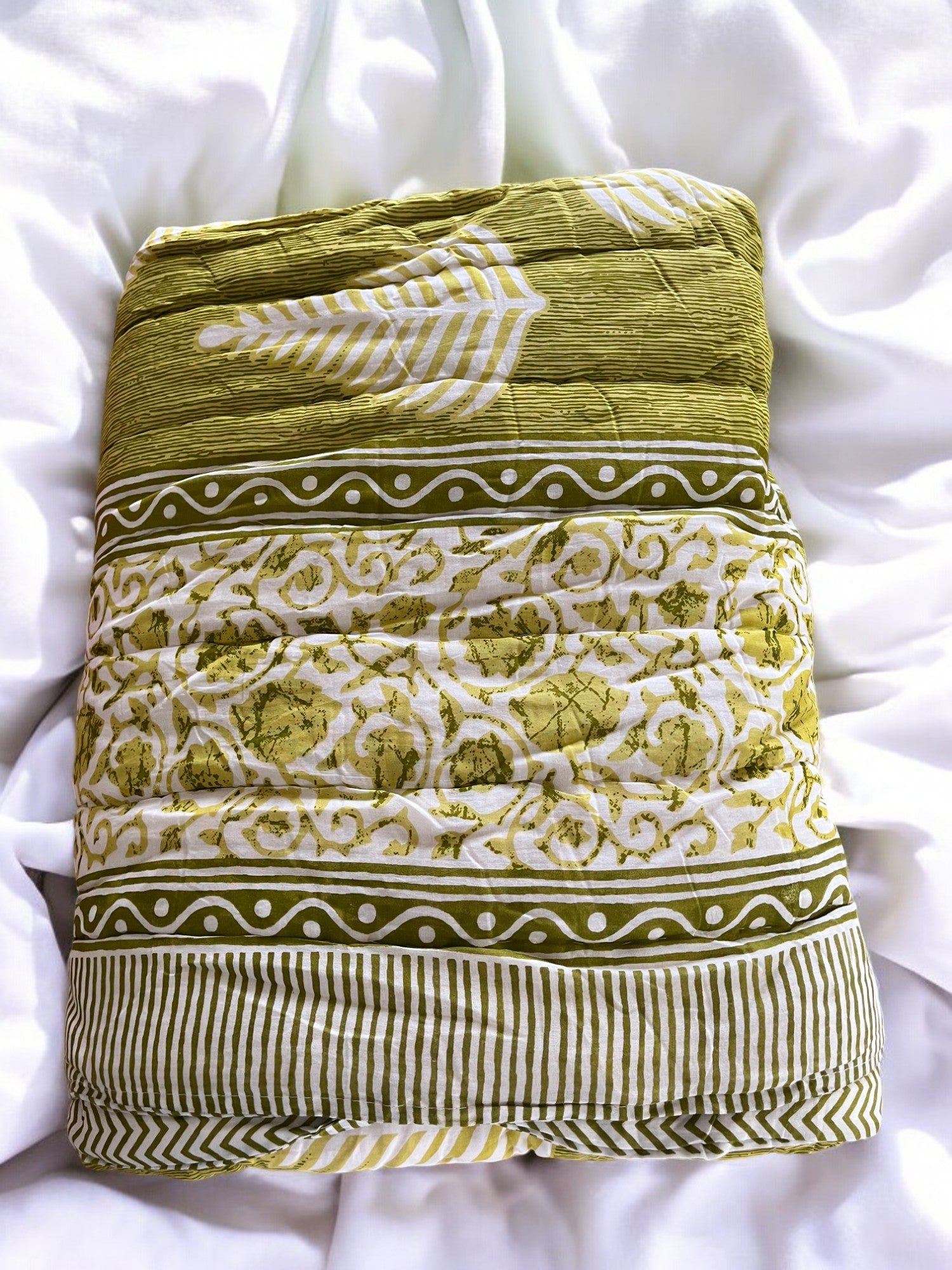 Enhance your bedroom with the Sea Green Floral Double Reversible Quilt, made from 100% premium cotton. Featuring a handcrafted floral design in soothing sea green hues, this reversible quilt adds elegance and versatility to your decor. Perfect for all-season comfort, it offers warmth in winters and breathability in summers. Crafted with eco-friendly dyes, it’s safe, skin-friendly, and durable. Designed for luxury and comfort, this dry clean-only quilt is ideal for maintaining its vibrant colors and soft texture. Transform your bedroom into a cozy, stylish retreat—order yours today!