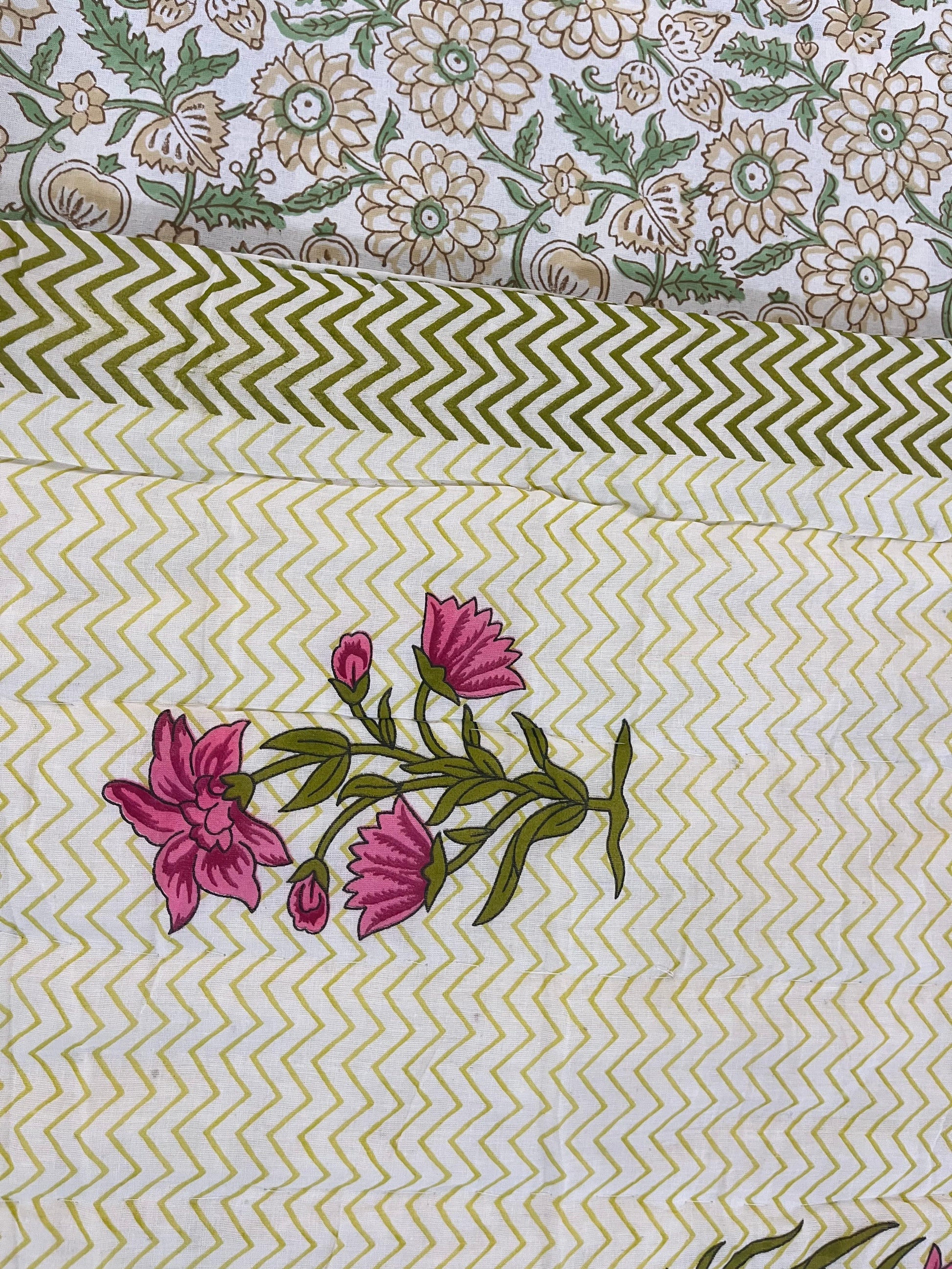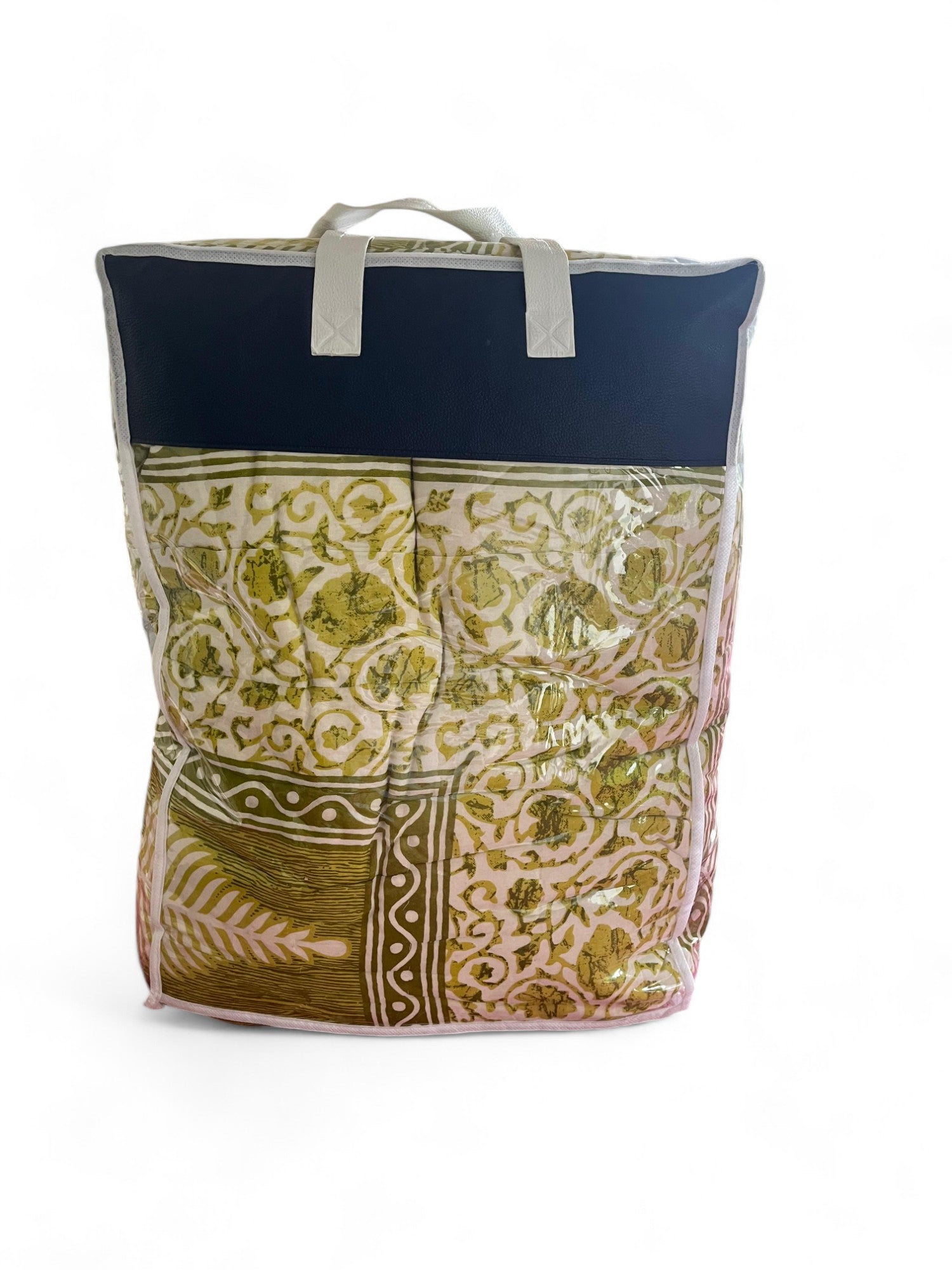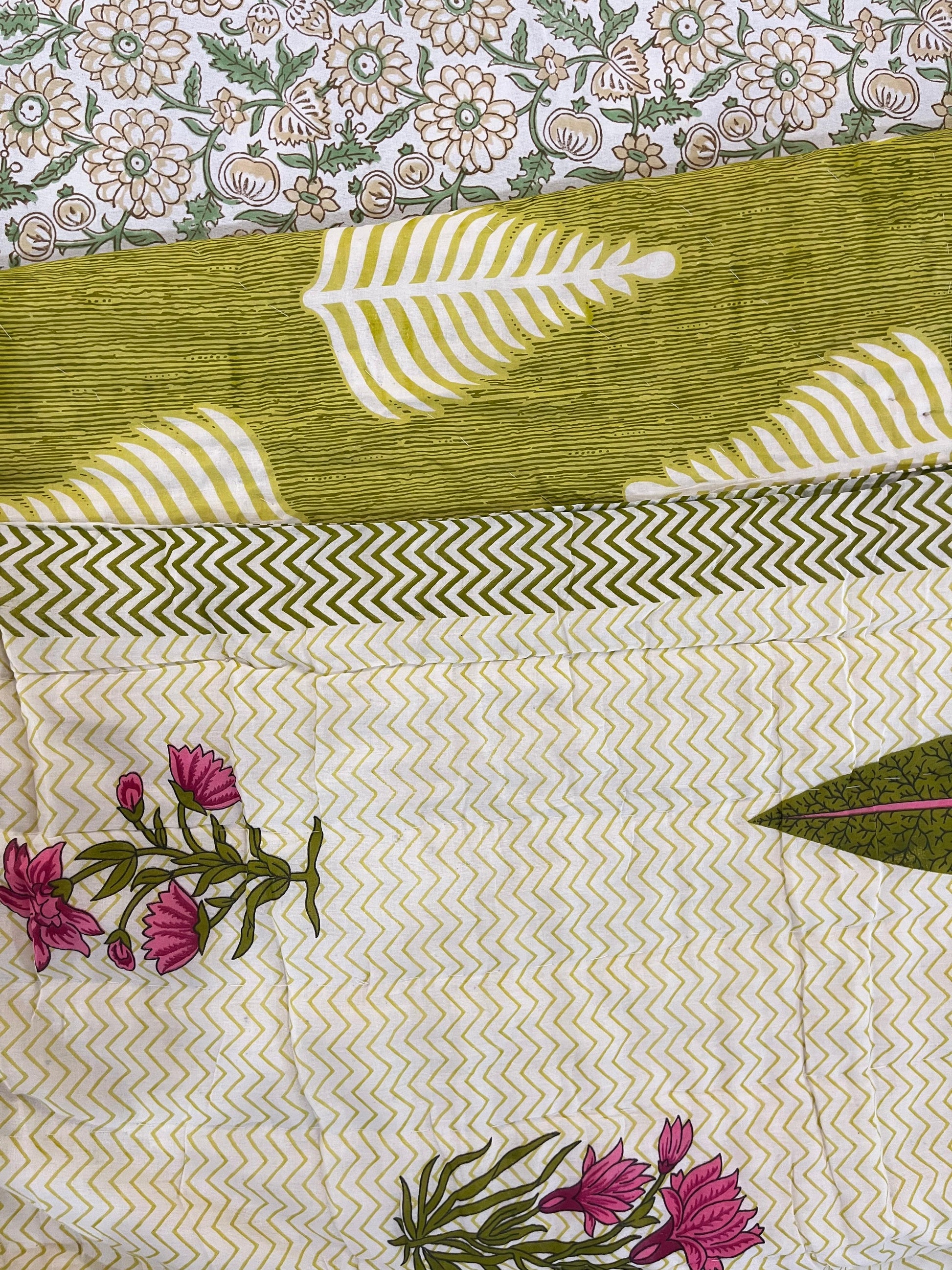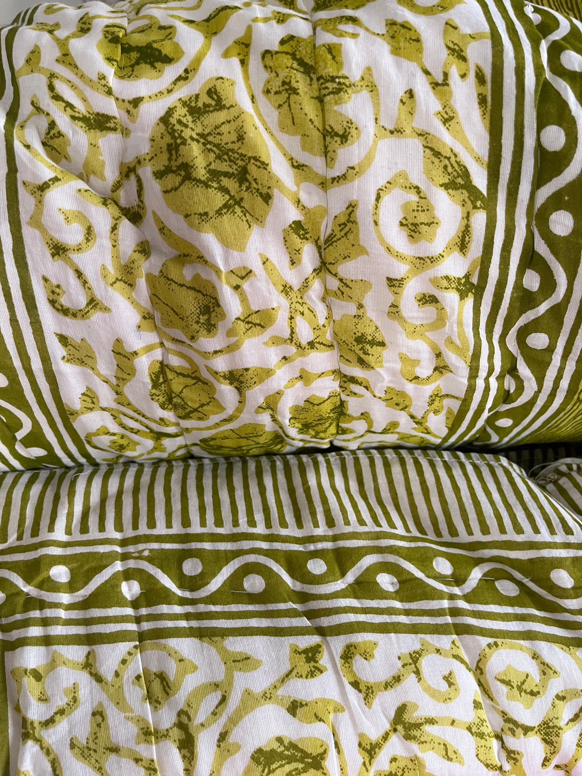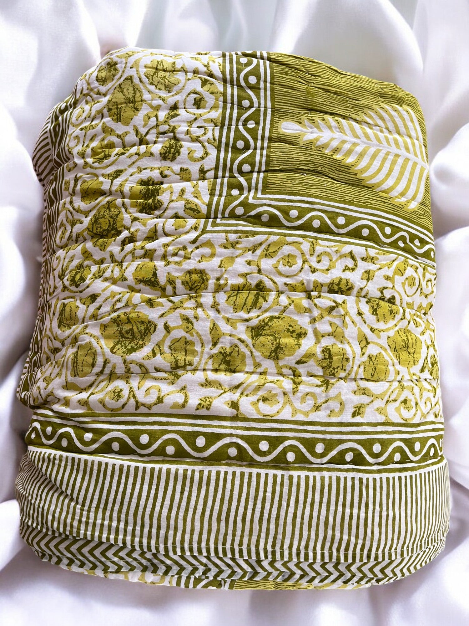 Enhance your bedroom with the Sea Green Floral Double Reversible Quilt, made from 100% premium cotton. Featuring a handcrafted floral design in soothing sea green hues, this reversible quilt adds elegance and versatility to your decor. Perfect for all-season comfort, it offers warmth in winters and breathability in summers. Crafted with eco-friendly dyes, it’s safe, skin-friendly, and durable. Designed for luxury and comfort, this dry clean-only quilt is ideal for maintaining its vibrant colors and soft texture. Transform your bedroom into a cozy, stylish retreat—order yours today!