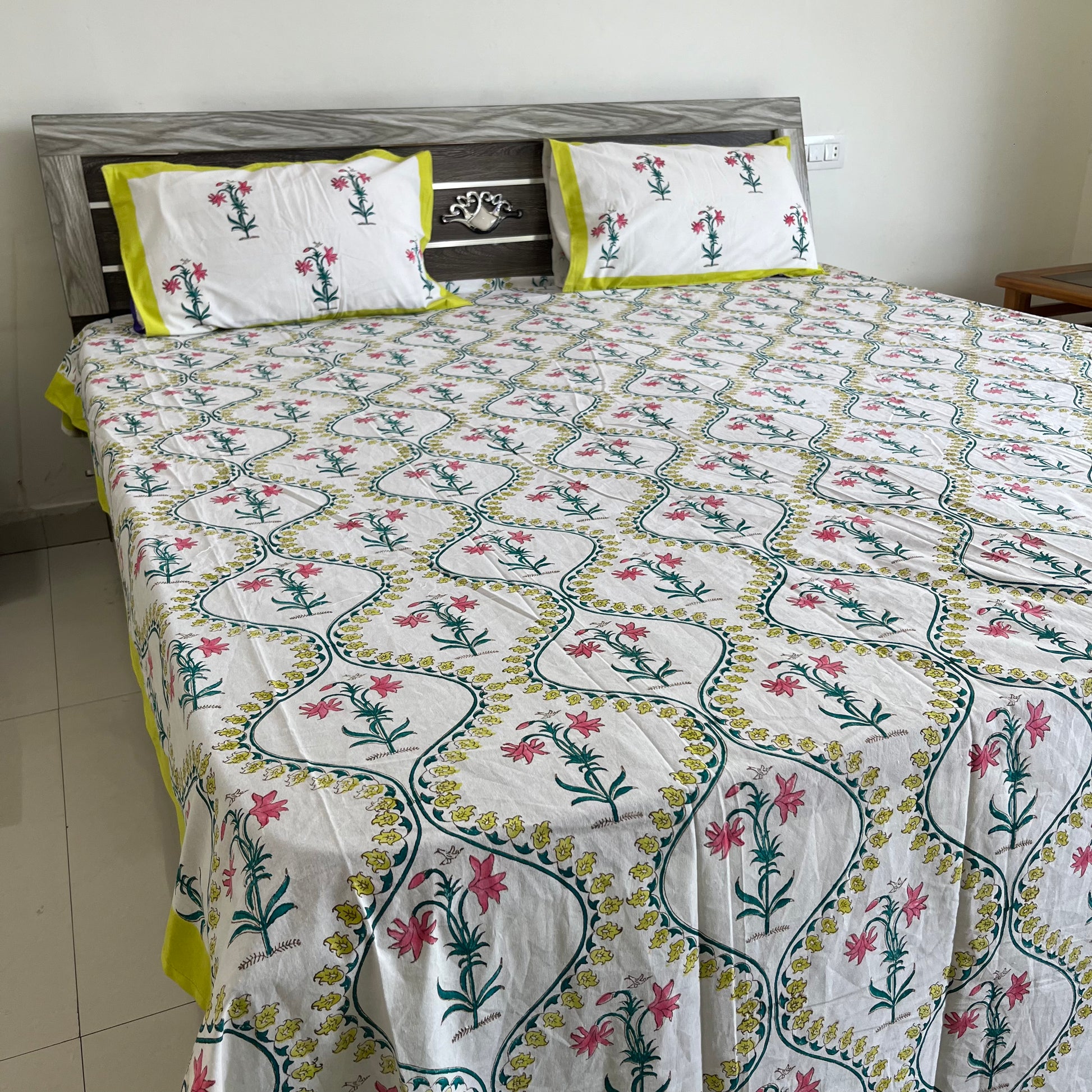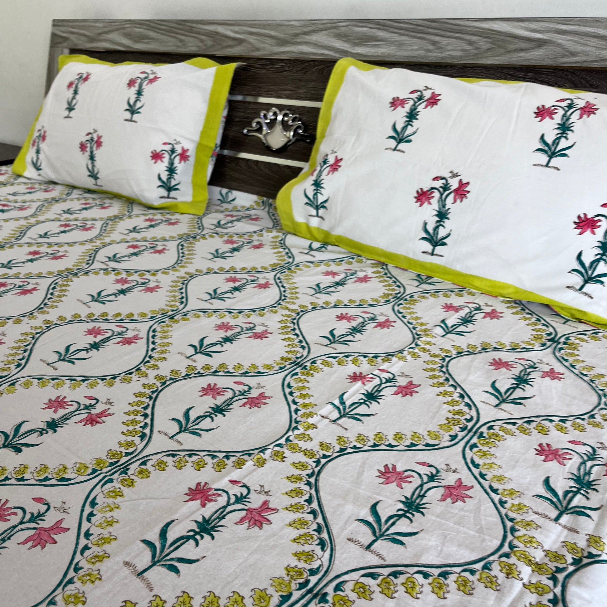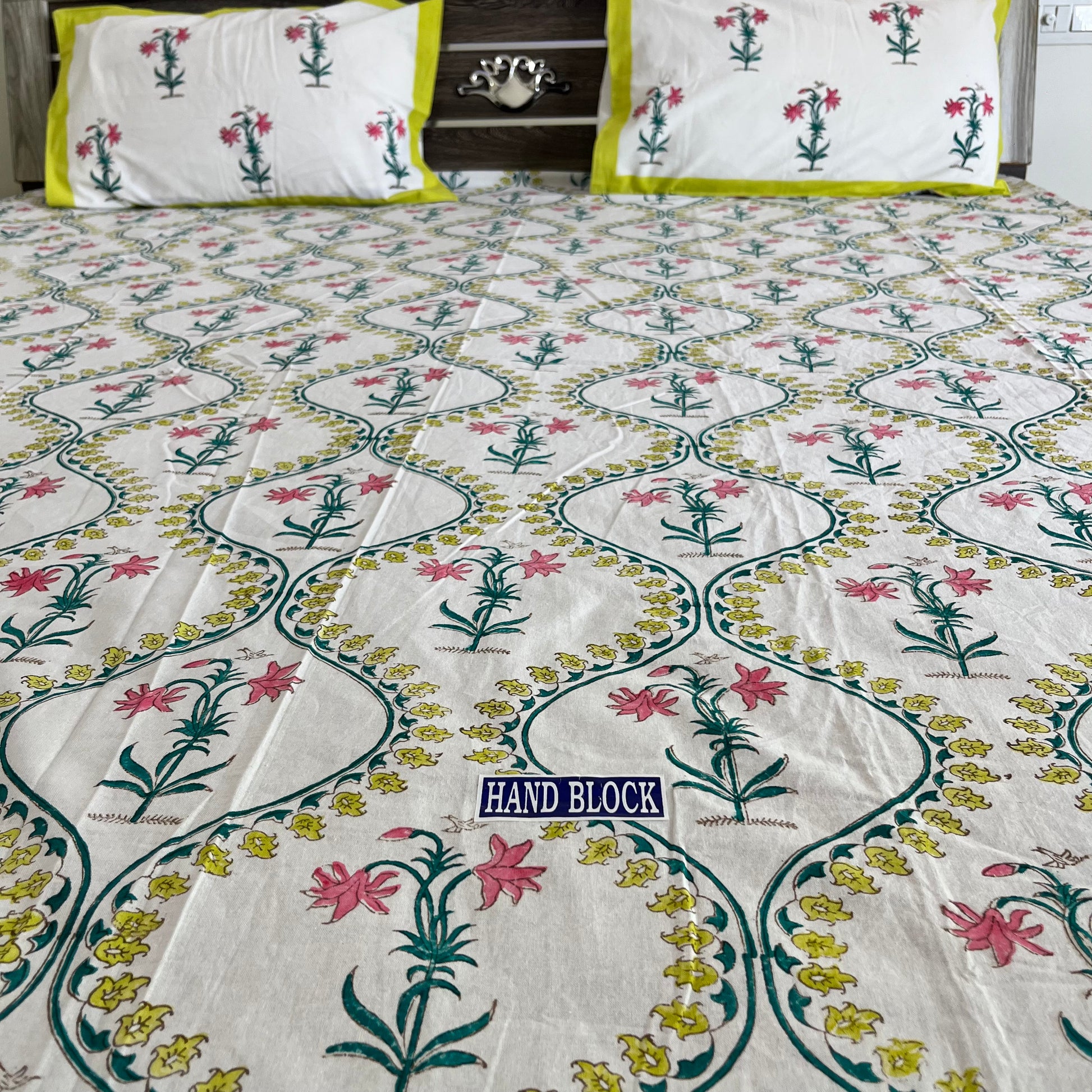 Add a touch of gentle romance to your bedroom with our Gulab Baag Collection – featuring a graceful King Size Handblock Printed Cotton Bedsheet adorned with charming soft pink floral motifs over a crisp white base. Inspired by traditional Indian block printing, this bedsheet captures the beauty of handcrafted art in a soothing, feminine palette.