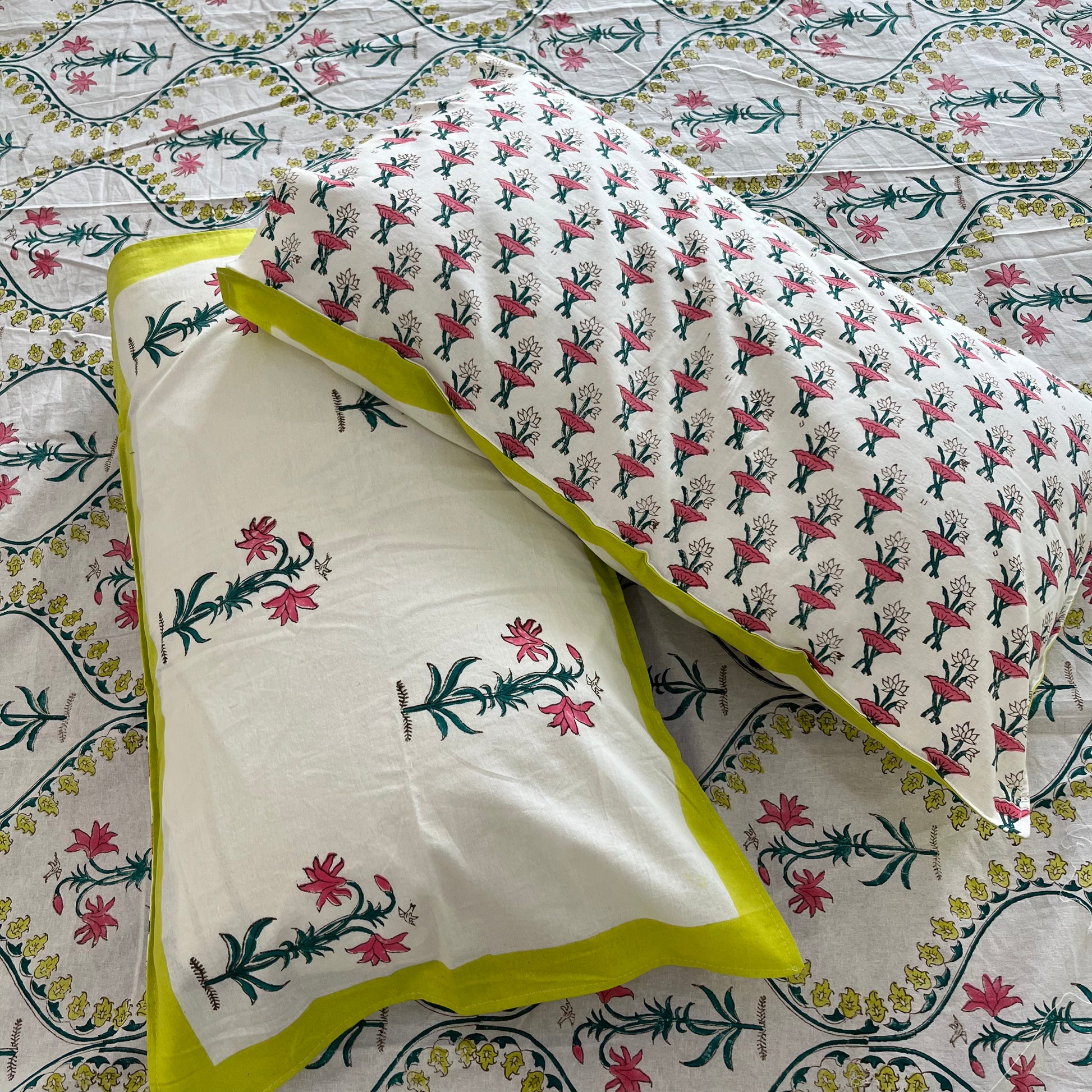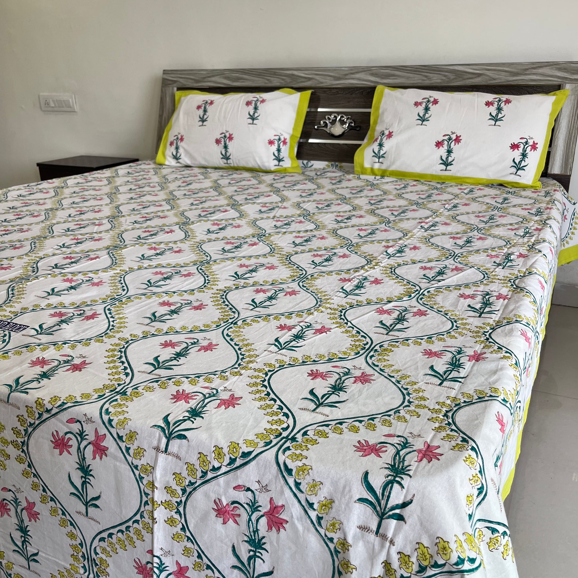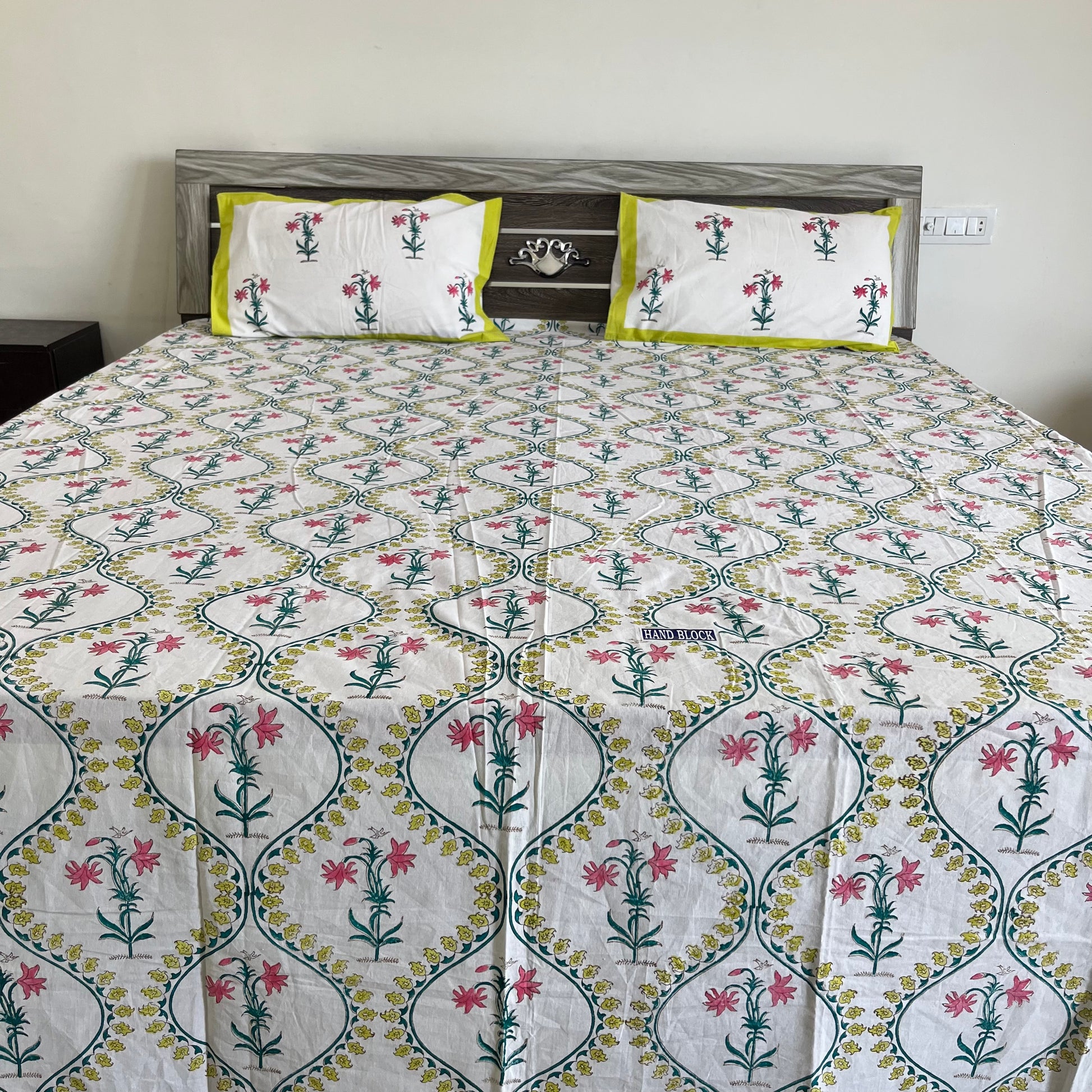 Add a touch of gentle romance to your bedroom with our Gulab Baag Collection – featuring a graceful King Size Handblock Printed Cotton Bedsheet adorned with charming soft pink floral motifs over a crisp white base. Inspired by traditional Indian block printing, this bedsheet captures the beauty of handcrafted art in a soothing, feminine palette.