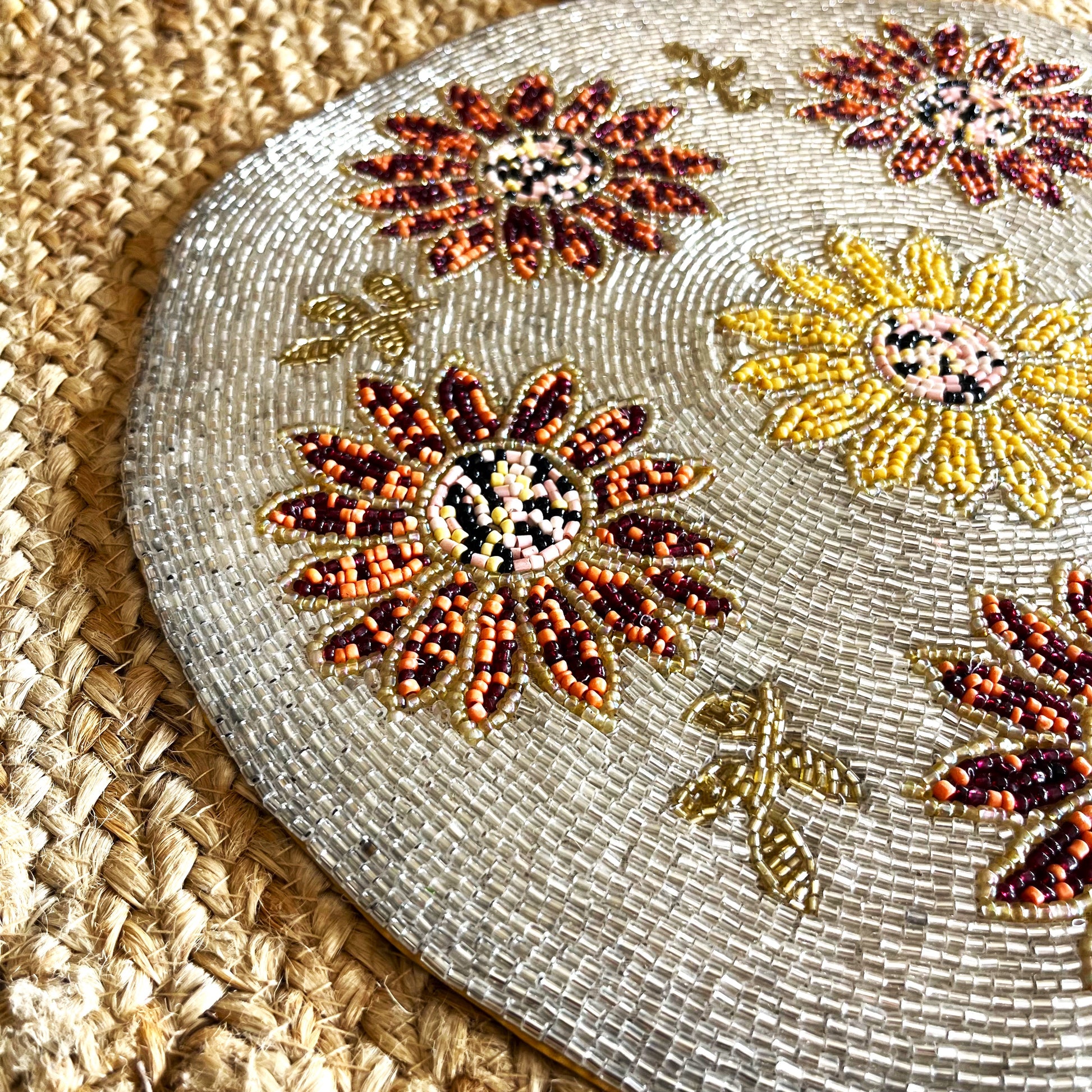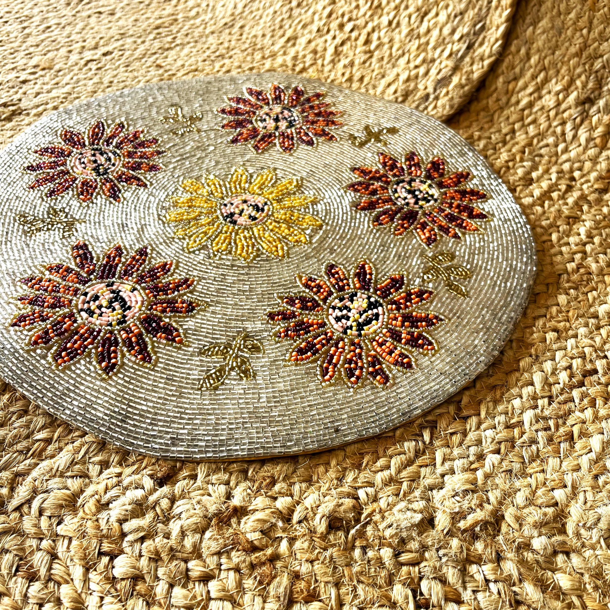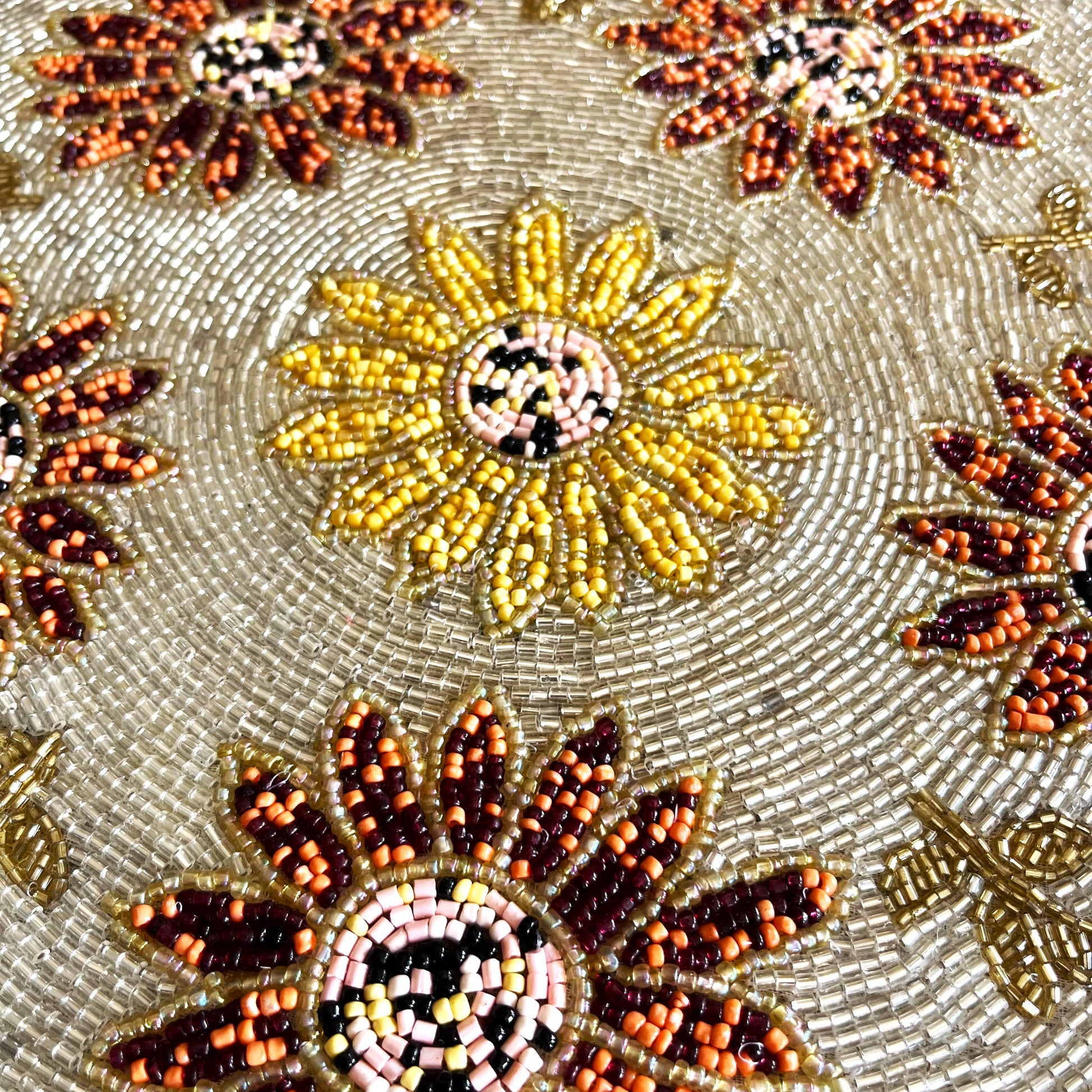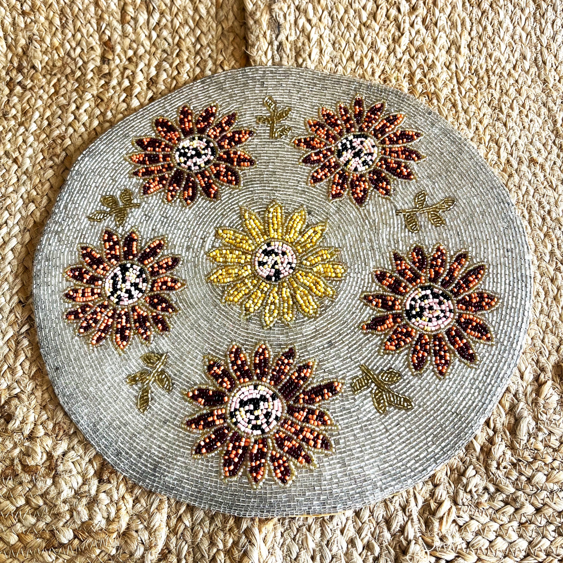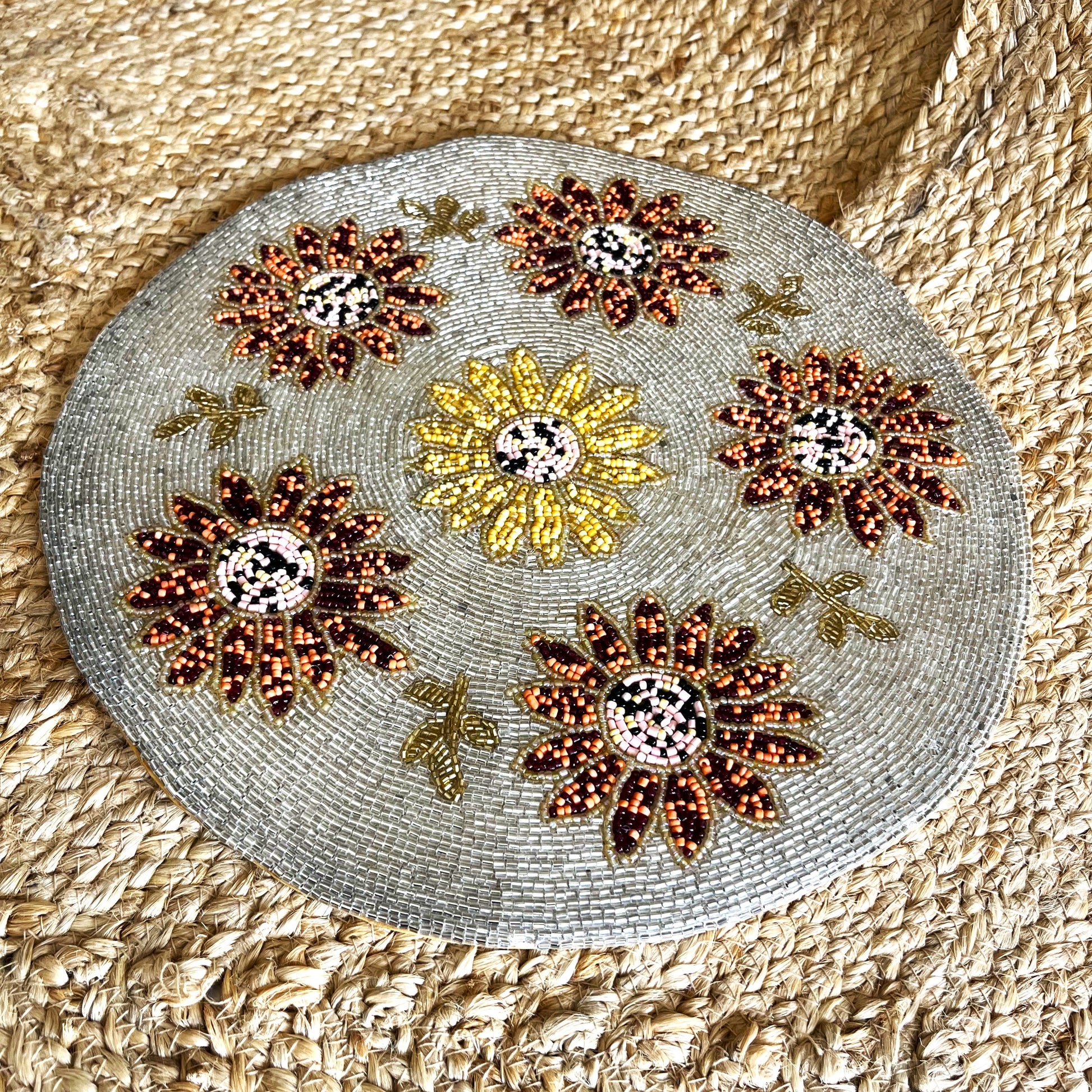 Enhance your table setting with the Sunflower Handcrafted Beaded Placemat, a stunning addition to your home décor. Featuring intricate hand-beaded detailing in warm autumn tones, this 14-inch round placemat showcases a vibrant sunflower design, making it perfect for fall-inspired tablescapes, festive gatherings, or everyday elegance. Its exquisite craftsmanship adds a touch of sophistication to any space, whether used as a placemat or a decorative accent on side tables, consoles, or dining setups.