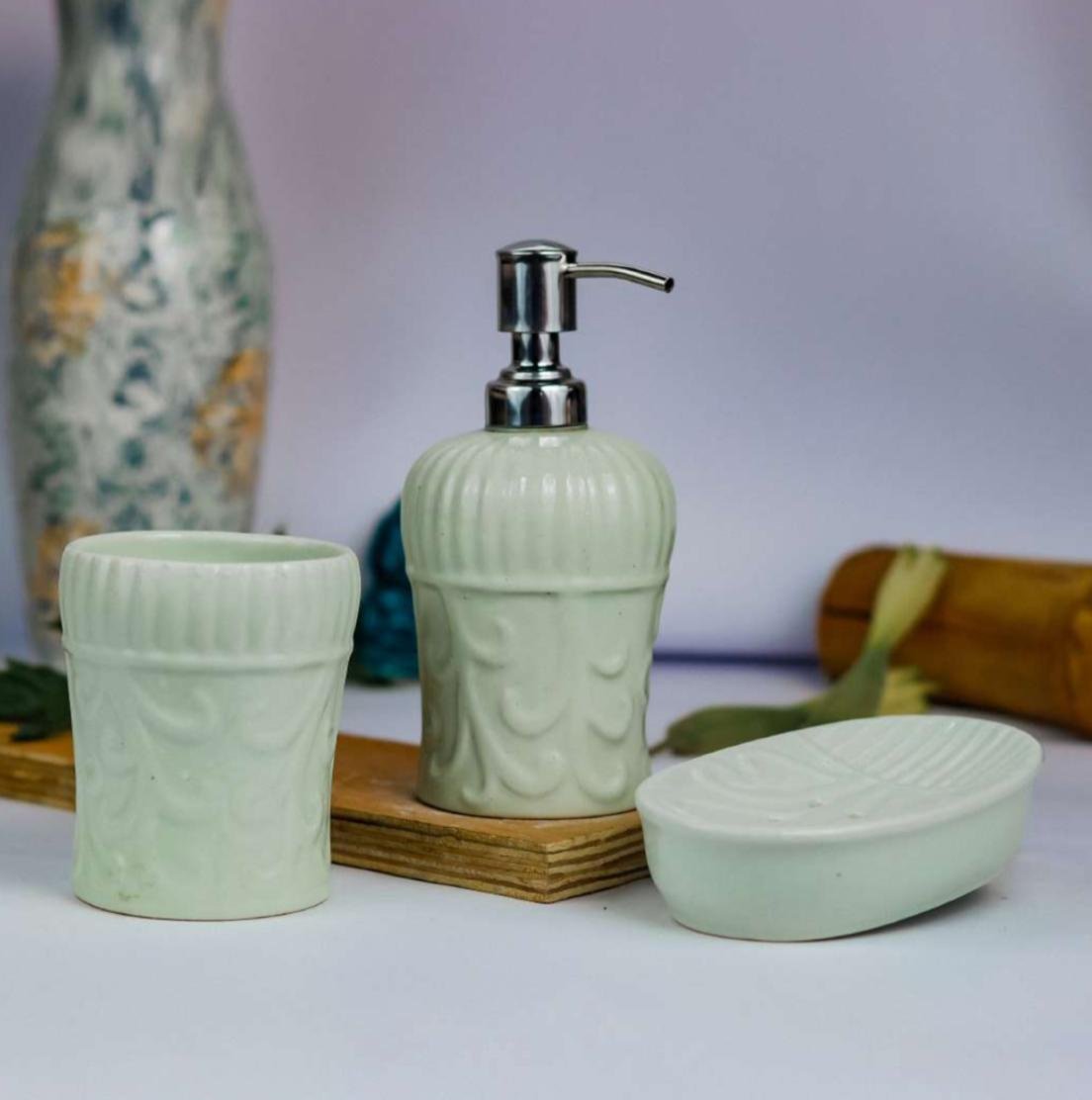 Tea Green Shade Ceramic Bathroom Set – 3-Piece Elegant Bathroom Accessories