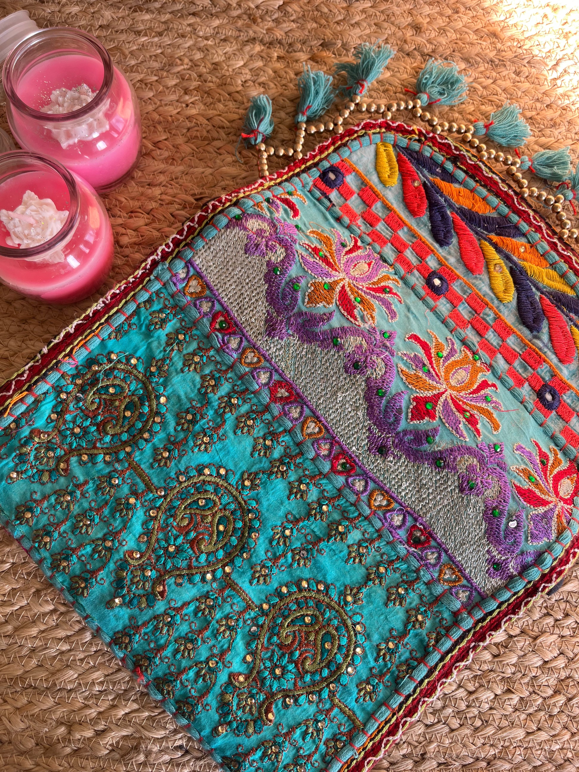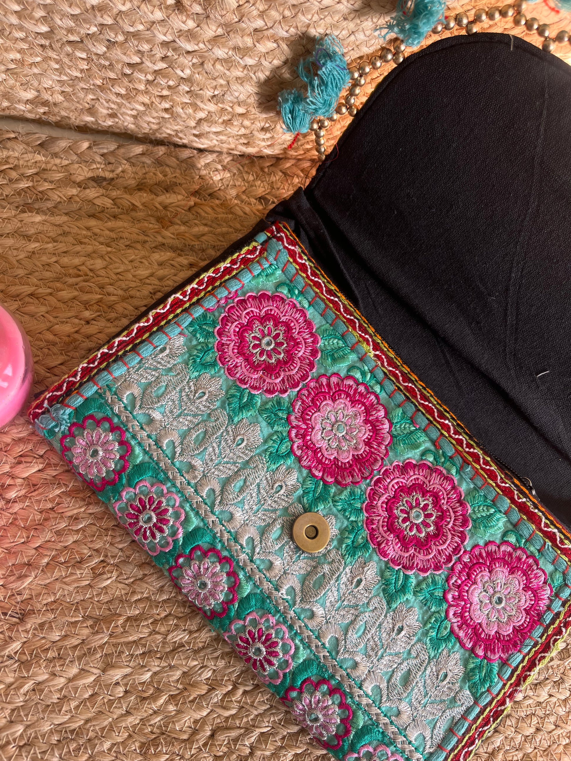 Teal Blue Multi Color Hand Embroidered Patchwork Sling Bag