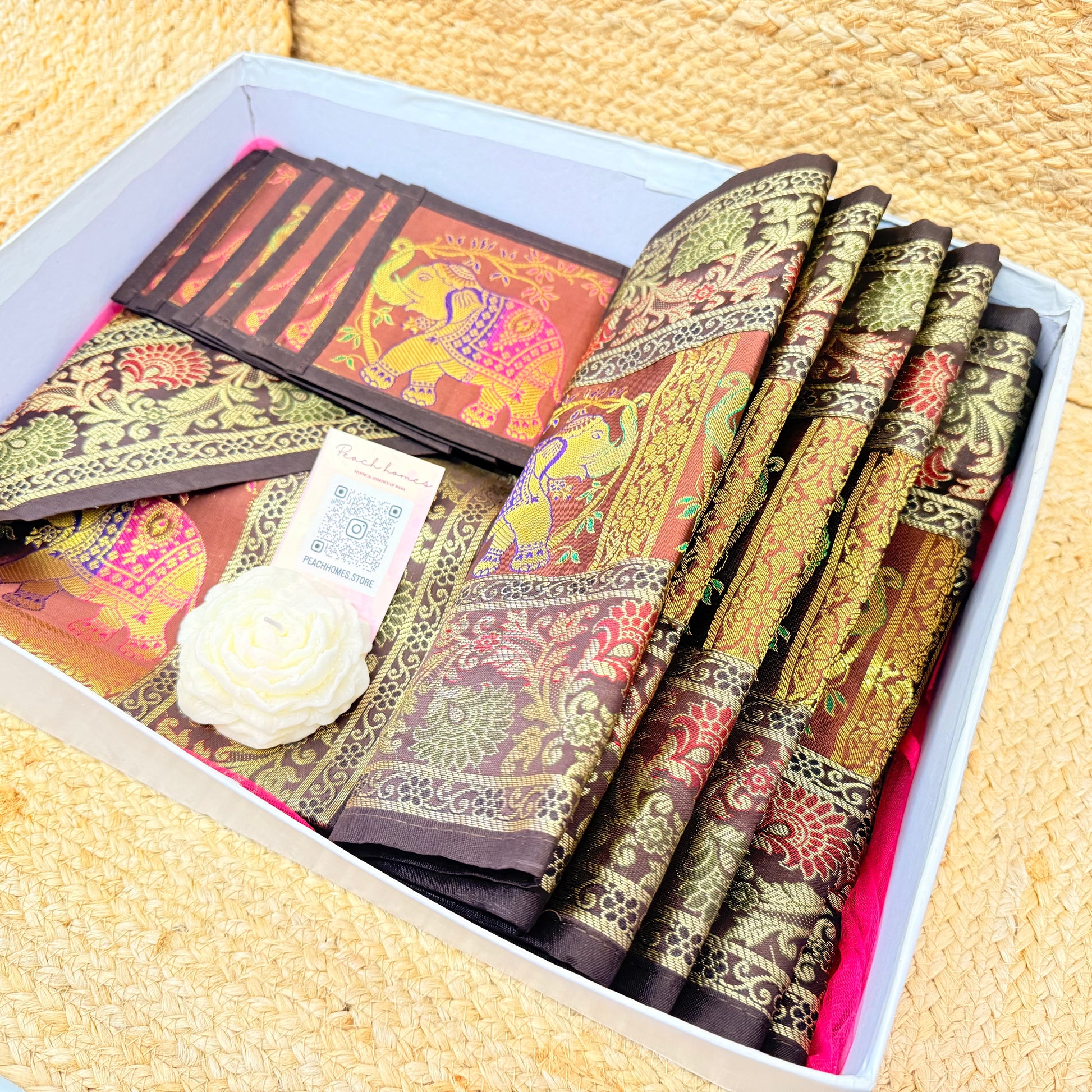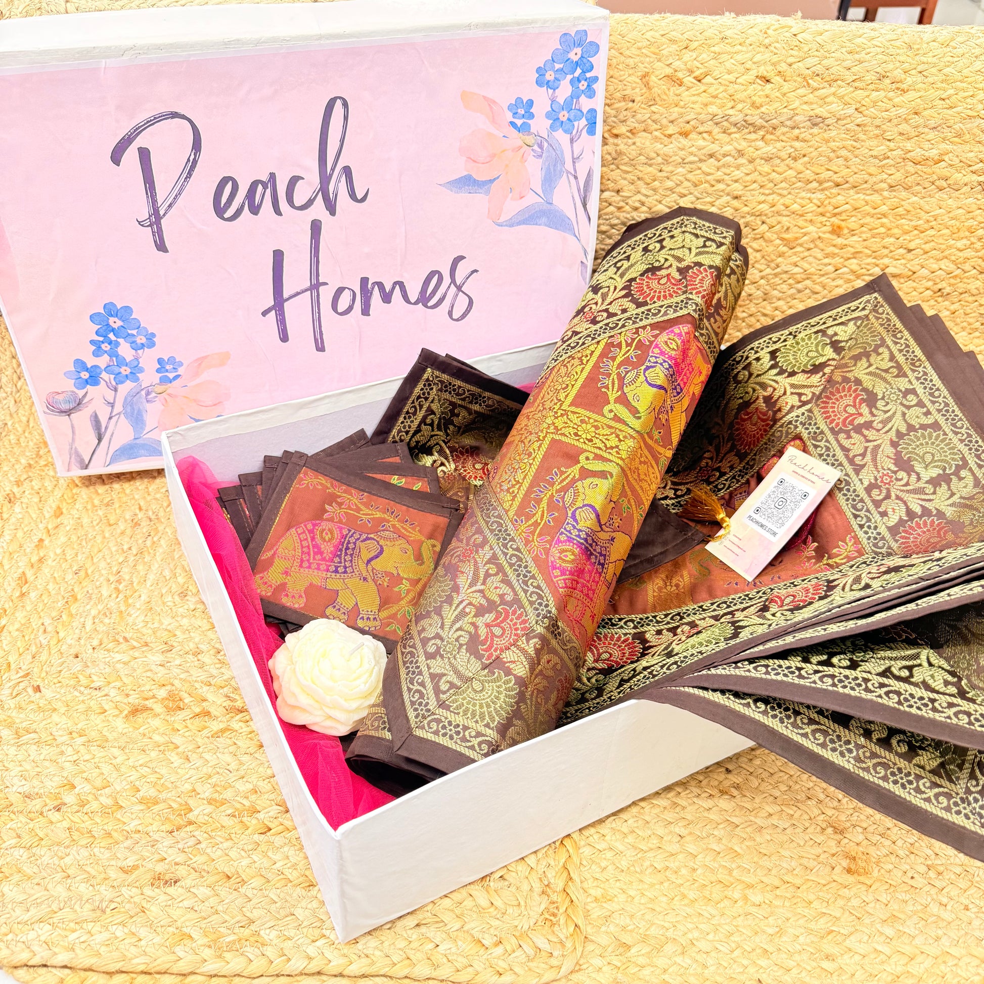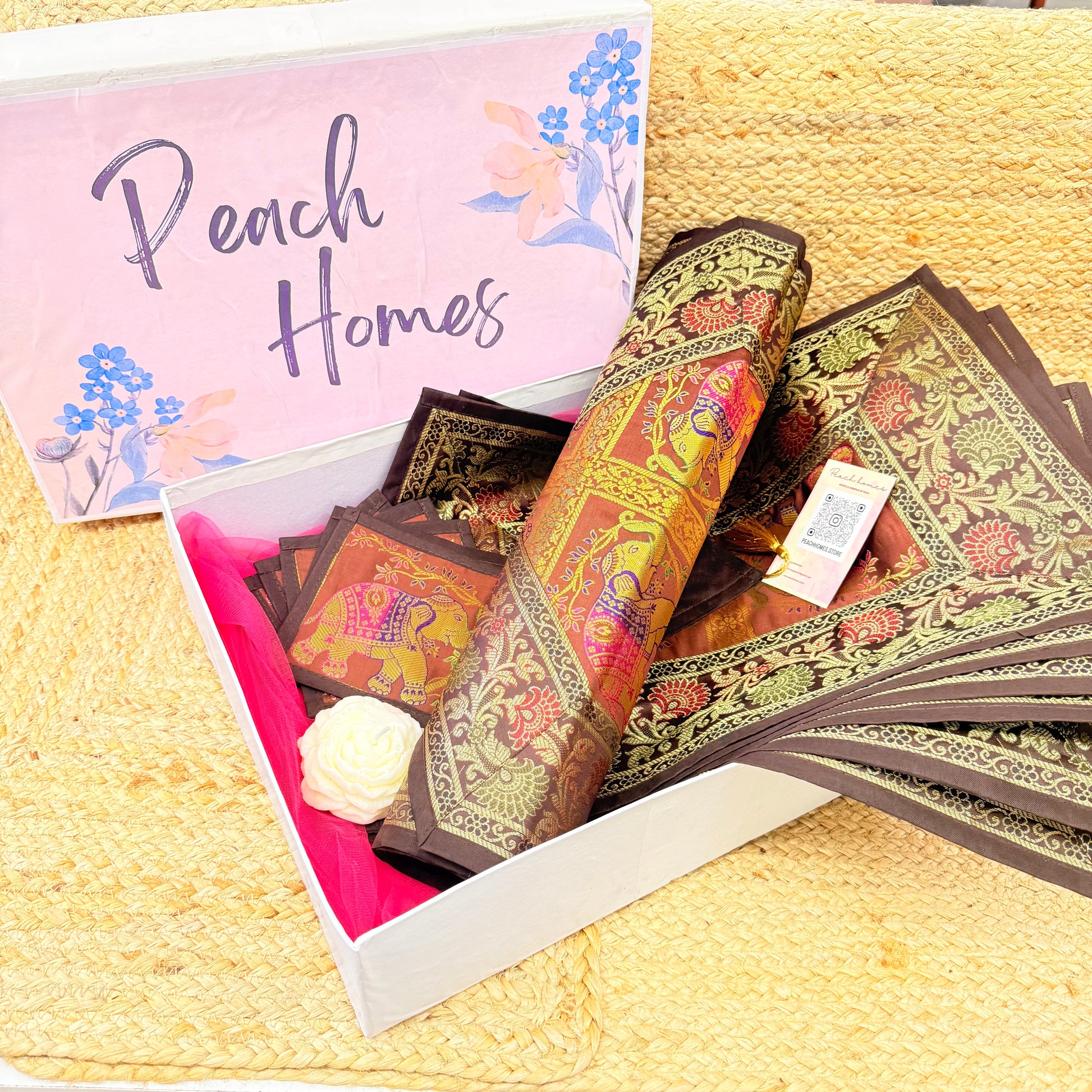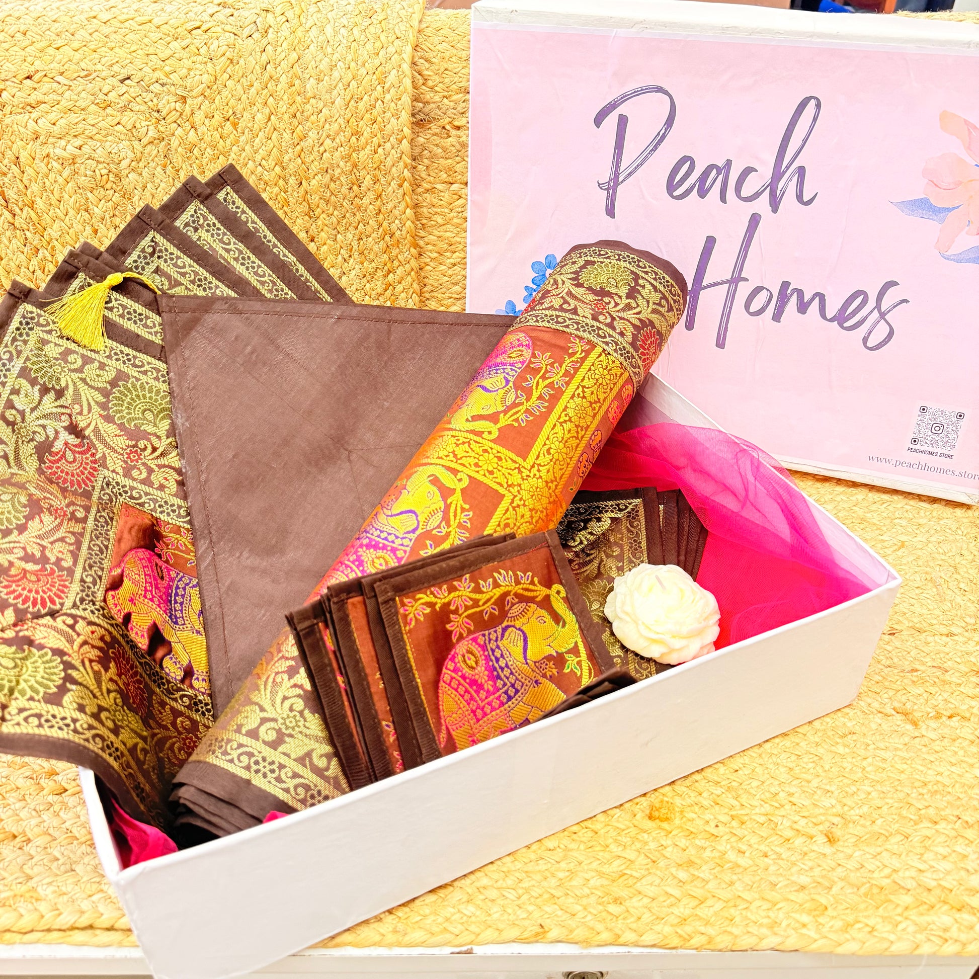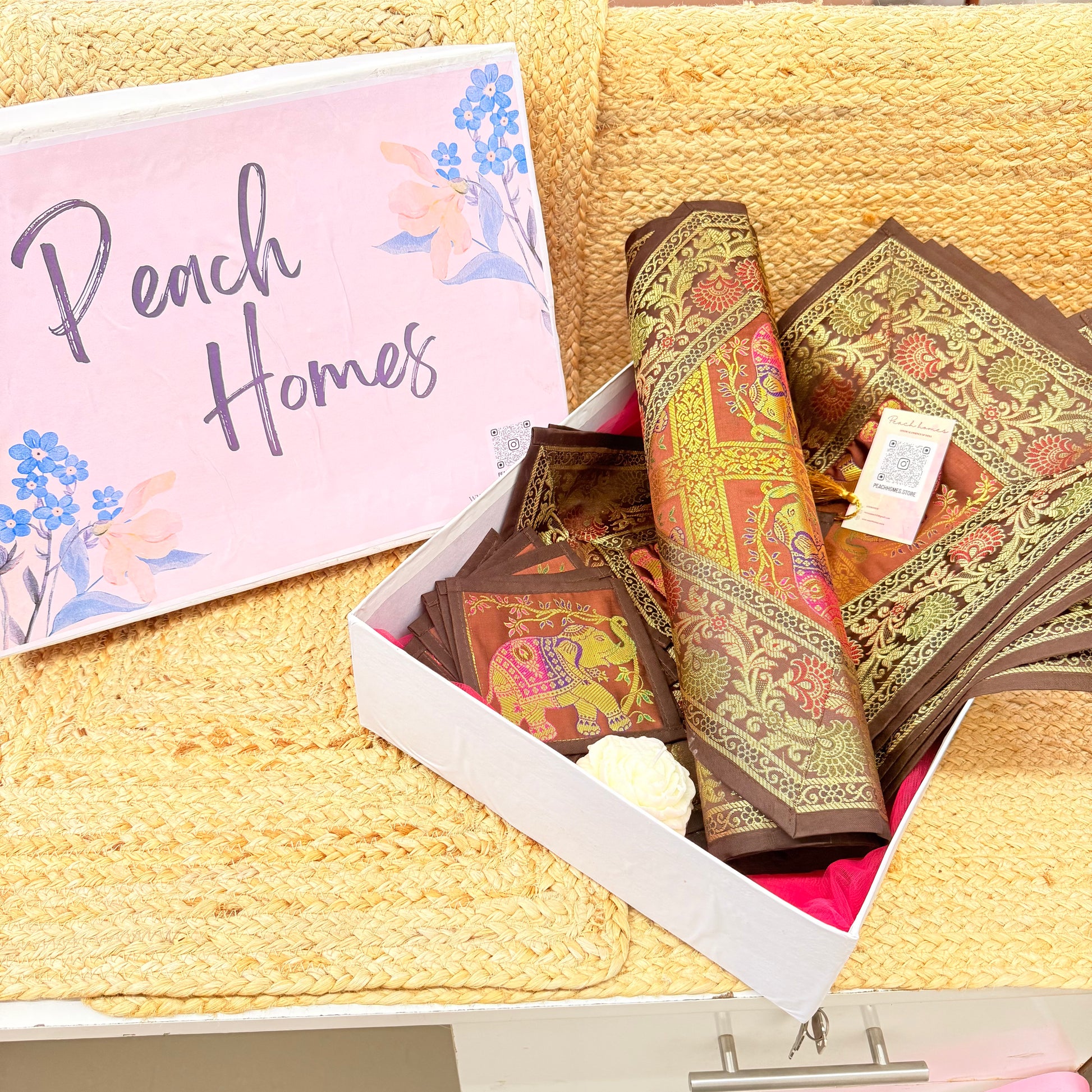 Grounded in tradition and rich in sophistication, The Earth Luxe Table Set is a premium Banarasi silk dining hamper in warm, earthy brown tones. This elegant set is ideal for those who love understated luxury and timeless Indian craftsmanship. A perfect gift for housewarmings, weddings, festive seasons, or simply upgrading your own space.