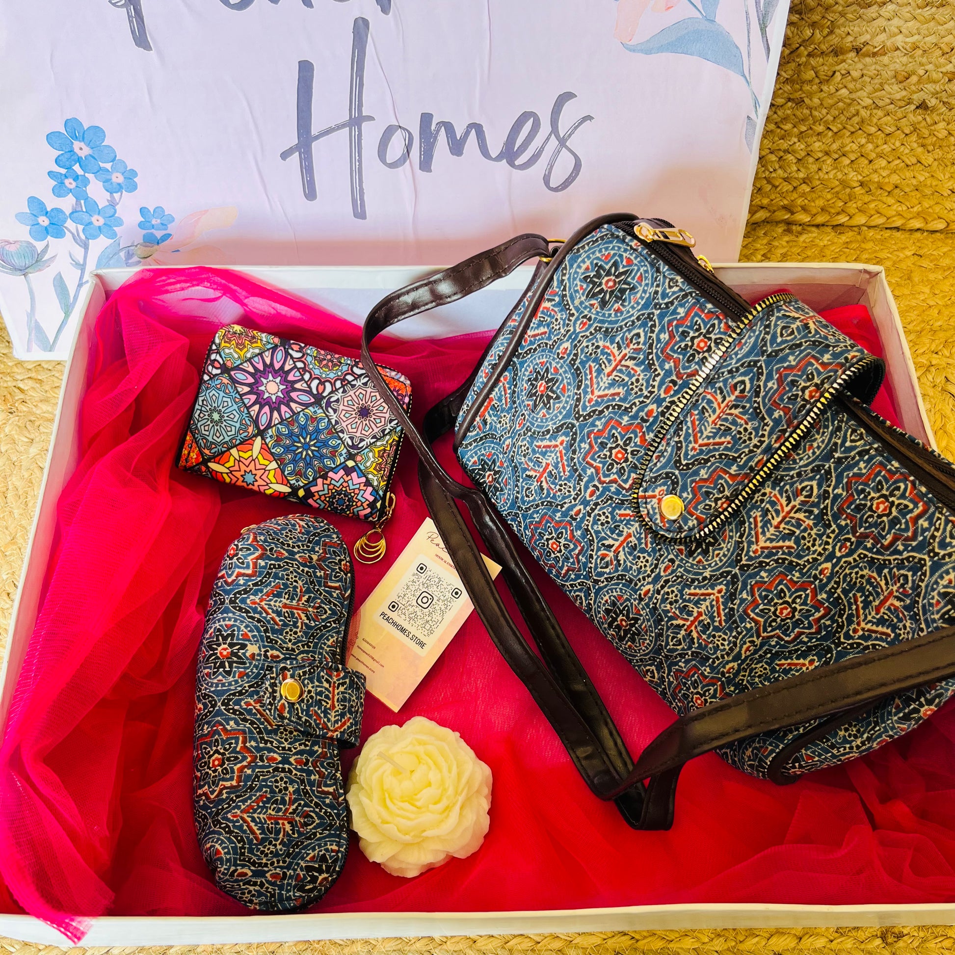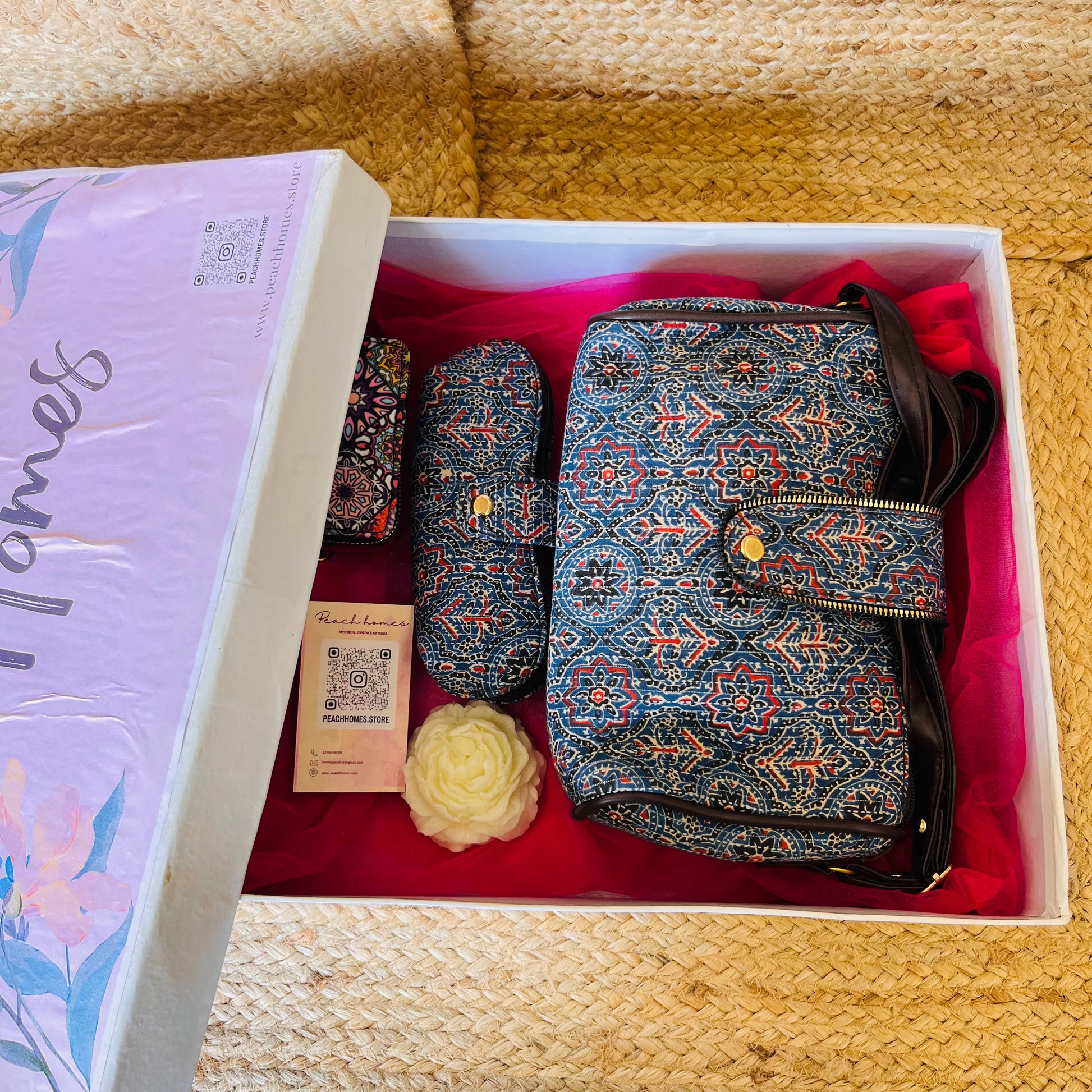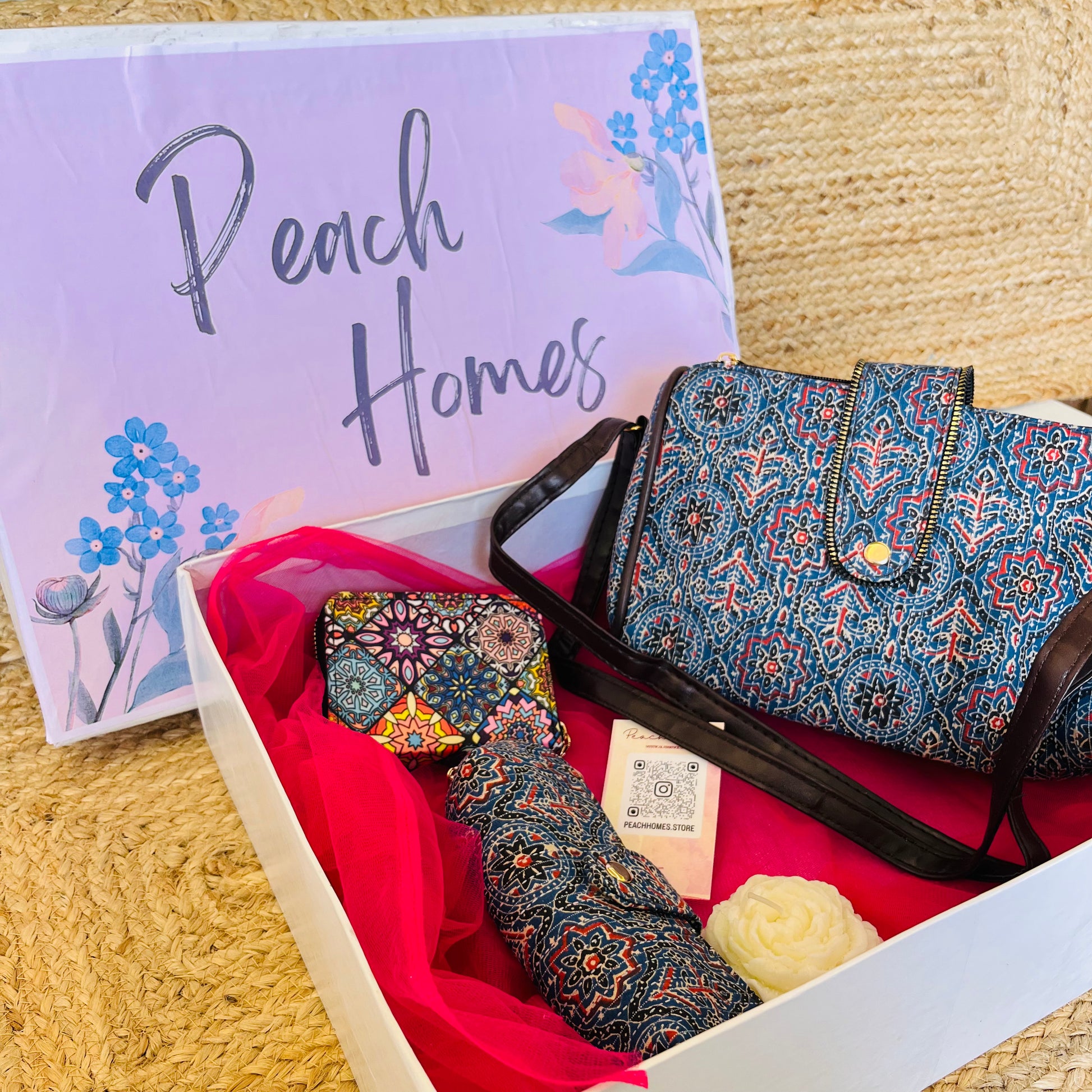 The Indigo Charm Hamper- Handblock Printed Blue Sling with Matching Goggle Case, Wallet & Free Scented Candle