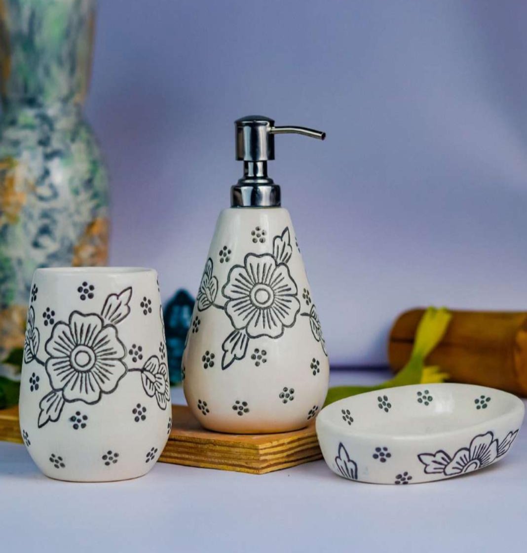 - 3-Piece Ceramic Set – Includes a soap dispenser, soap bar holder, and toothbrush holder.