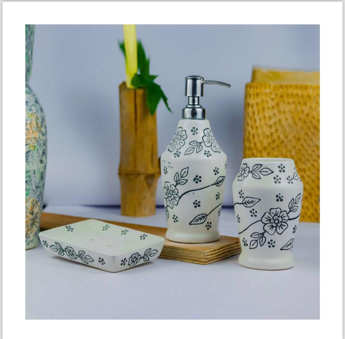 - 3-Piece Ceramic Set – Includes a soap dispenser, soap bar holder, and toothbrush holder.