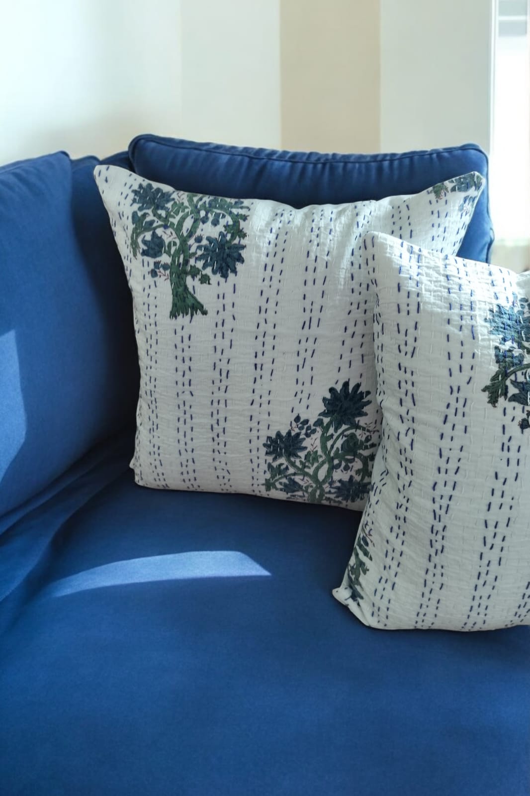 WHITE AND BLUE BUNCH OF FLOWER KANTHA COTTON CUSHION COVER SET OF 2
