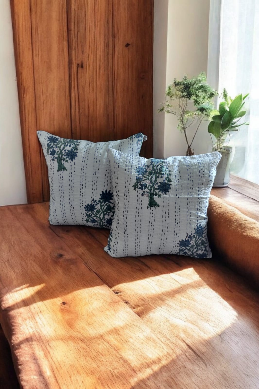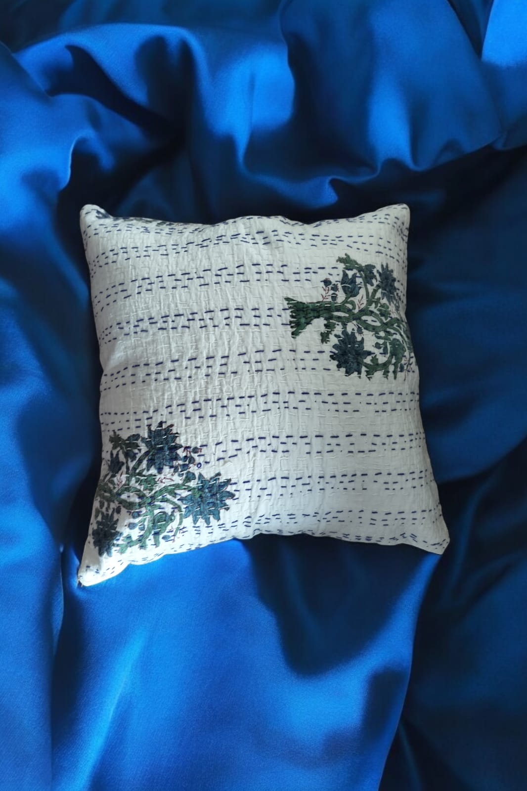 Introducing our White and Blue Bunch of Flower Kantha Cushion Cover - the perfect way to add a touch of elegance and beauty to any room. This cushion cover features a stunning white and blue flower design made with traditional Kantha stitching techniques. Elevate your home decor with this unique and eye-catching piece!