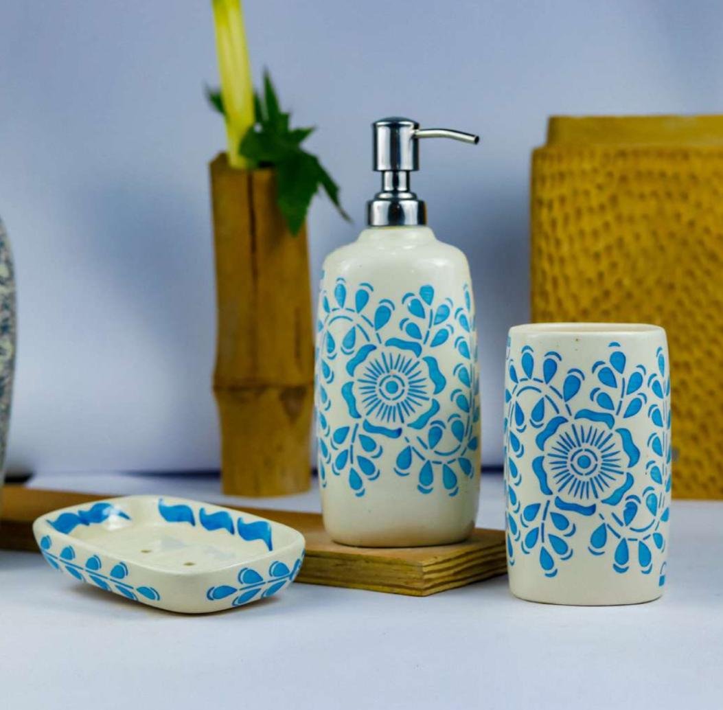 White and Blue Floral Ceramic Bathroom Set