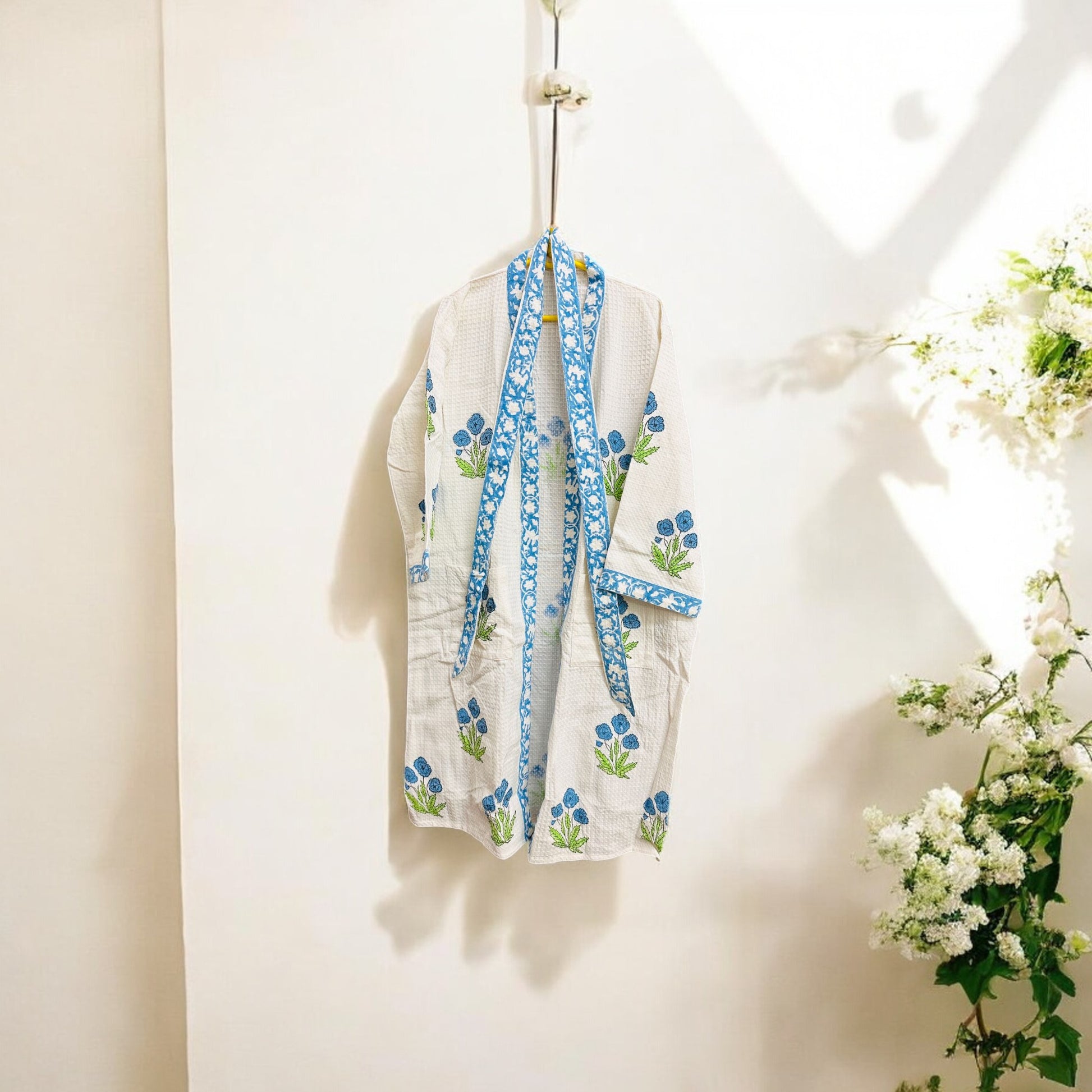 White and Blue Floral Handblock Bathrobe – 100% Cotton, Elegant and Comfortable