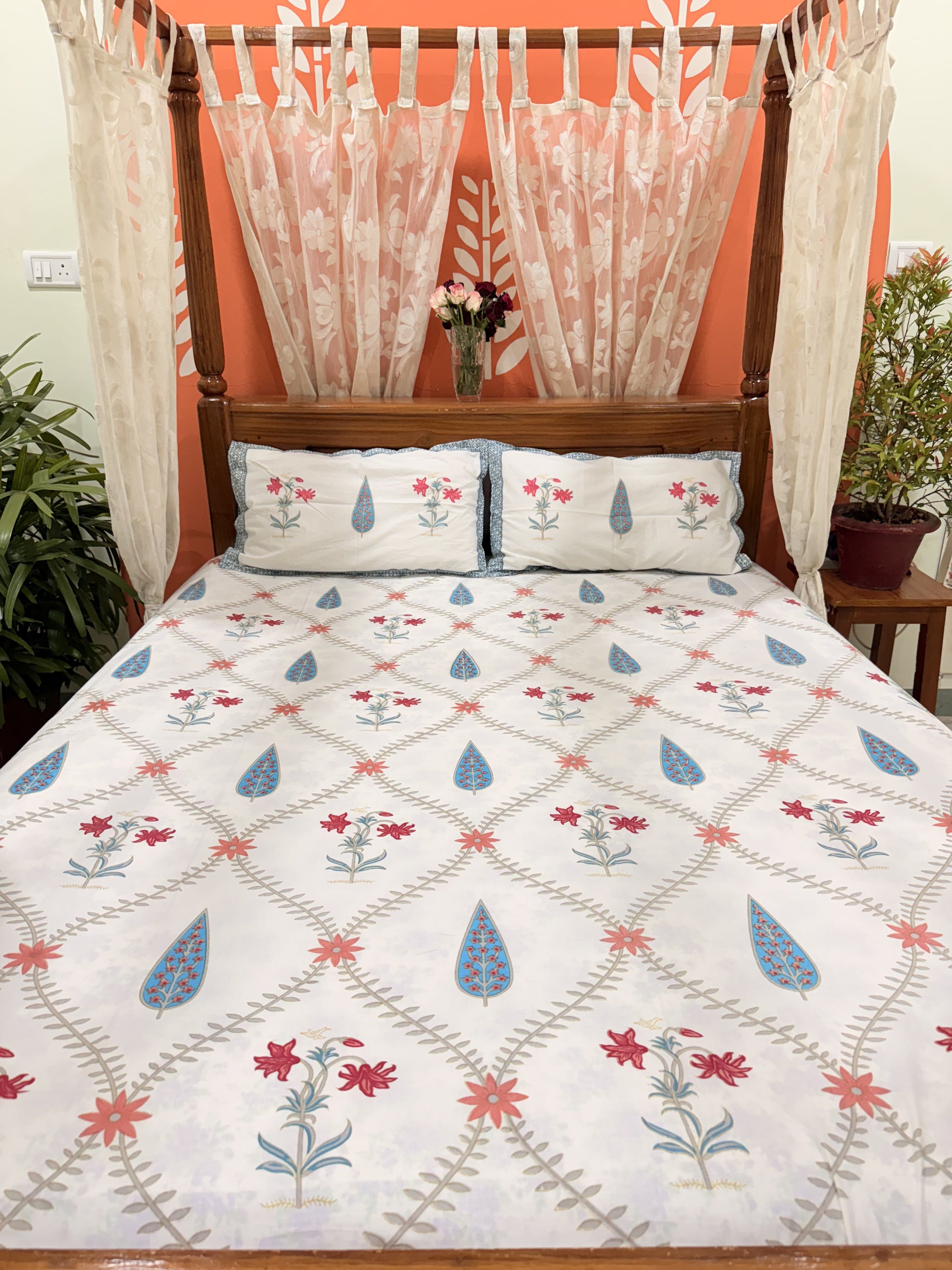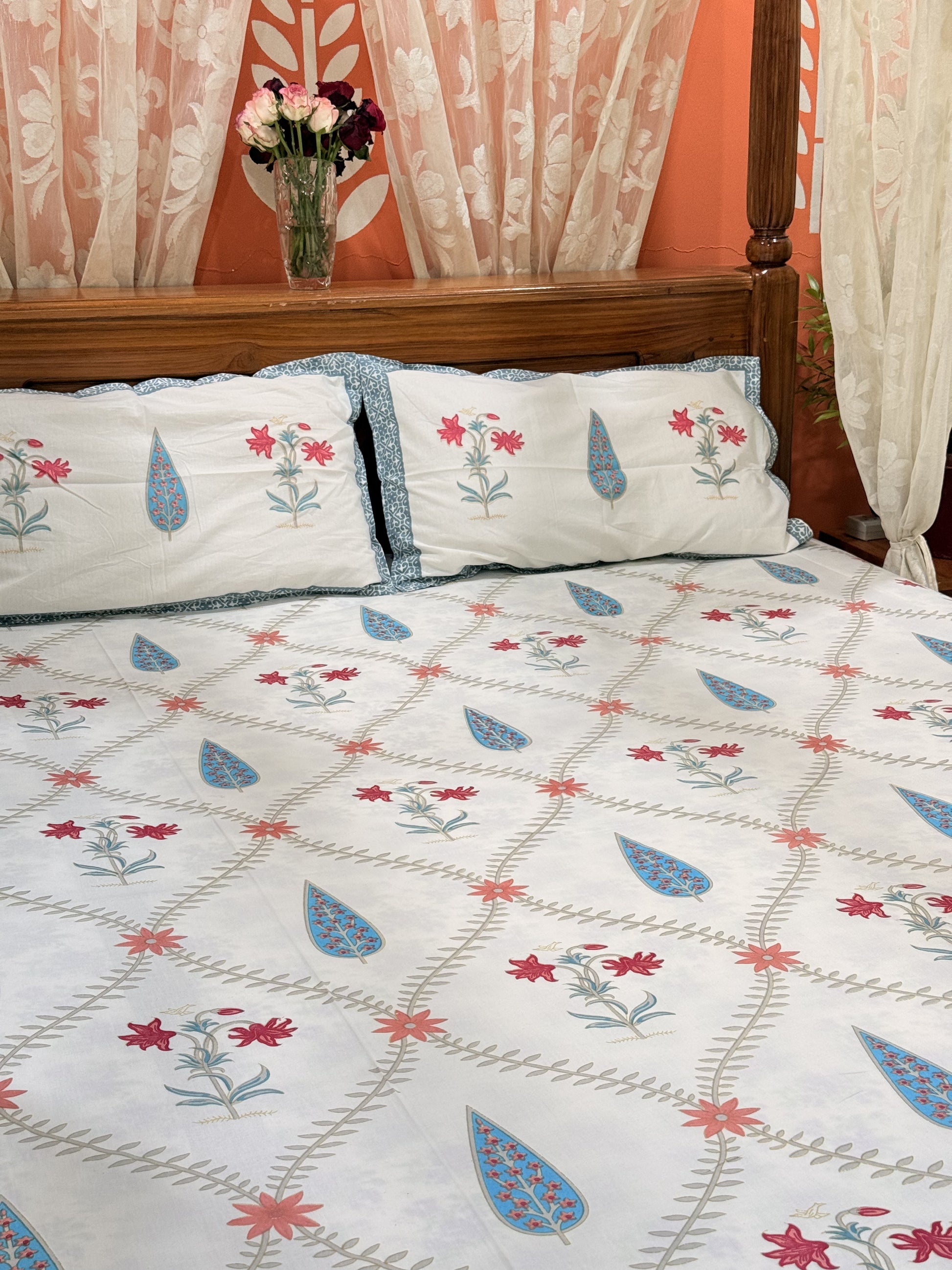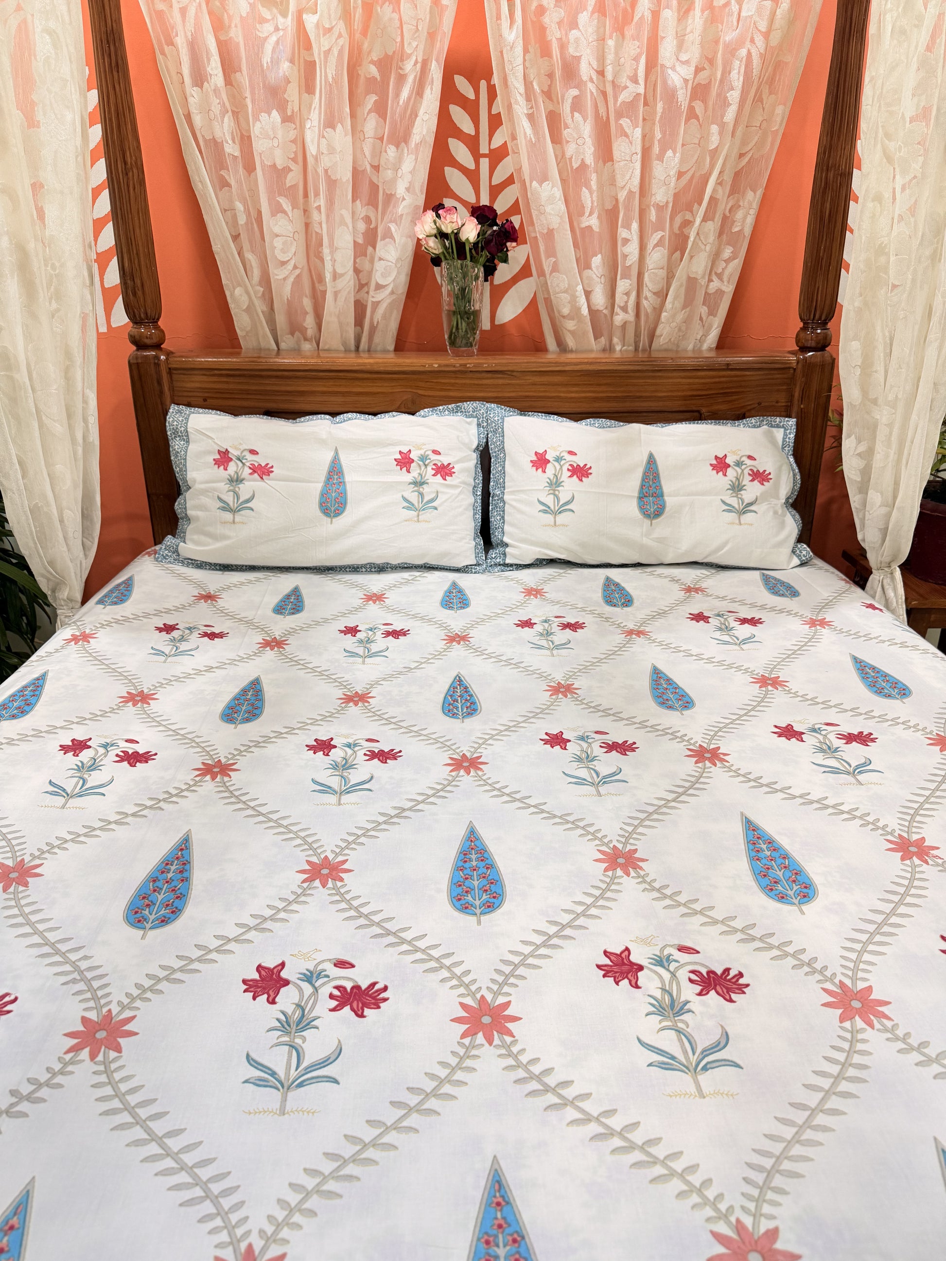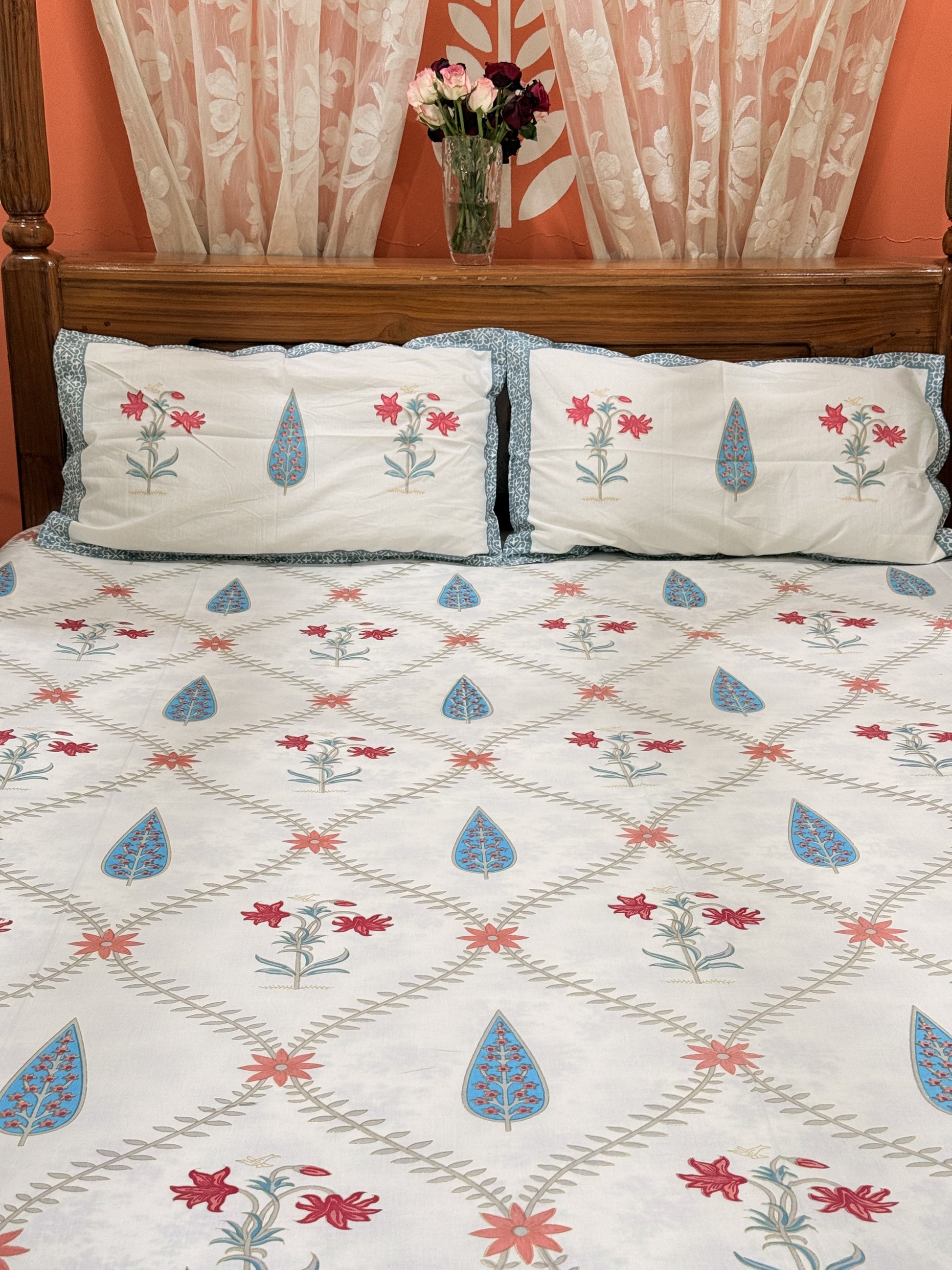White and Blue Leaf Cotton Double Bed Premium Handblock Bedsheet