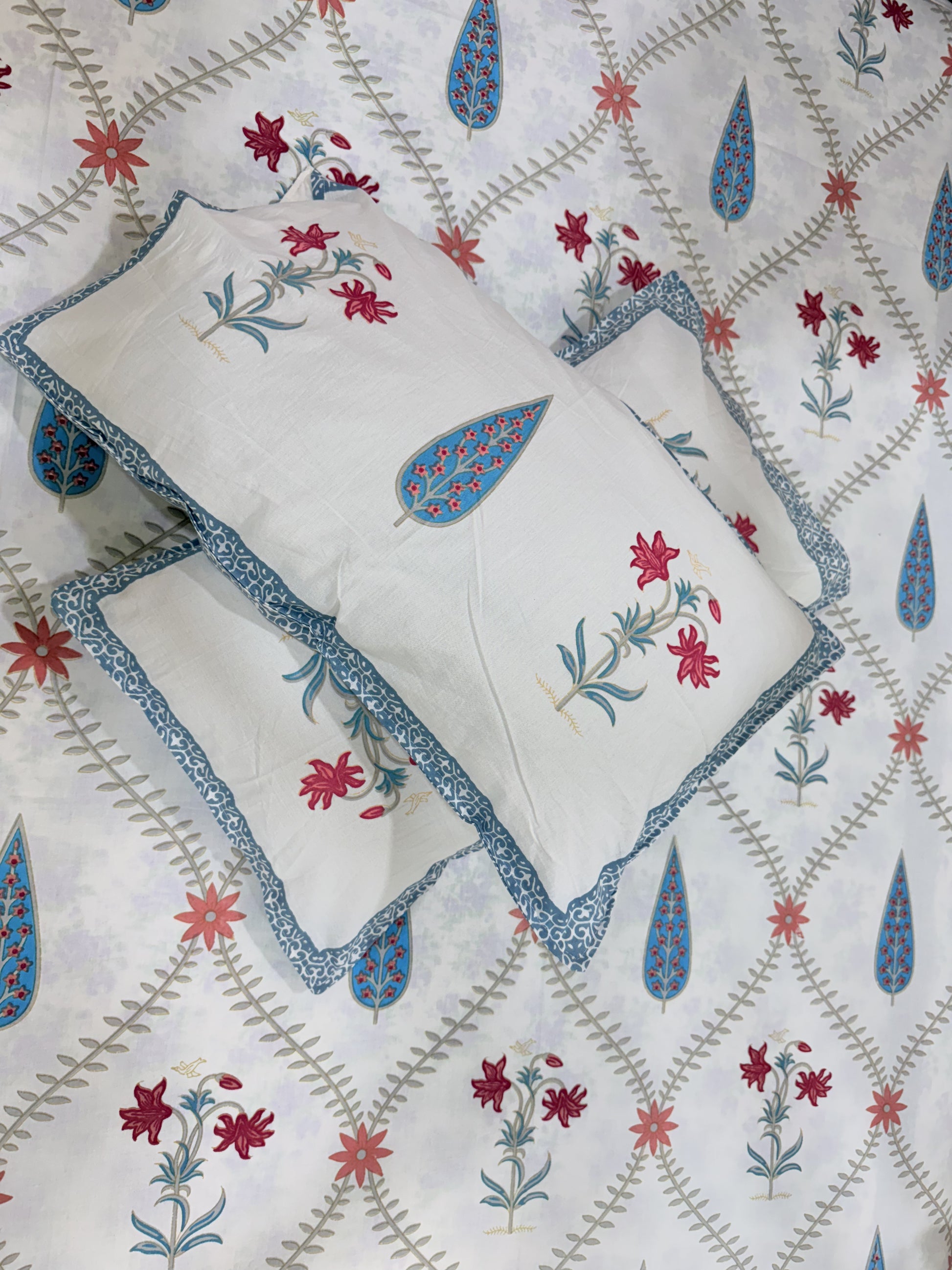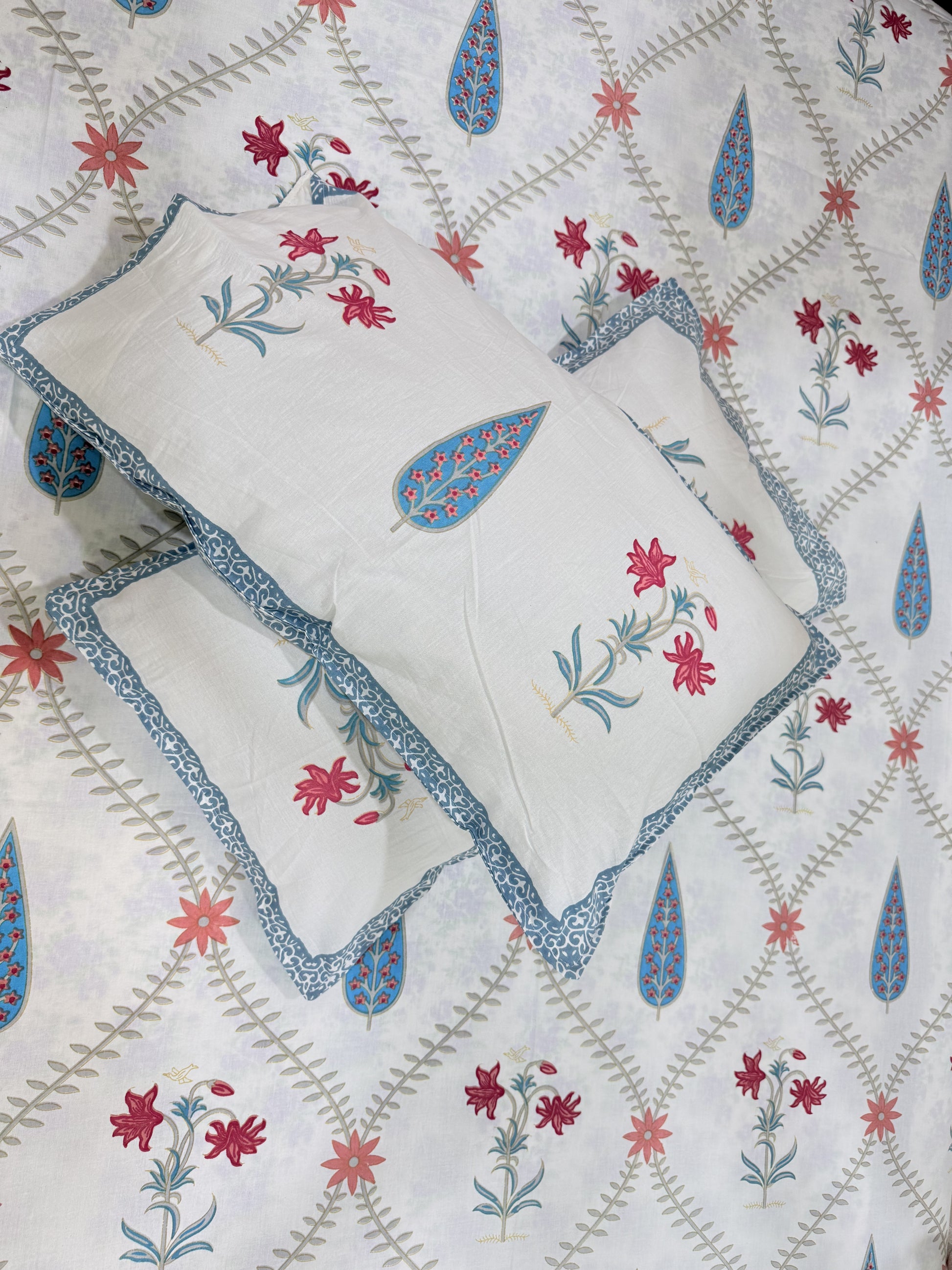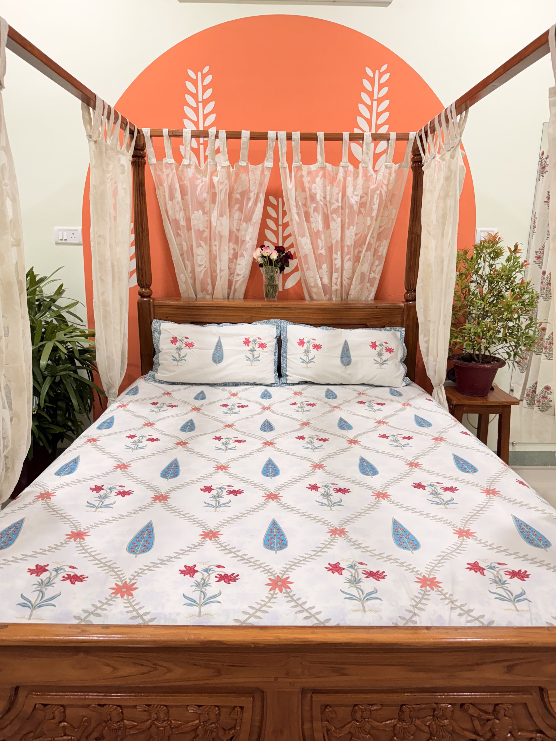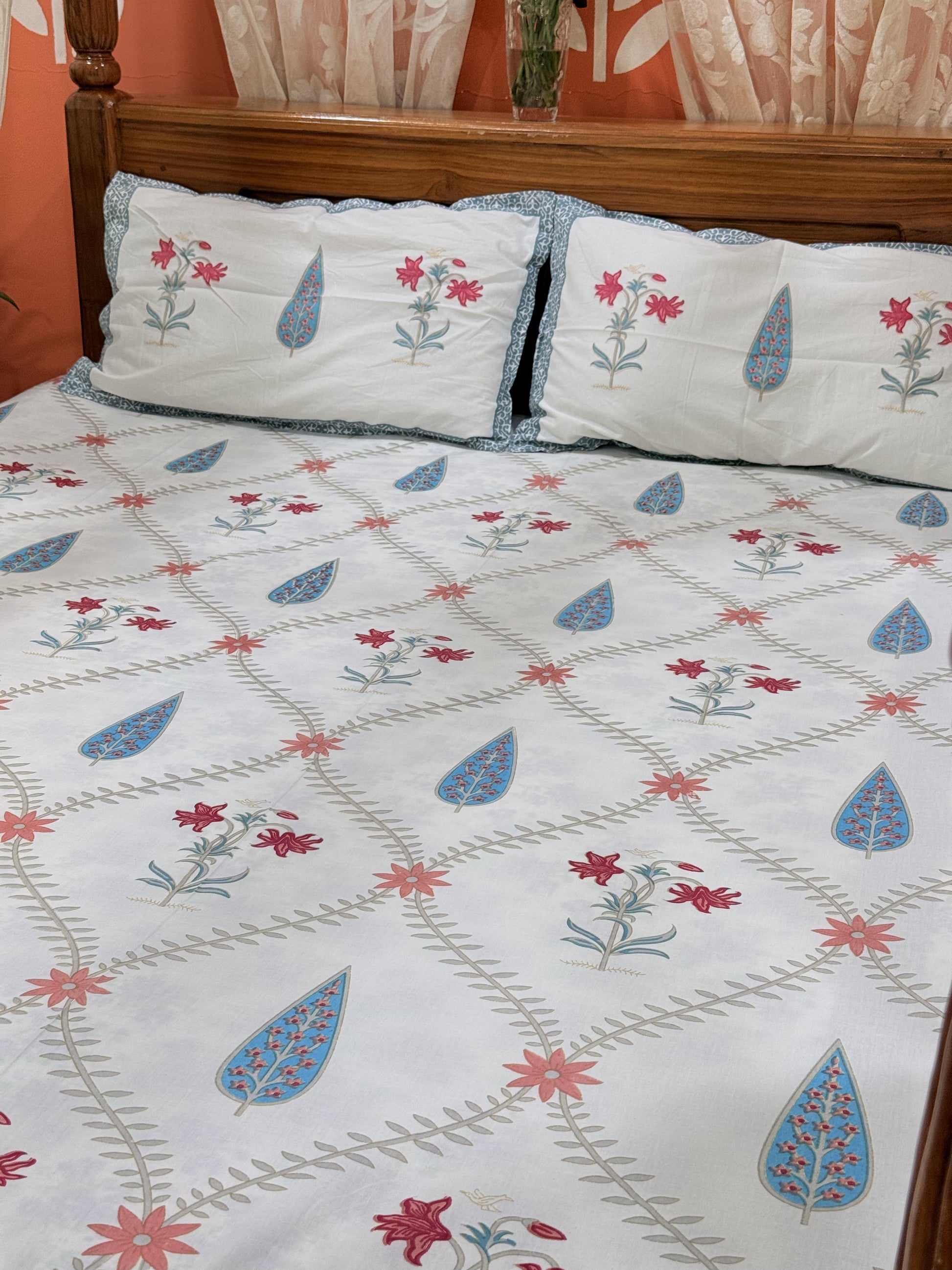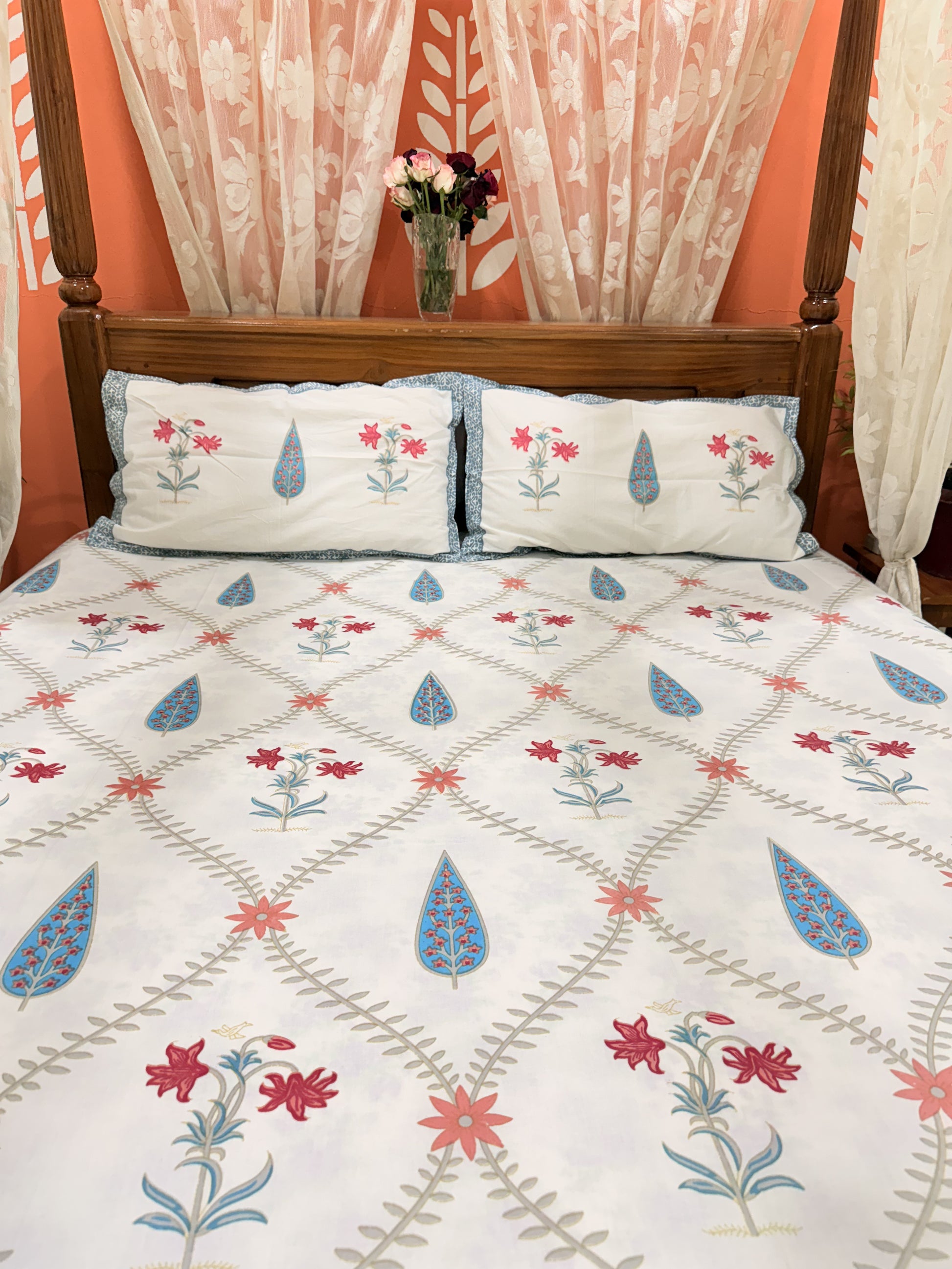 White and Blue Leaf Cotton Double Bed Premium Handblock Bedsheet